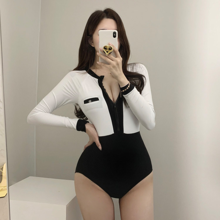 새로운 패션 섹시한 긴팔 흑백 대비 색상 태양 보호 삼각형 원피스 요정 스타일 온천 해변 캐주얼 수영복스토어 가기