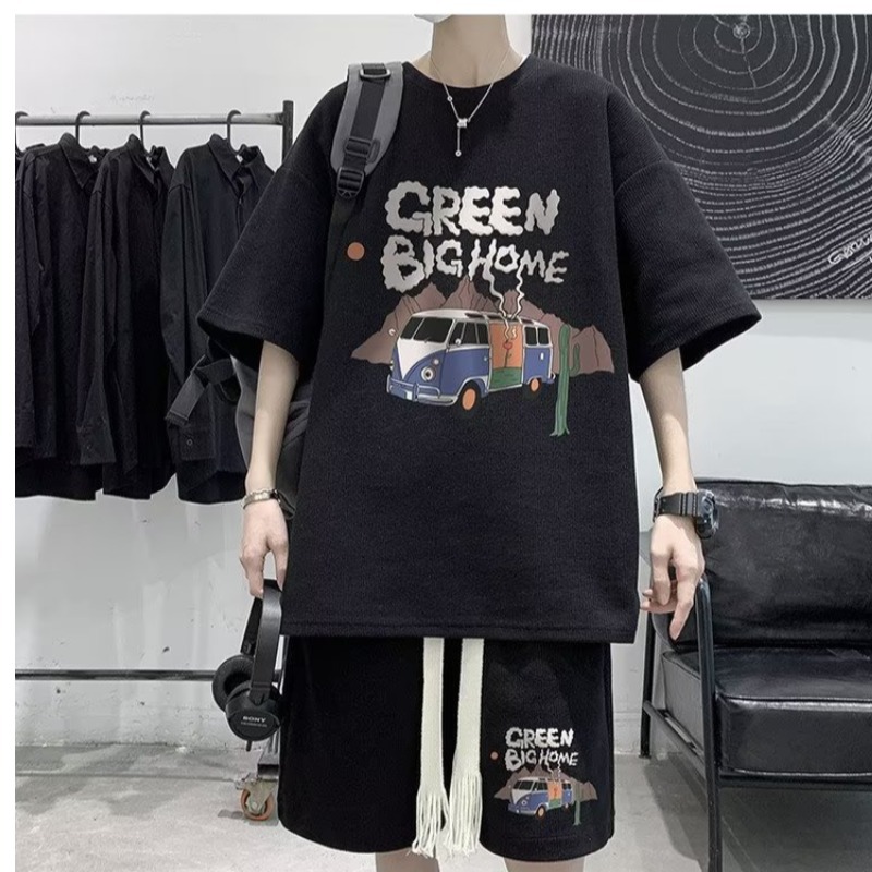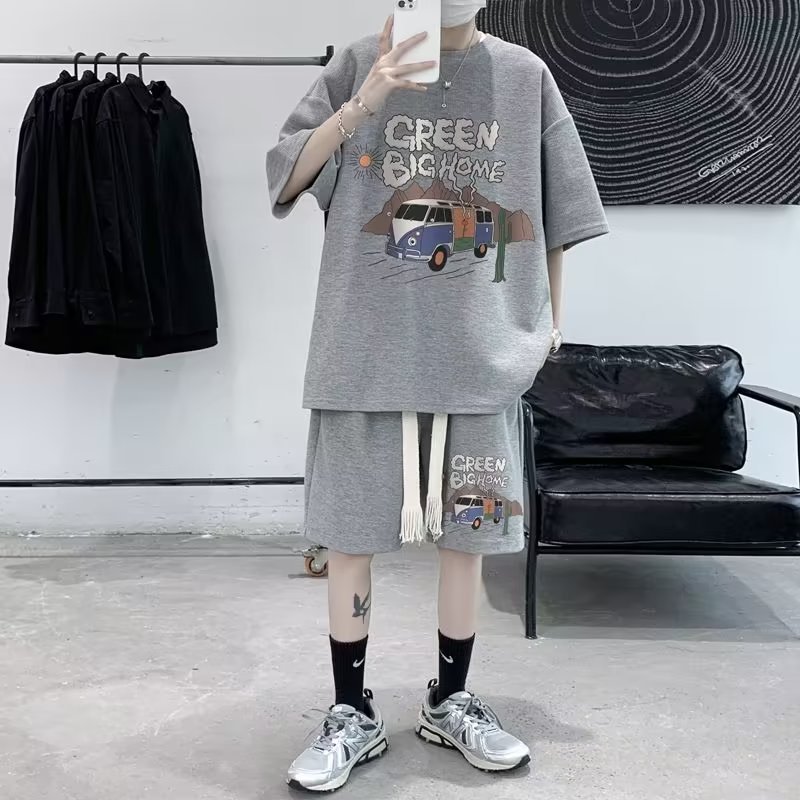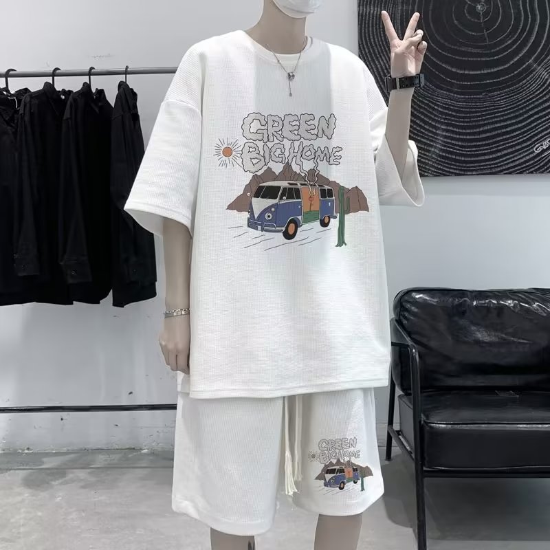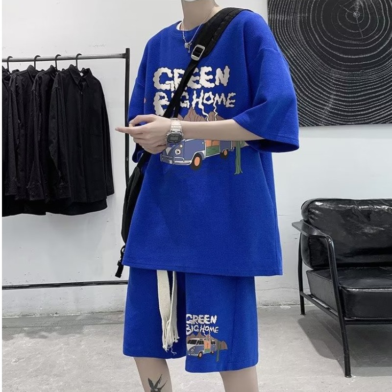 클라인 블루 와플 농구 스포츠 세트 남자의 여름 느슨한 패션 브랜드 반팔 반바지 캐주얼 투피스 세트스토어 가기