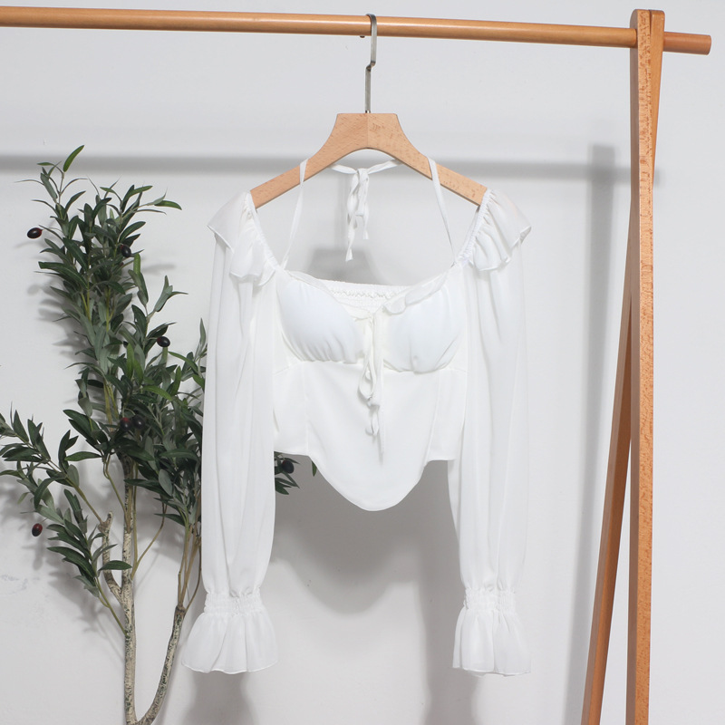 핫 소녀 원 숄더 홀터넥 넥 레이스 업 긴팔 쉬폰 셔츠 곰팡이 트림 백리스 셔츠 가슴 패드가있는 짧은 탑 8873