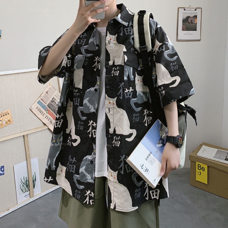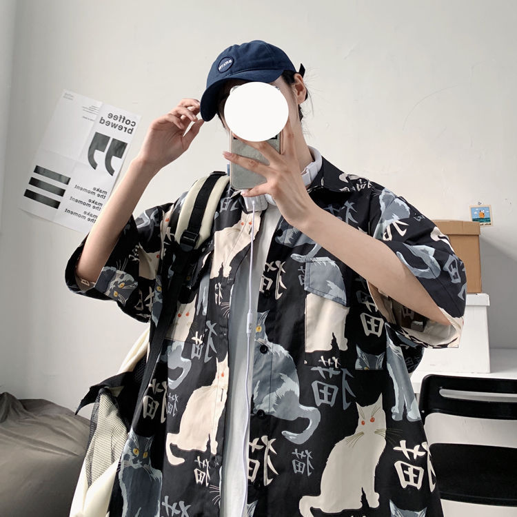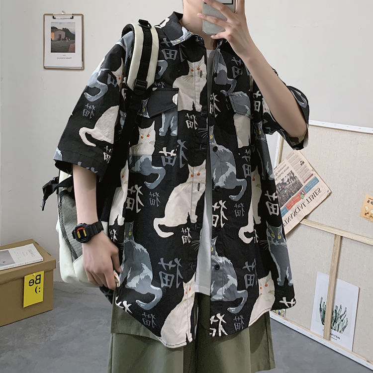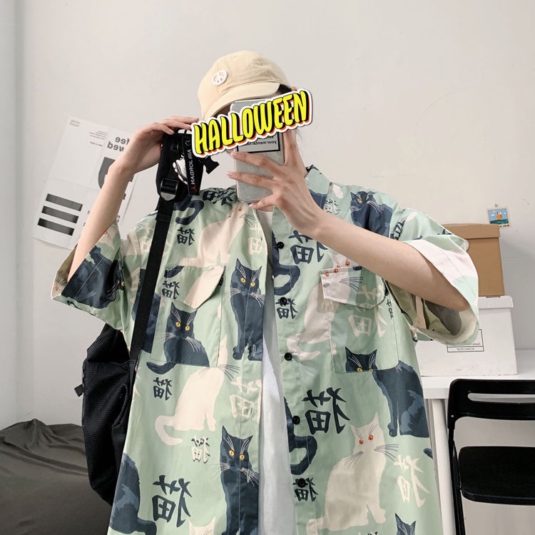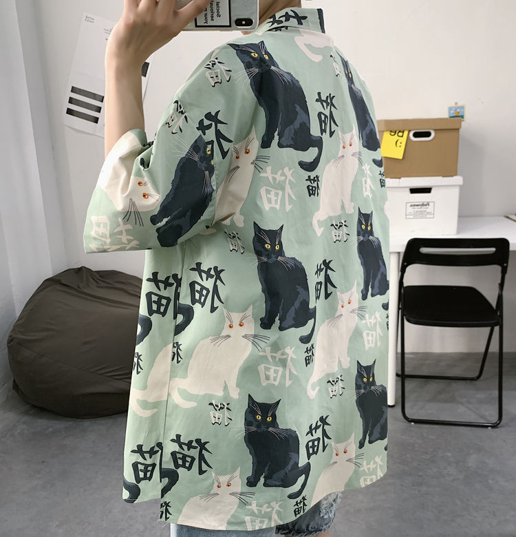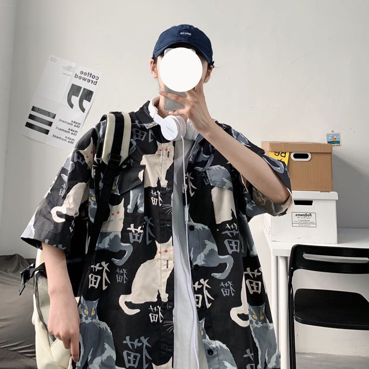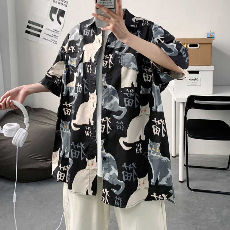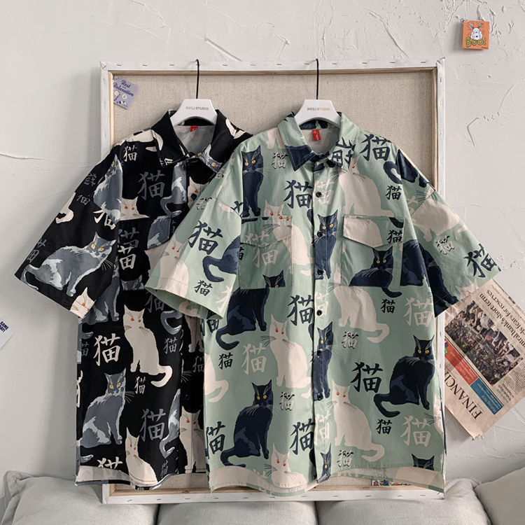 여름 일본식 반팔 셔츠 남성용 반팔 셔츠 홍콩 스타일 트렌디 고양이 프린트 학생 느슨한 캐주얼 셔츠 트렌디스토어 가기