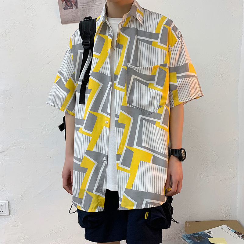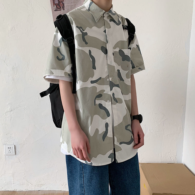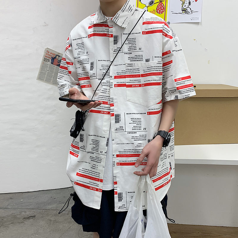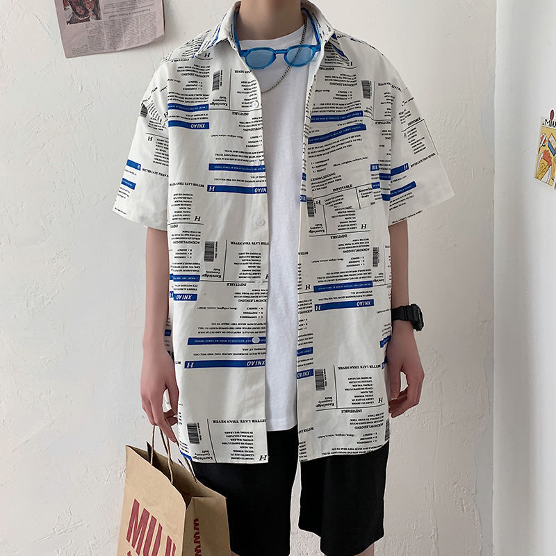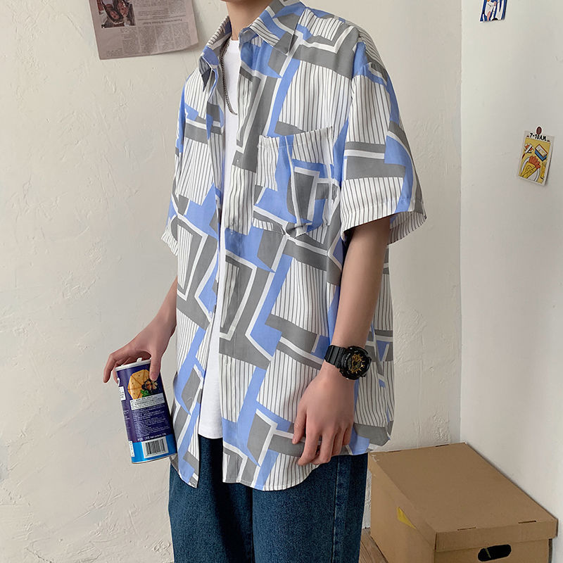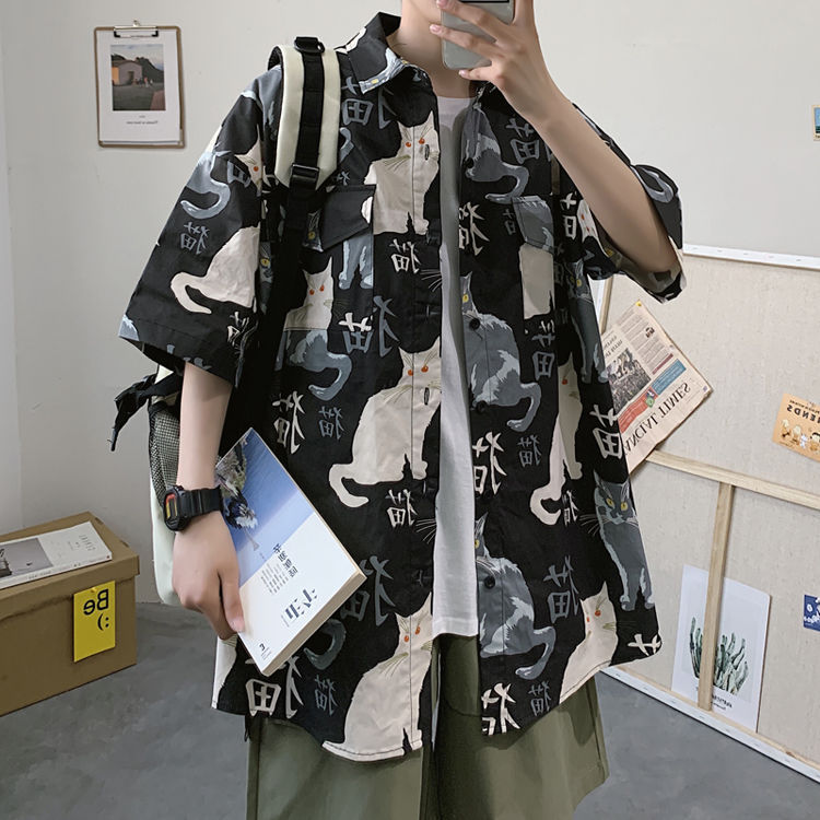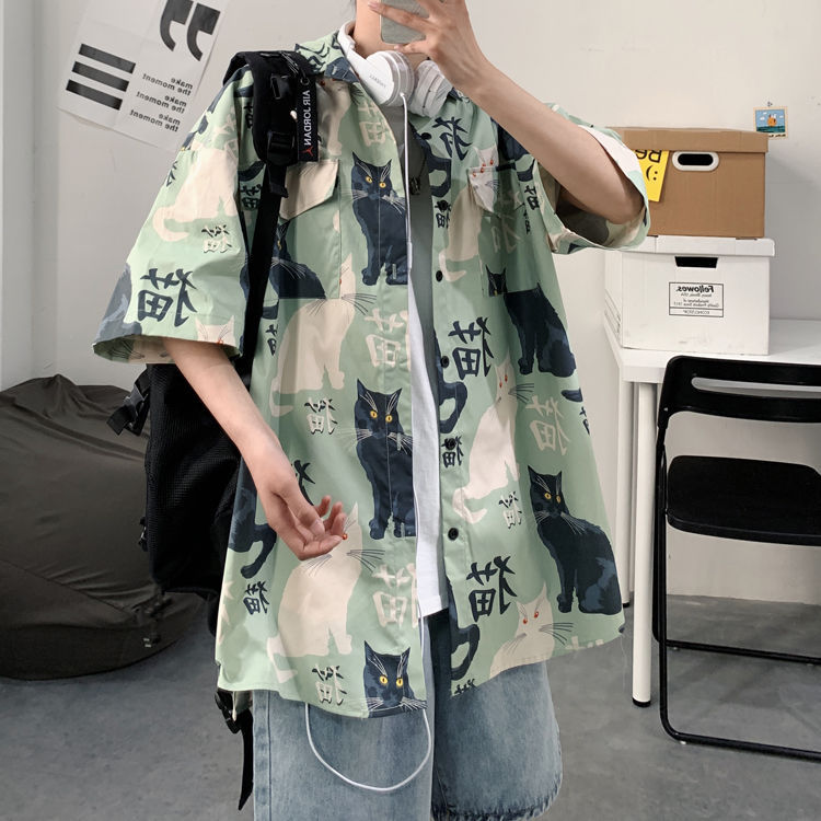 여름 일본식 반팔 셔츠 남성용 반팔 셔츠 홍콩 스타일 트렌디 고양이 프린트 학생 느슨한 캐주얼 셔츠 트렌디