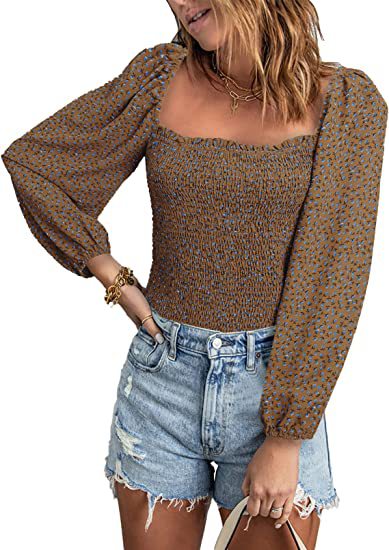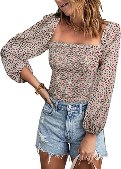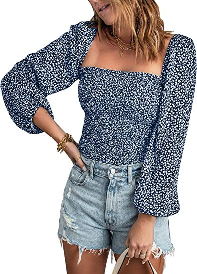 유럽과 미국 스퀘어 칼라 긴팔 슬림 티셔츠 여성용 아마존 봄 새로운 슬림핏 탑스토어 가기