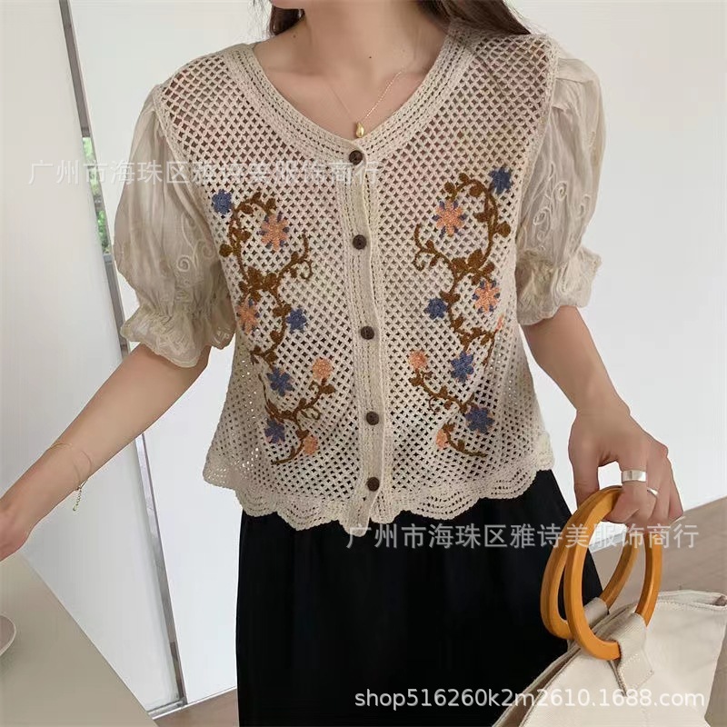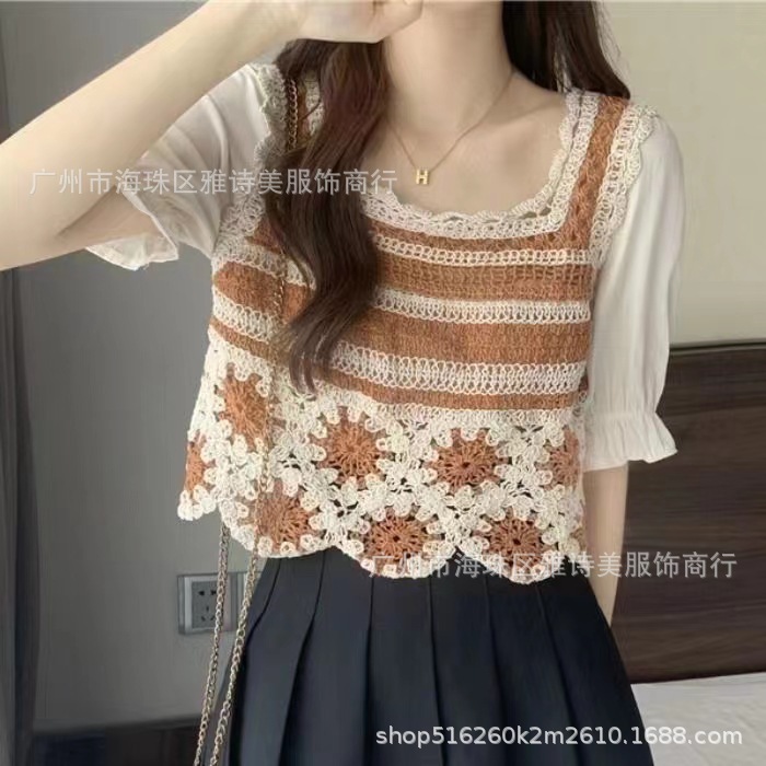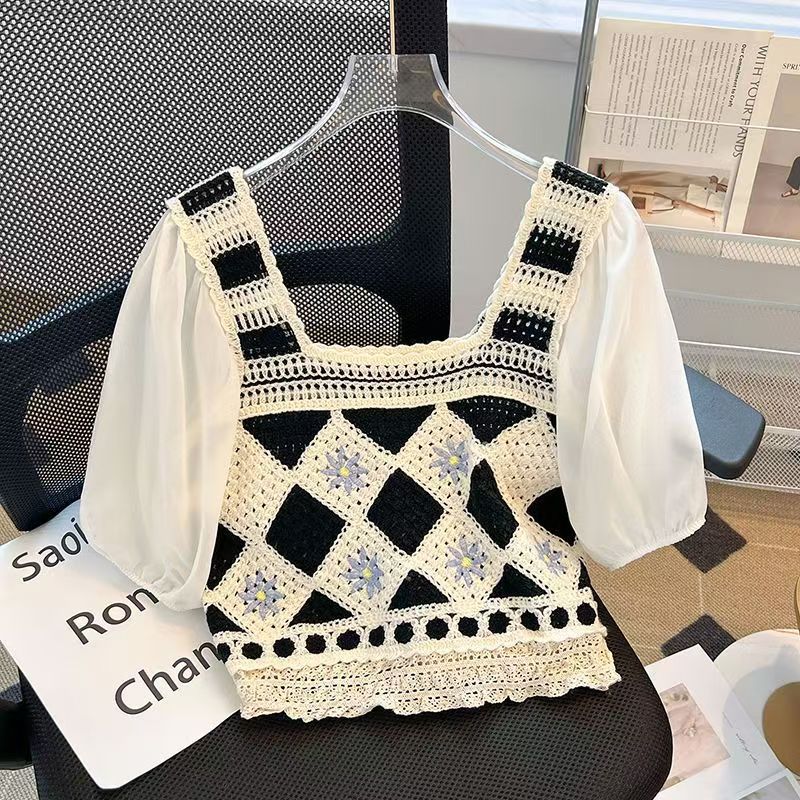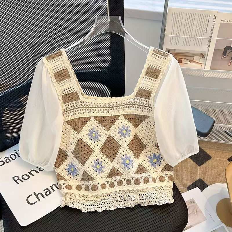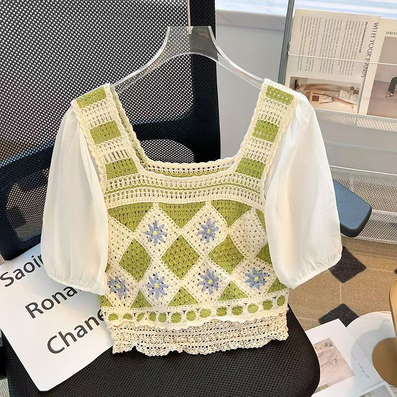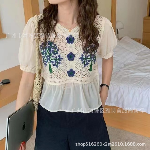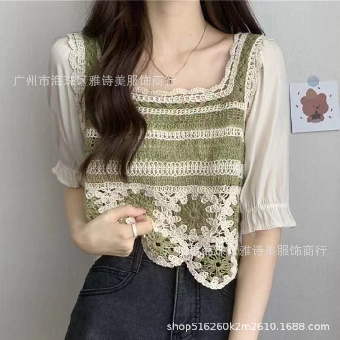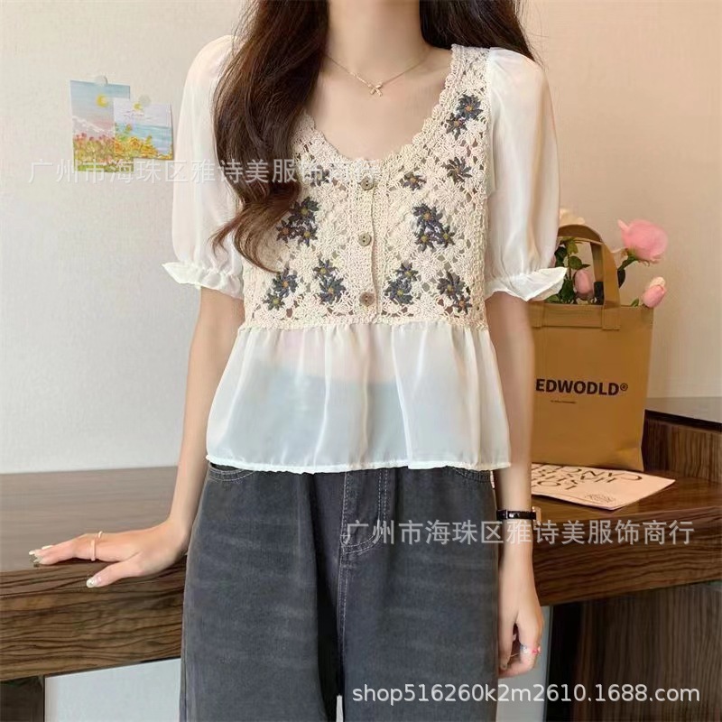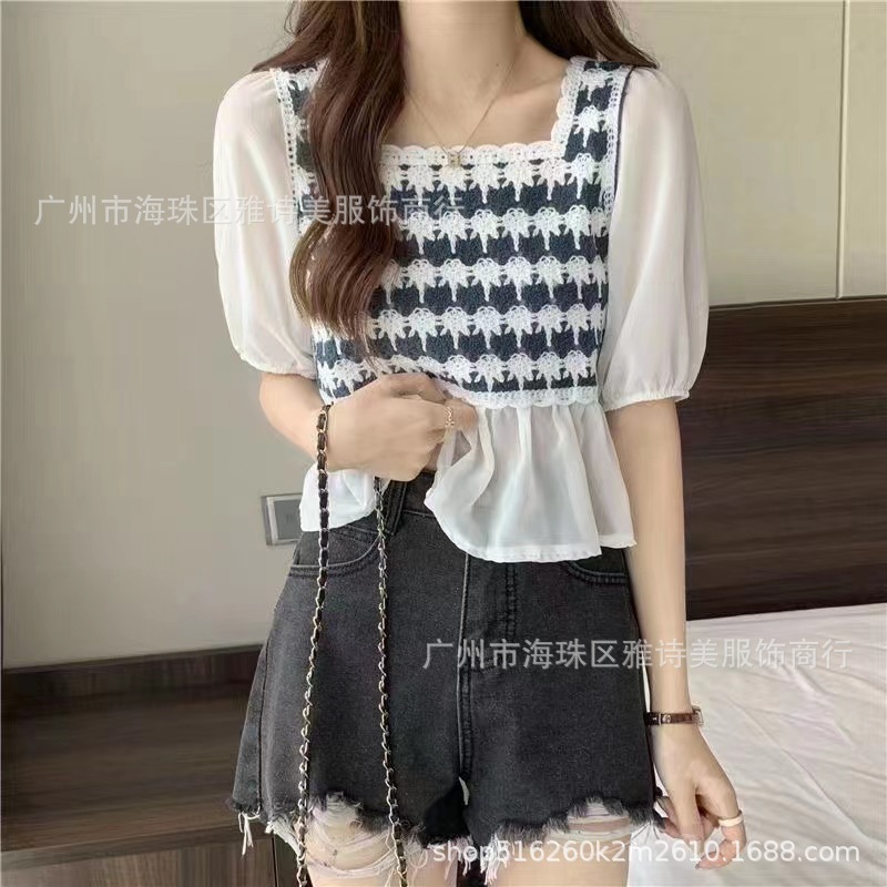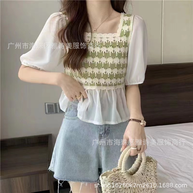 프랑스 스타일 부드러운 쇄골 스퀘어 칼라 얇은 중공 쉬폰 셔츠 여성용 여름 새로운 달콤한 시크 쇼트 탑 트렌디