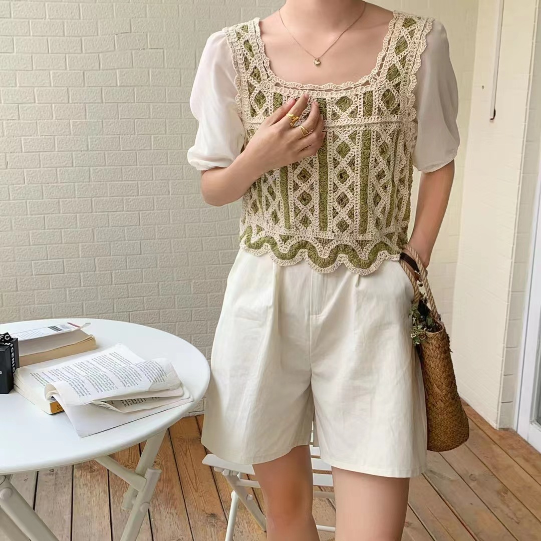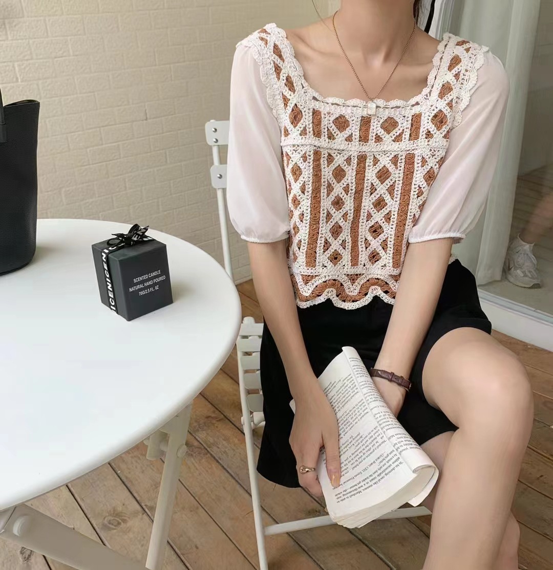 프랑스 스타일 부드러운 쇄골 스퀘어 칼라 얇은 중공 쉬폰 셔츠 여성용 여름 새로운 달콤한 시크 쇼트 탑 트렌디스토어 가기