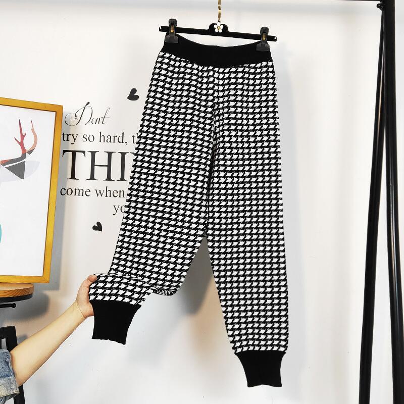 흑백 격자 무늬 바지 여성 바지 가을과 겨울 두꺼운 하이 웨이스트 드레이핑 느슨한 캐주얼 하렘 바지 니트 번들 바지