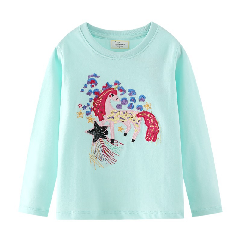 2025 봄, 가을 새로운 스타일의 중소형 여아용 긴팔 티셔츠, 자수 유니콘 베이비 긴팔 아동용 하의 셔츠스토어 가기