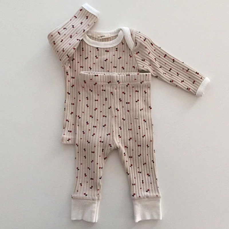 한국 스타일의 가을과 겨울 아기 면 어깨 세트 아기 귀여운 체리 홈 탄성 긴팔 바지 투피스 세트스토어 가기