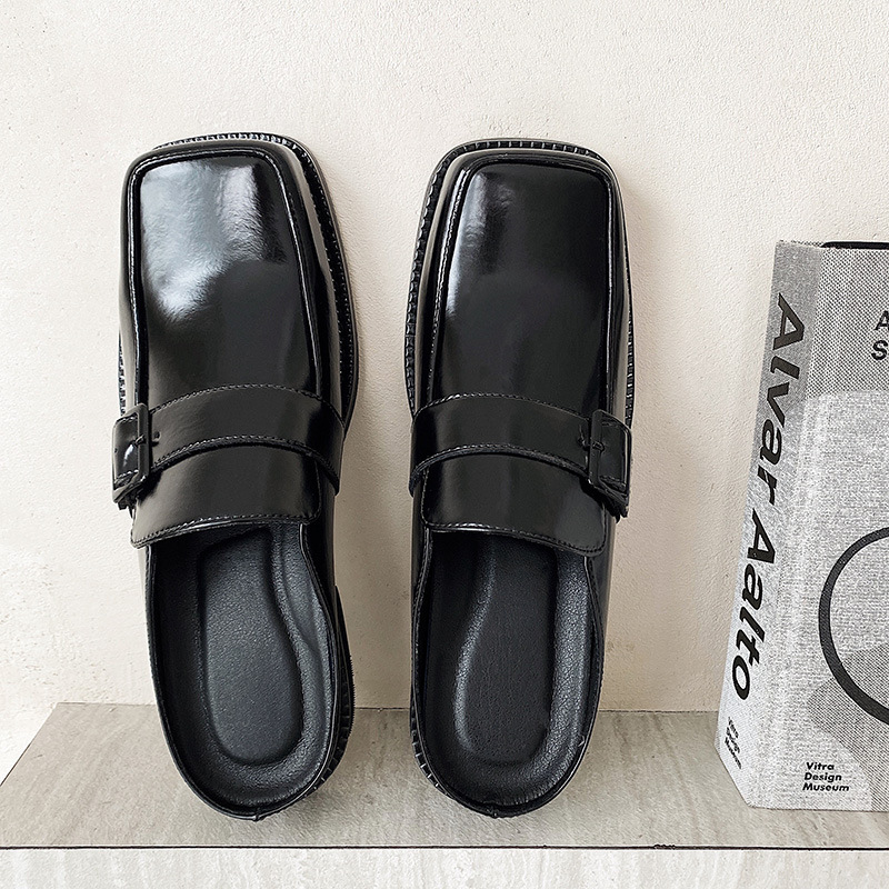 复古搭扣设计包头鞋男黑色韩风套脚小皮鞋2022夏季方头漆皮凉拖鞋