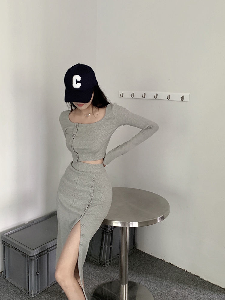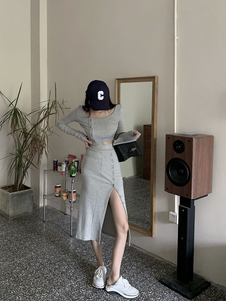 2023 새로운 세트 여성의 스파이스 걸스 배꼽 긴 소매 탑 + 하이 웨이스트 스플릿 하프 힙 스커트 투피스 모든 매치 세트스토어 가기