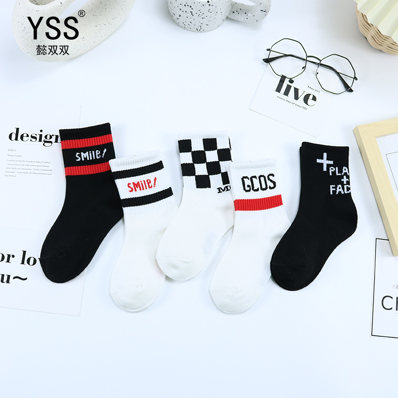 어린이 더블 페어 양말 가을과 겨울 새로운 한국식 문자 중간 종아리 길이 양말 면화 흑백 스포츠 양말 패션 브랜드 어린이 양말