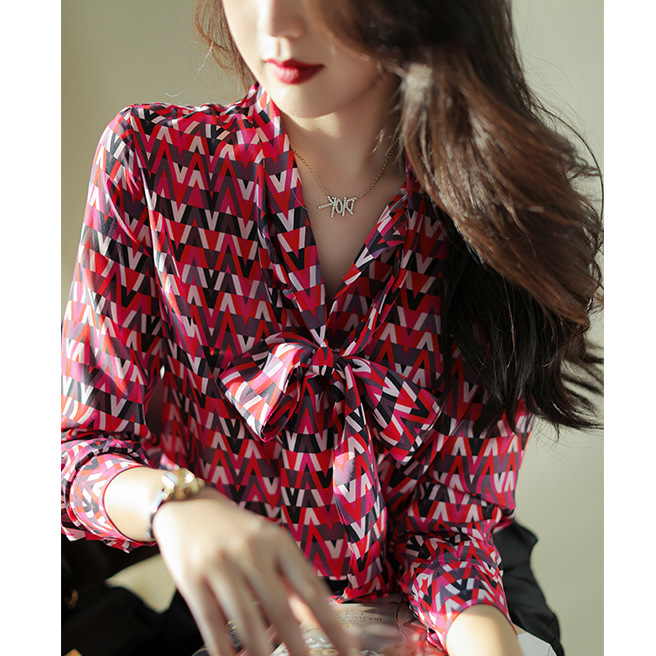 셔츠 여성 긴 소매 가을 2022 새로운 레드 웨스턴 스타일 보우 셔츠 느슨한 봄과 가을 쉬폰 셔츠 탑스토어 가기