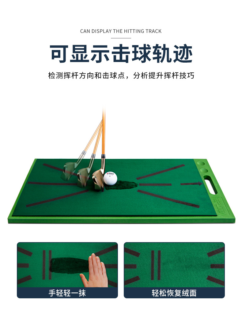 产品介绍 | 1 | 质感天鹅绒面,可显示球轨迹,检测挥杆方向和击球点 | ||