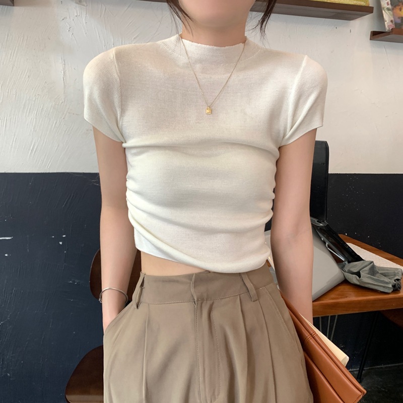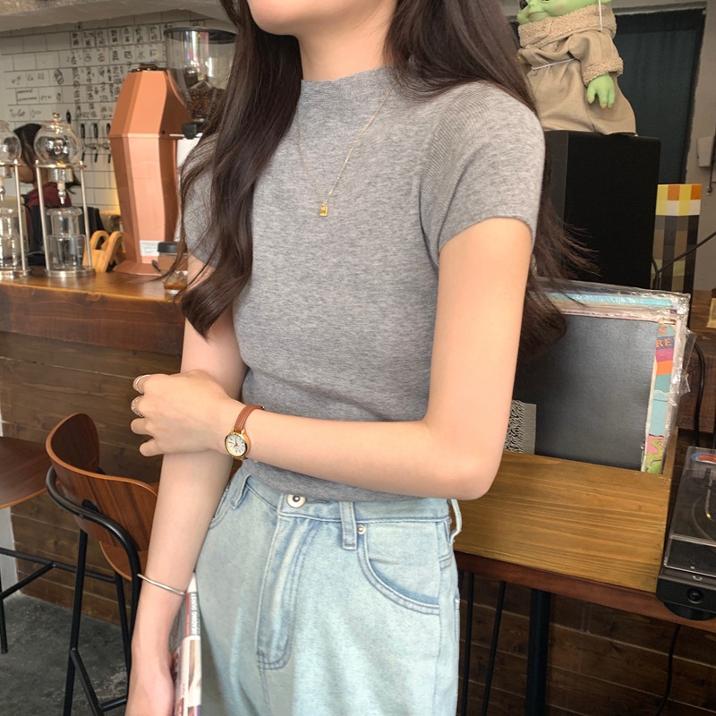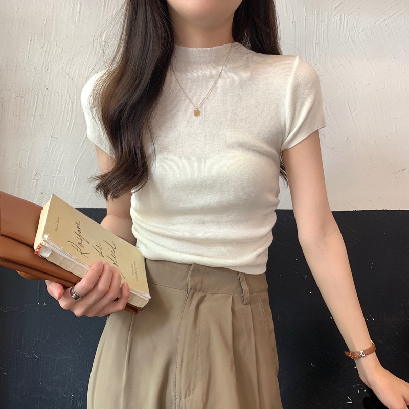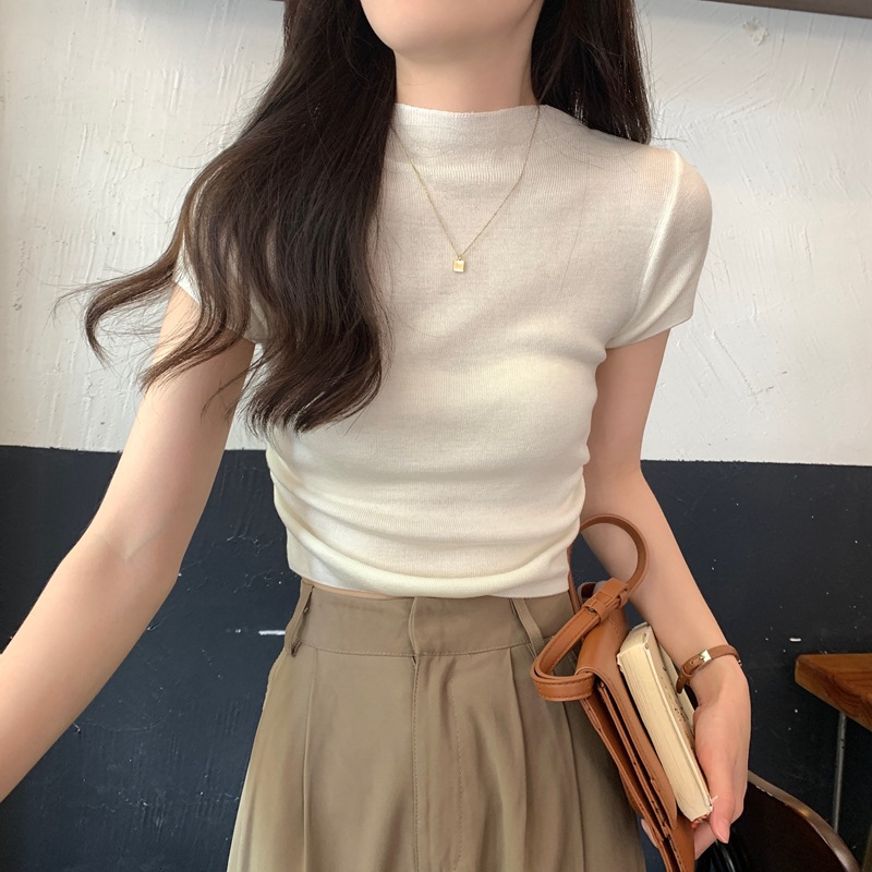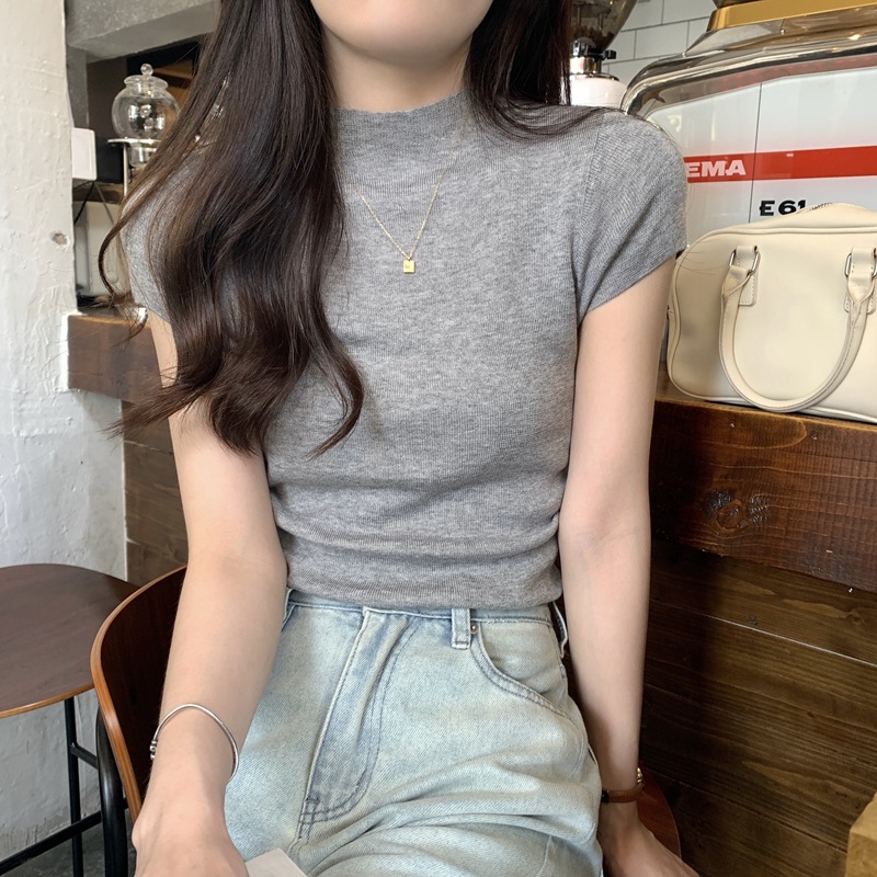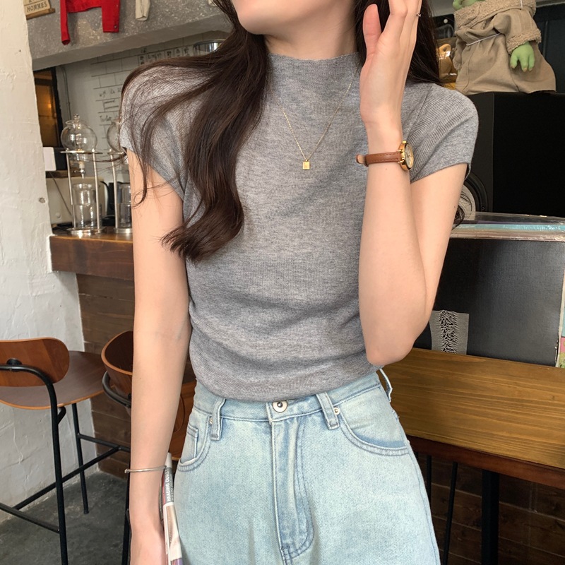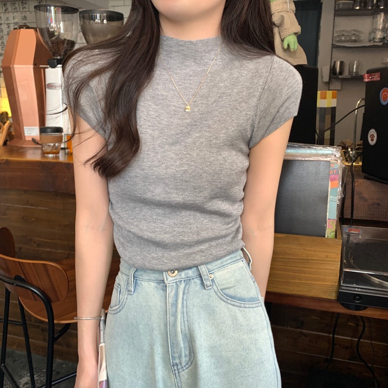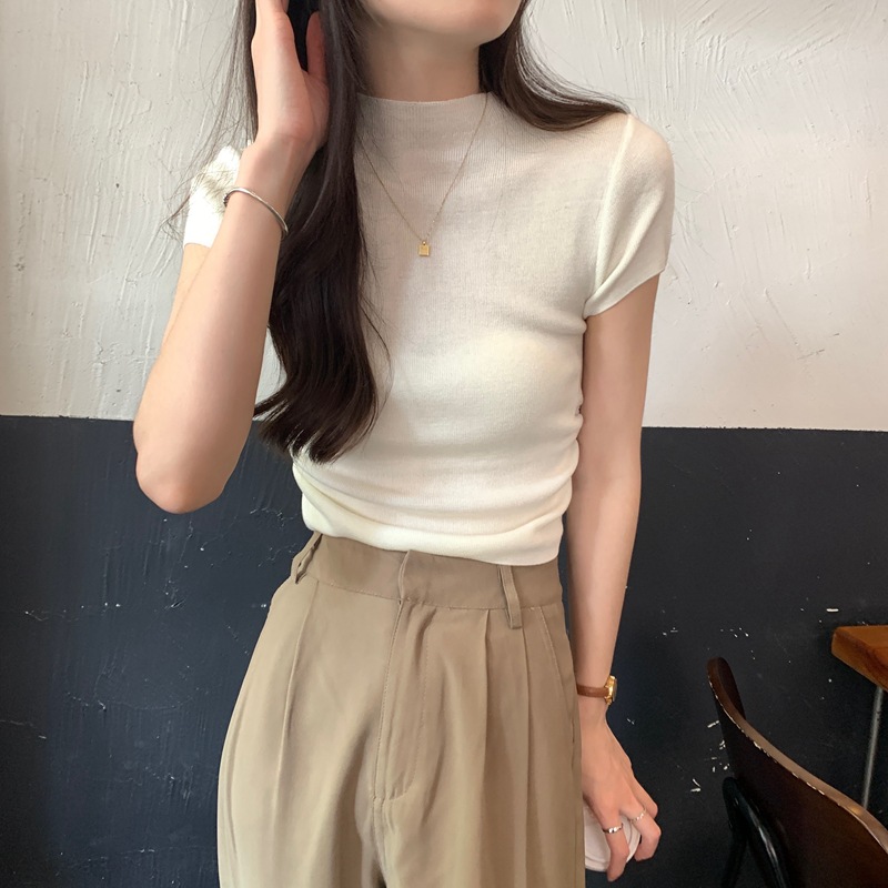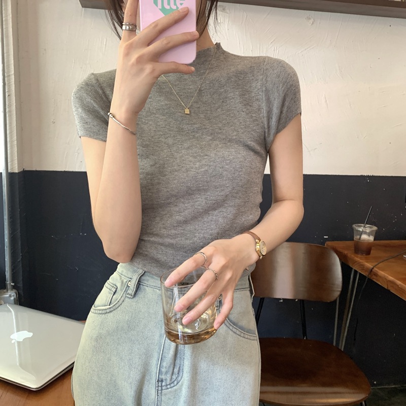리얼 샷 봄 여름 한국 스타일 기질 세미 하이 칼라 디자인 니트 스웨터 슬림핏 슬리밍 반팔 탑 42991