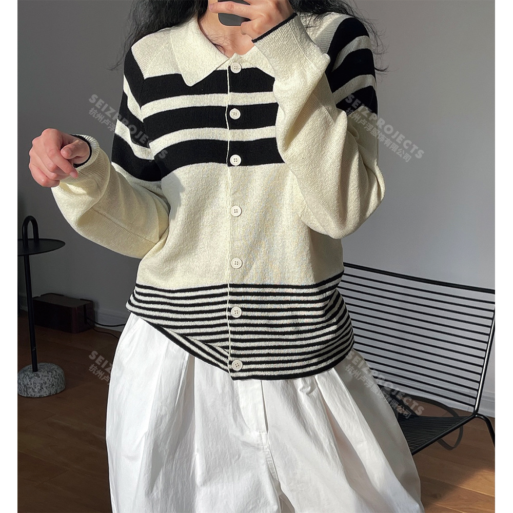 "개인 스타일" 이른 가을 새로운 빈티지 POLO 칼라 스트라이프 니트 카디건 느슨한 슬리밍 작은 여성 탑