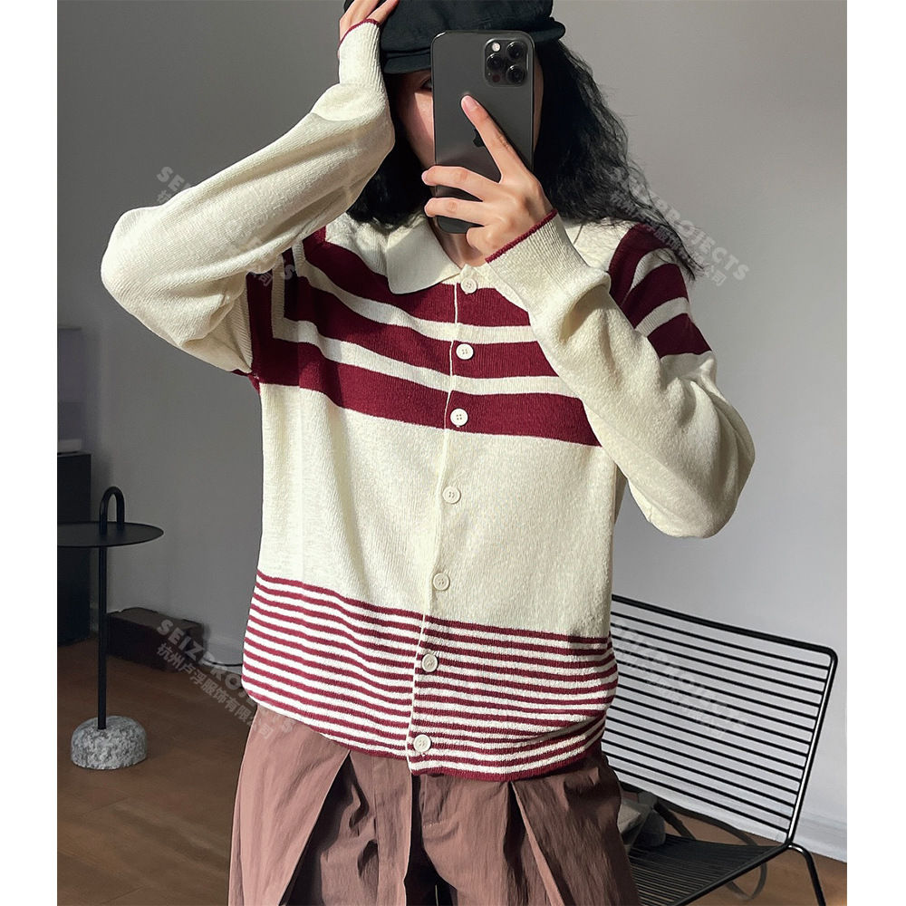 루프르 초가을 신상 레트로 폴로 칼라 스트라이프 니트 가디건 루즈핏 슬림핏 여성용 상의