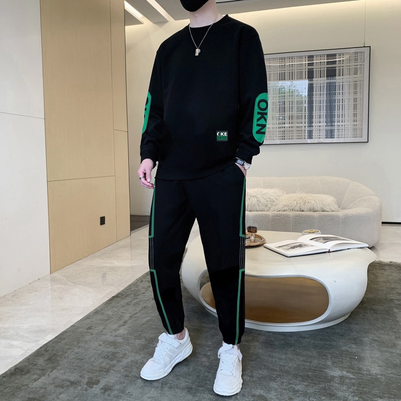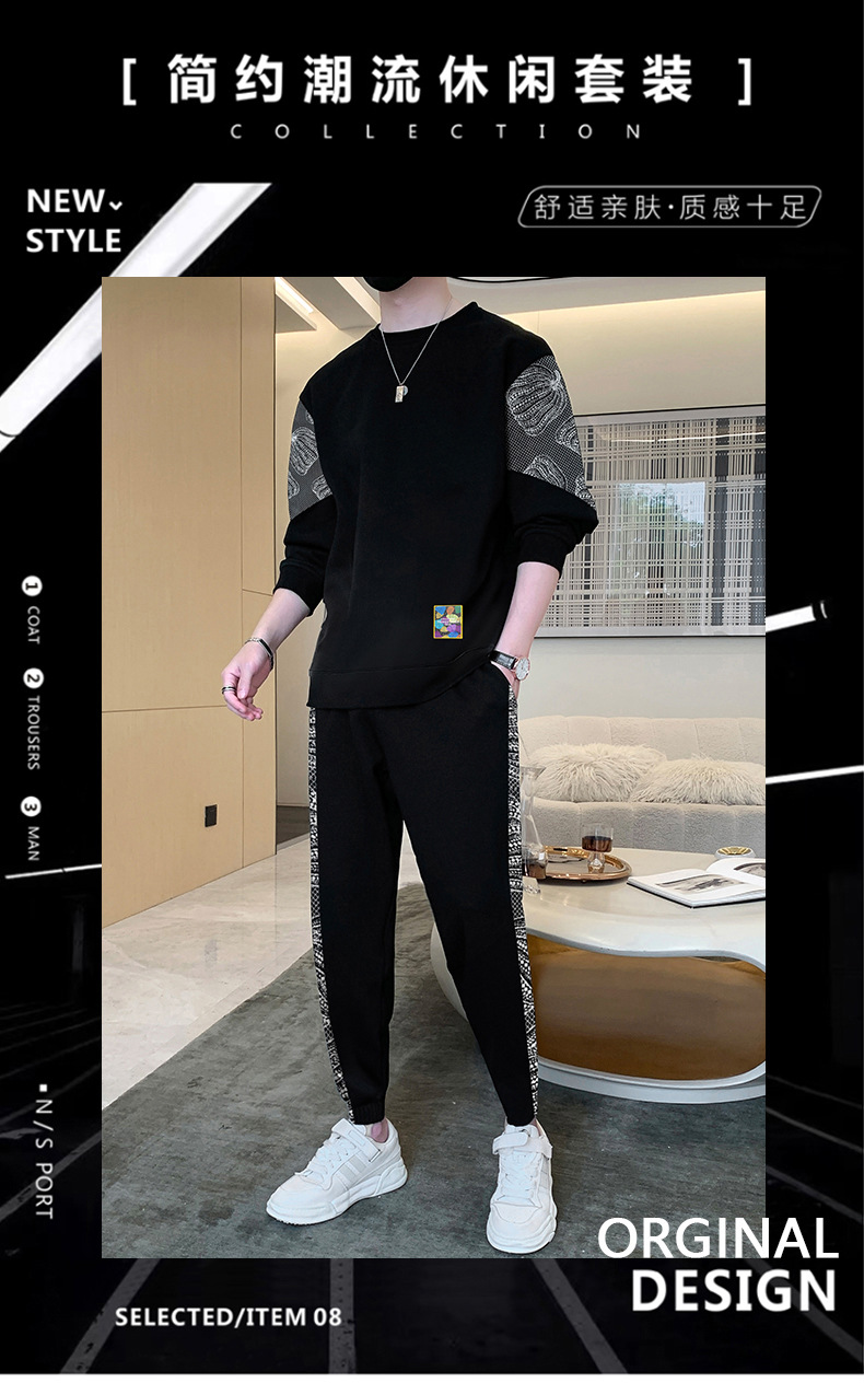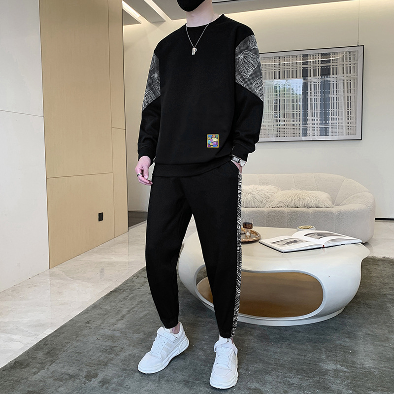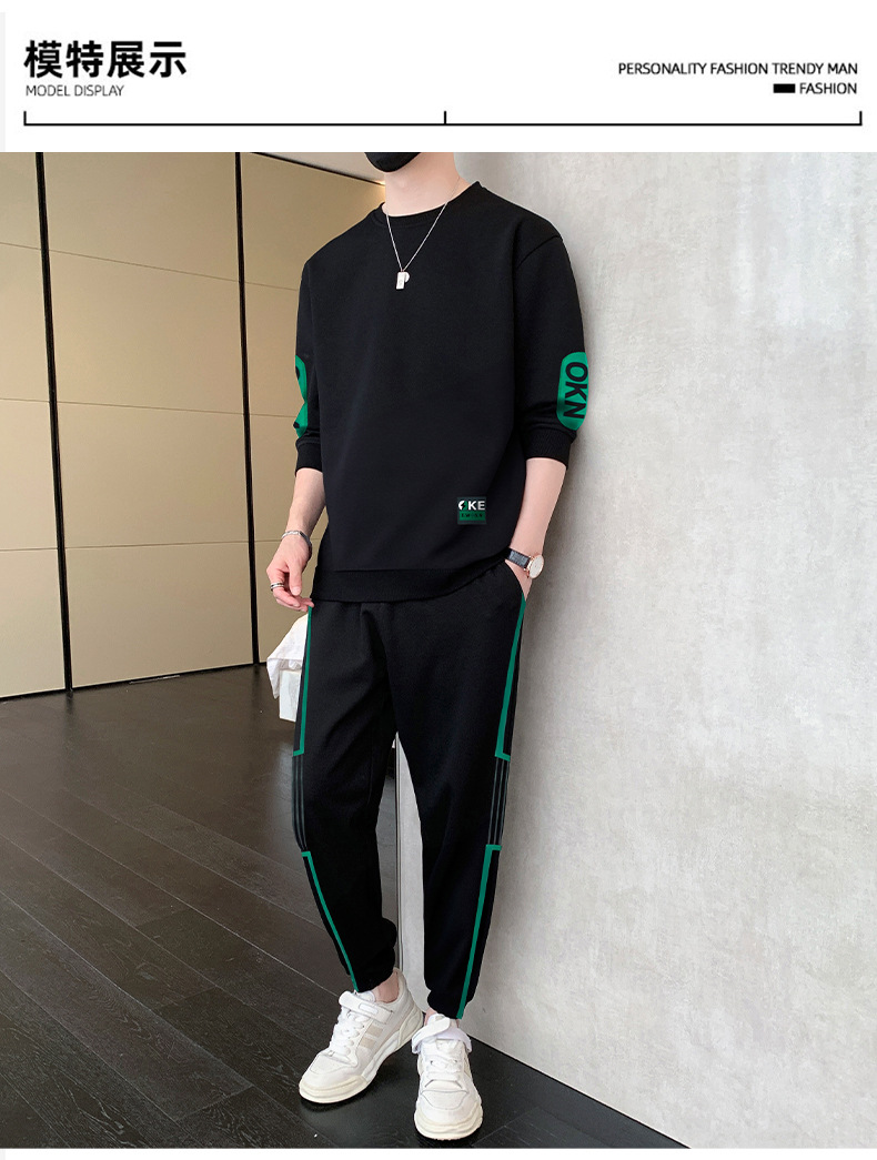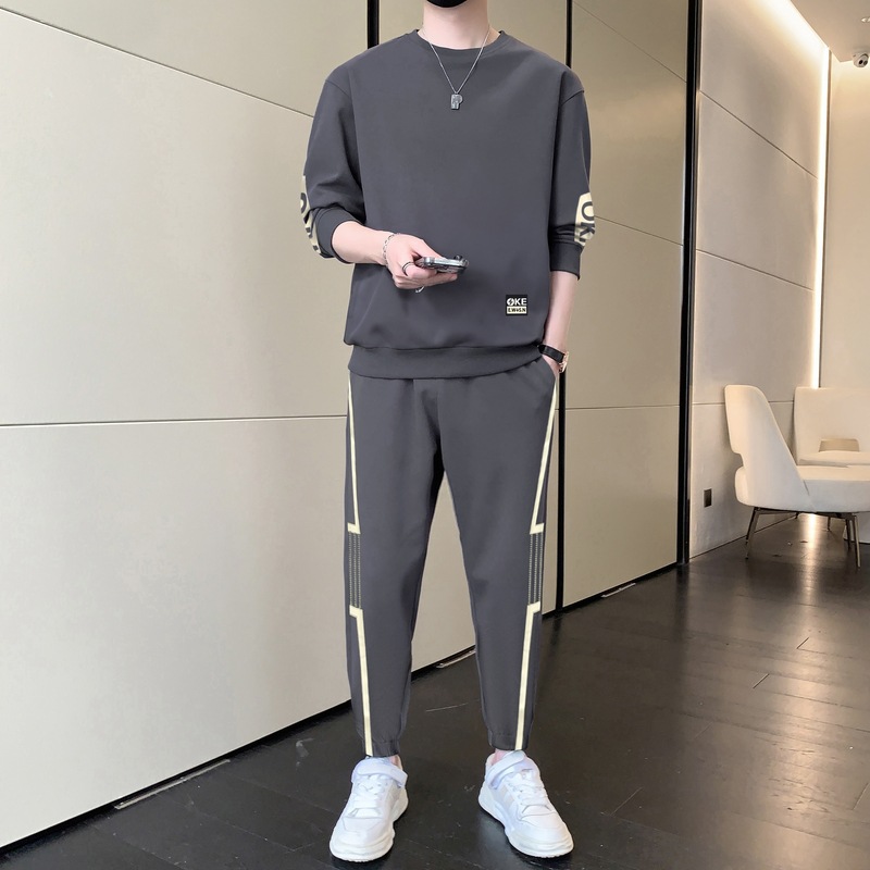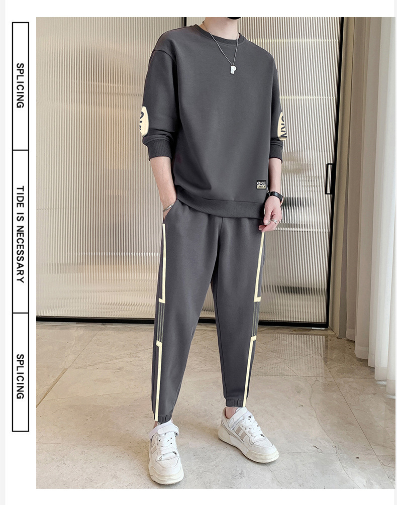 남성 캐주얼 스포츠 정장 봄, 가을 2024년 새로운 홍콩 스타일 라운드 넥 스웨트셔츠와 멋진 남성복