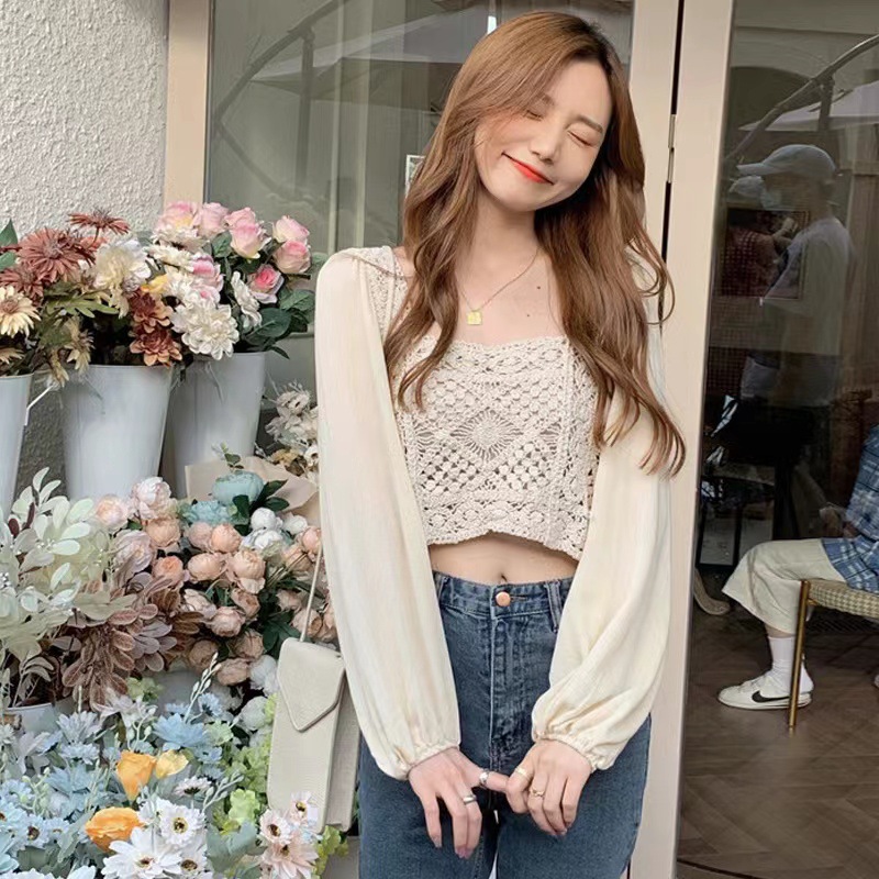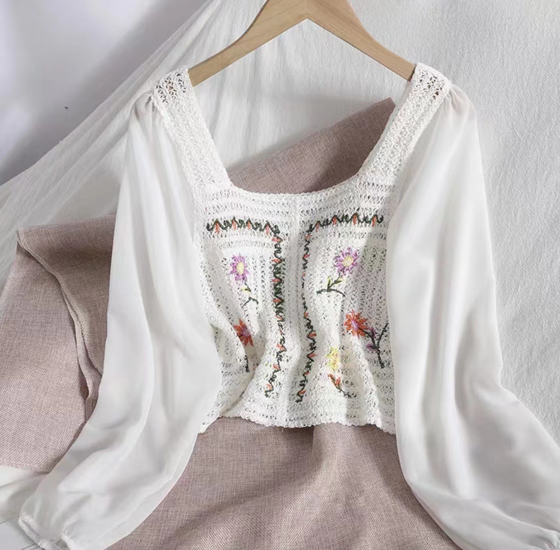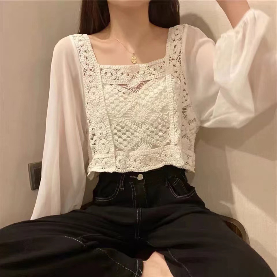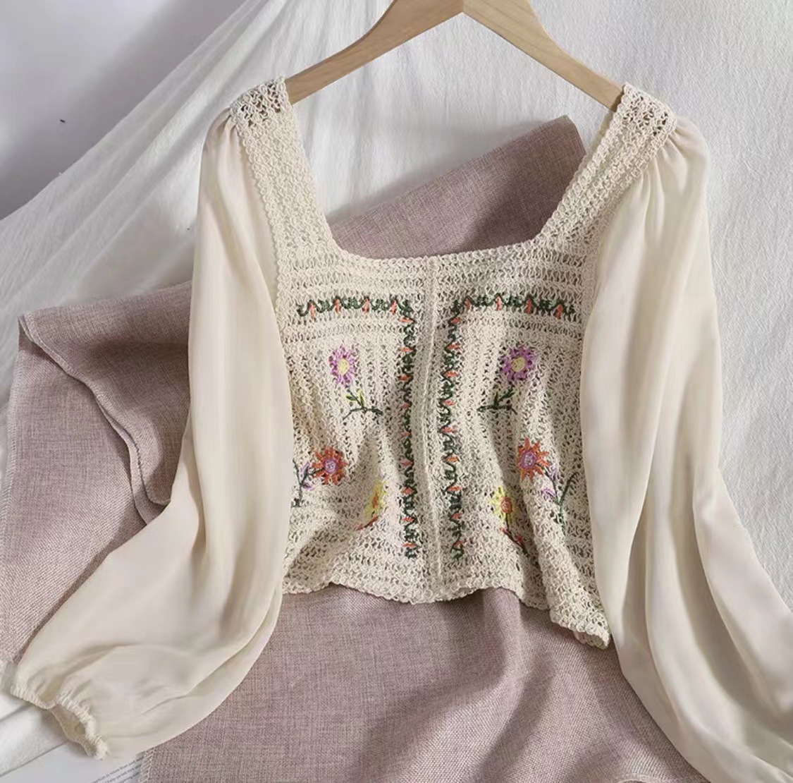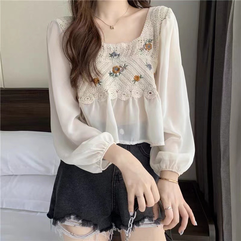 새로운 스타일 스퀘어 칼라 디자인 감각 틈새 쉬폰 셔츠 여성용 우아한 자수 세련된 크로 셰 뜨개질 긴 소매 셔츠 탑 트렌디스토어 가기