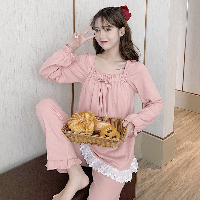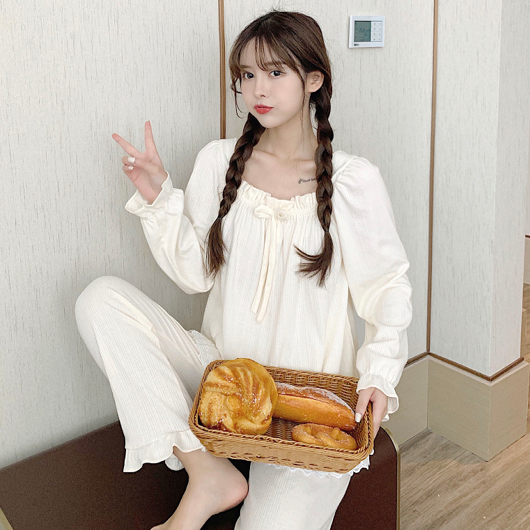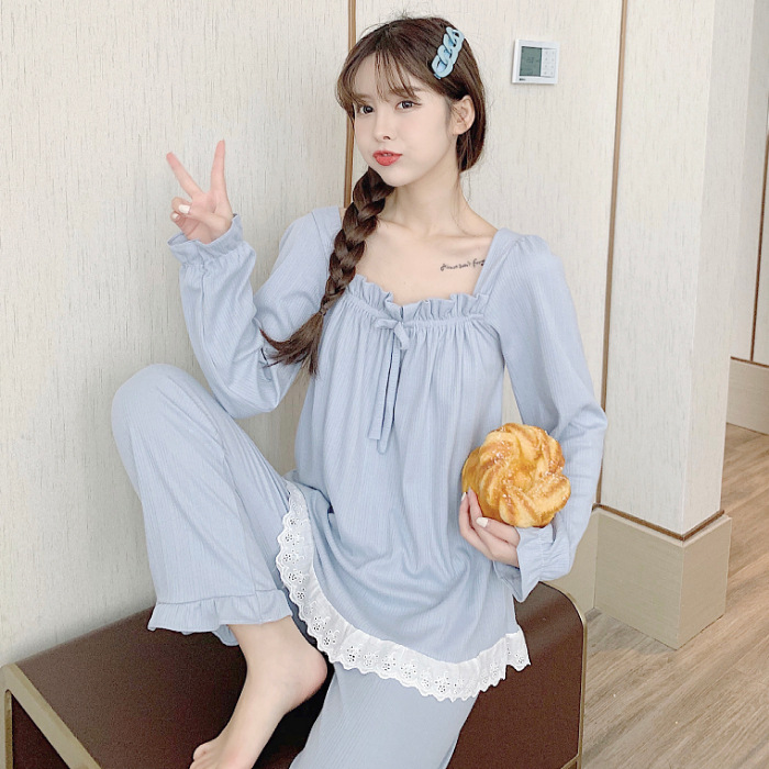 여자의 봄과 가을 새로운 긴 소매 단색 레이스 공주 스타일 간단한 달콤한 가정 옷 세트 겉옷스토어 가기