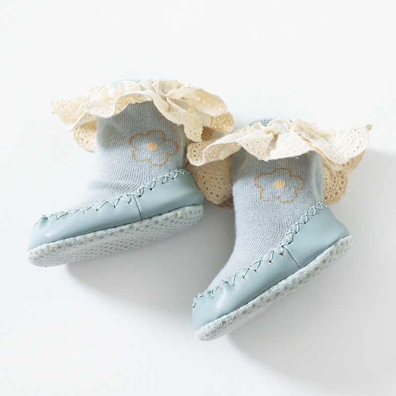 2023 가을과 겨울 가죽 바닥 신발 아기 양말 튜브 미끄럼 방지 한국 레이스 공주 양말 유아 양말 신발