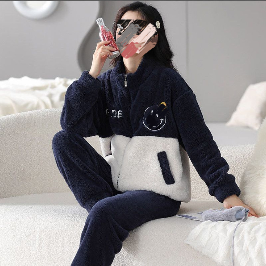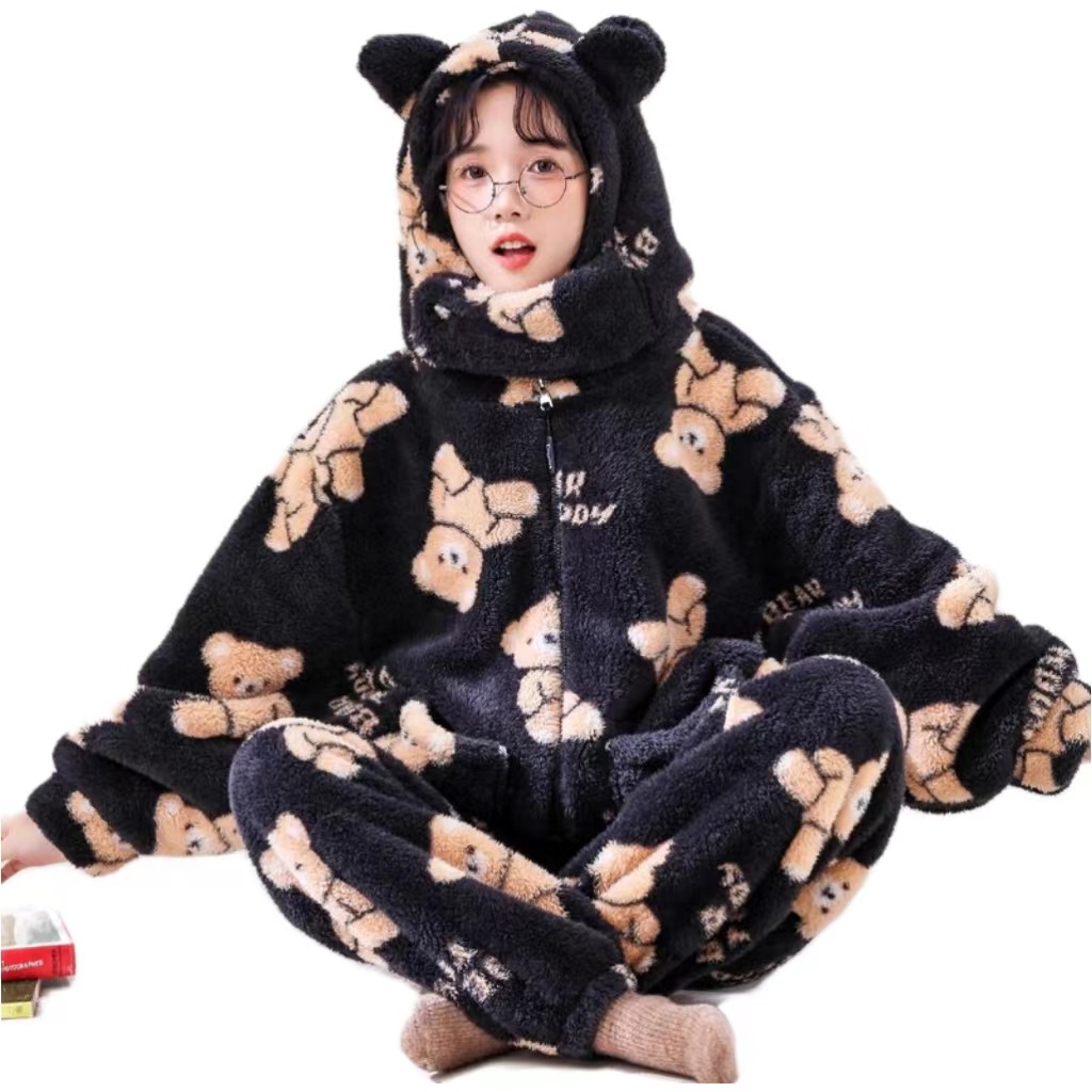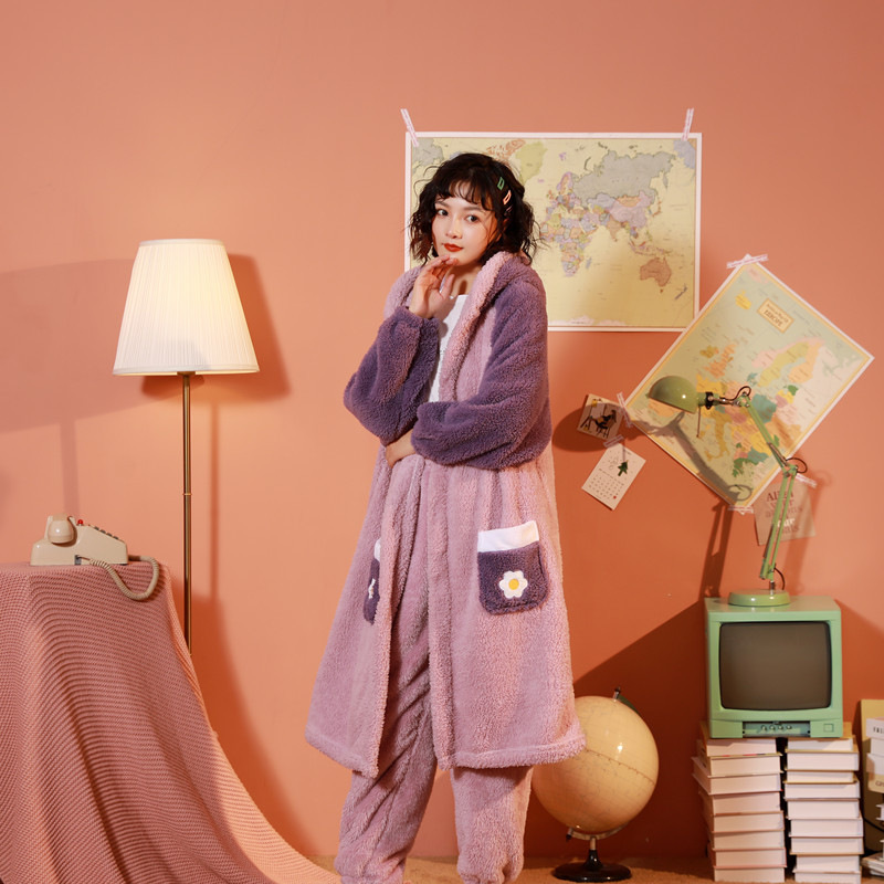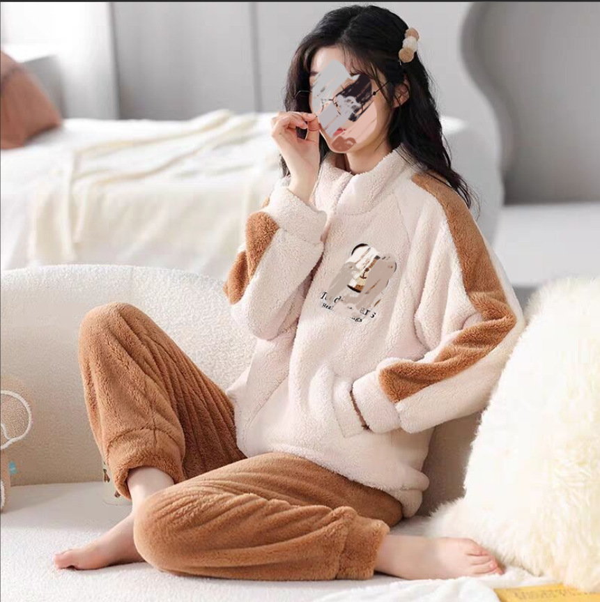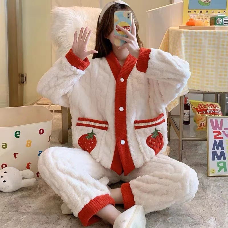 잠옷 여자의 겨울 산호 양털 인터넷 인기 기모 두꺼운 세트 귀여운 복숭아 플란넬 가정 옷 가을과 겨울스토어 가기