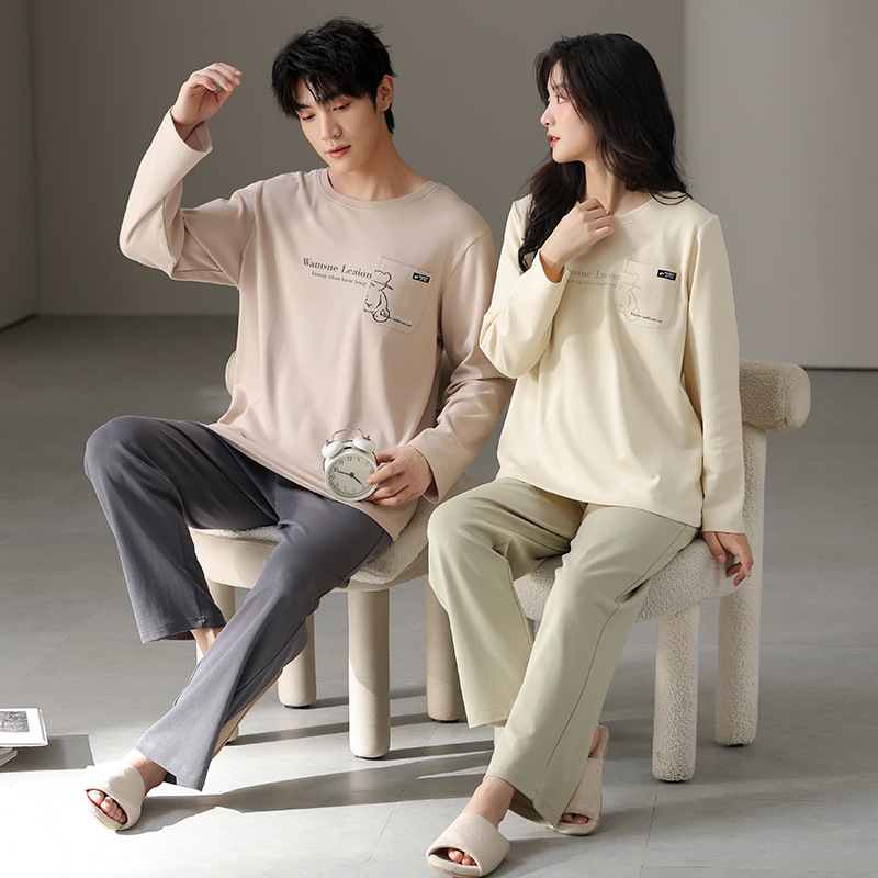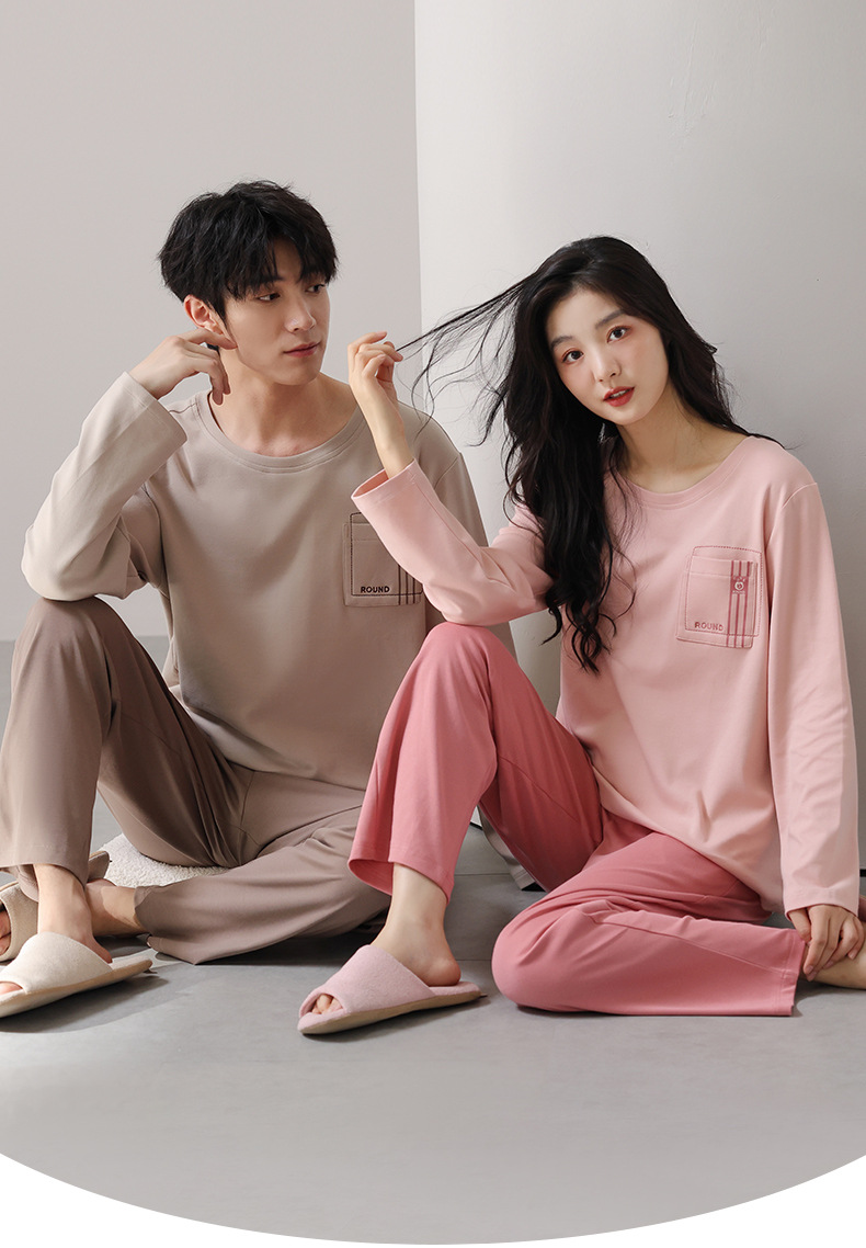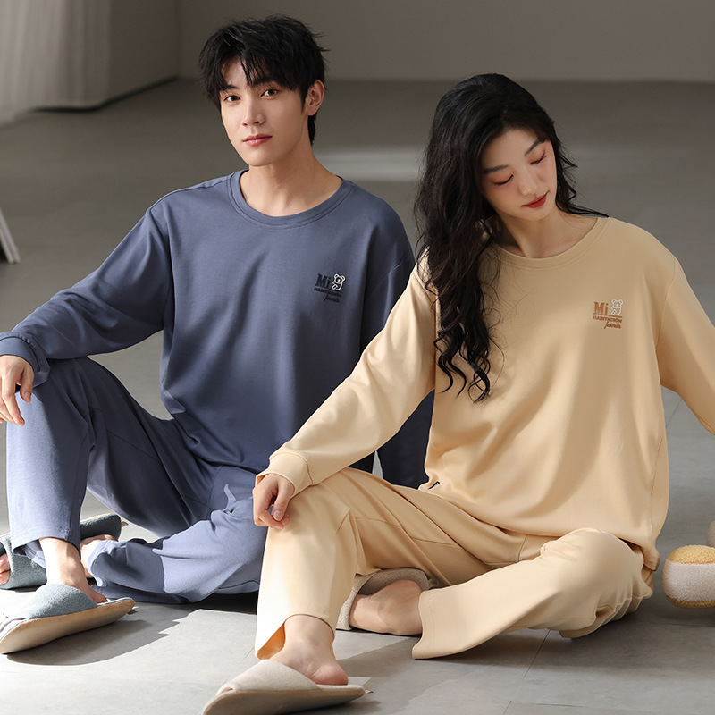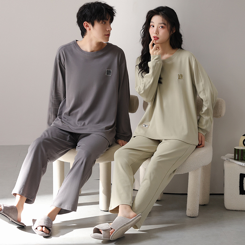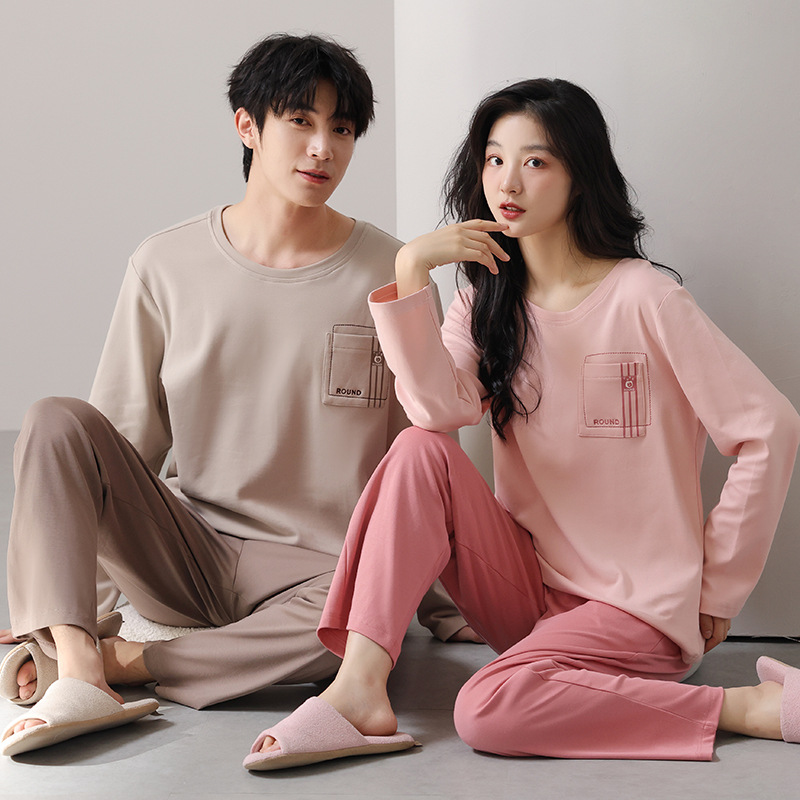 여성용 잠옷 봄 가을 순면 긴팔 라운드넥 신상품 외출 가능 커플 가을 겨울 홈웨어 남성용 라이크라 면 단색