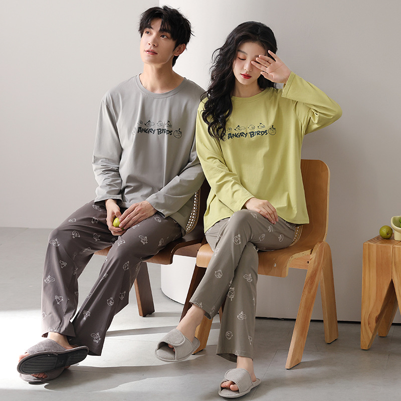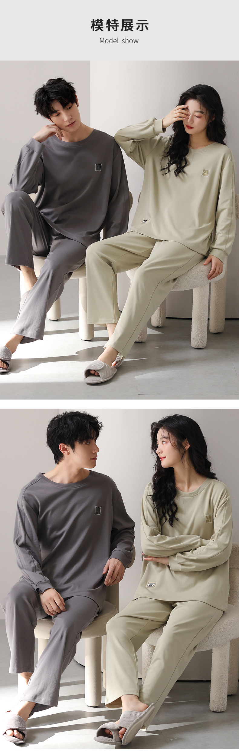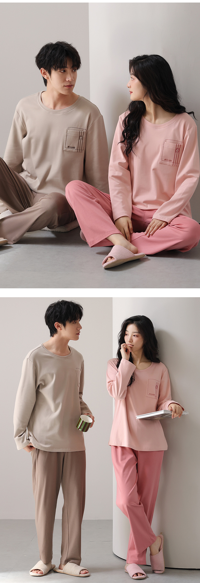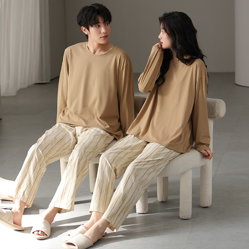 여성용 잠옷 봄 가을 순면 긴팔 라운드넥 신상품 외출 가능 커플 가을 겨울 홈웨어 남성용 라이크라 면 단색