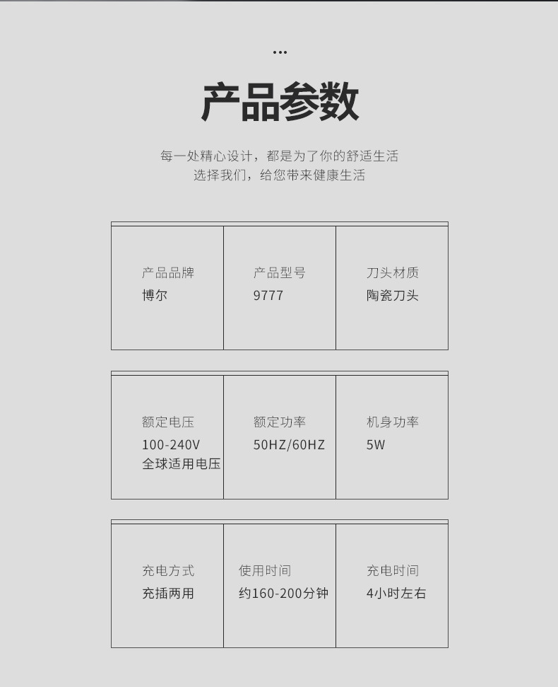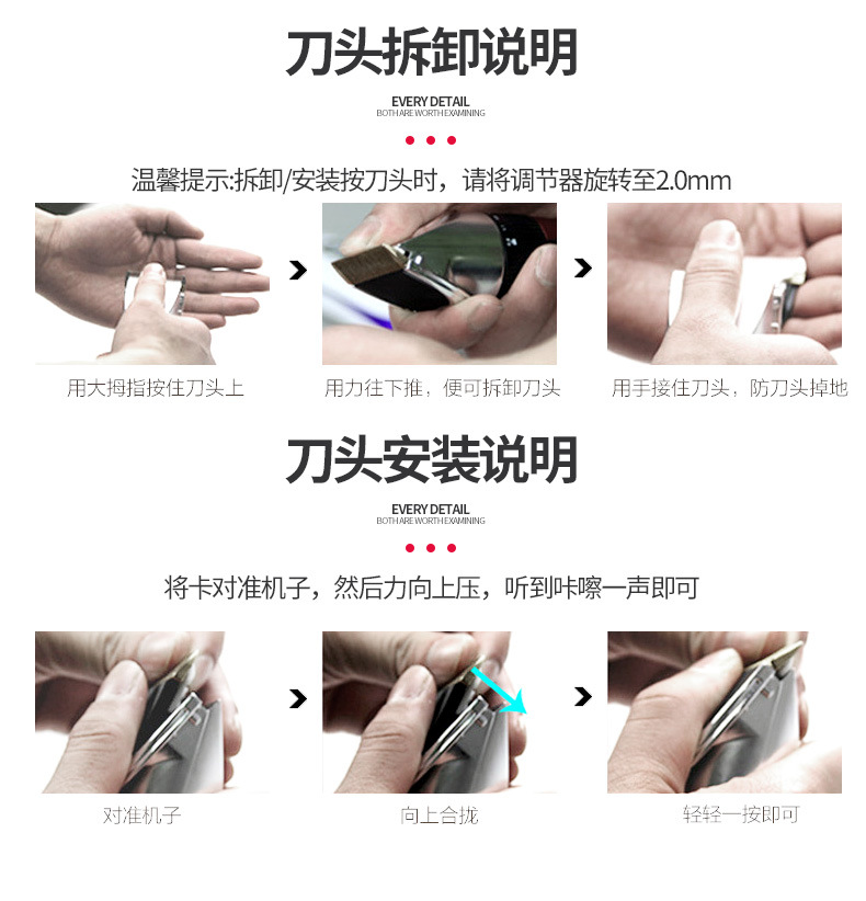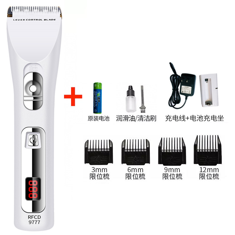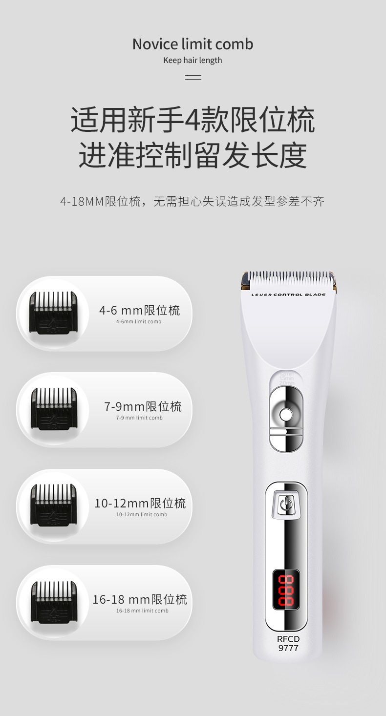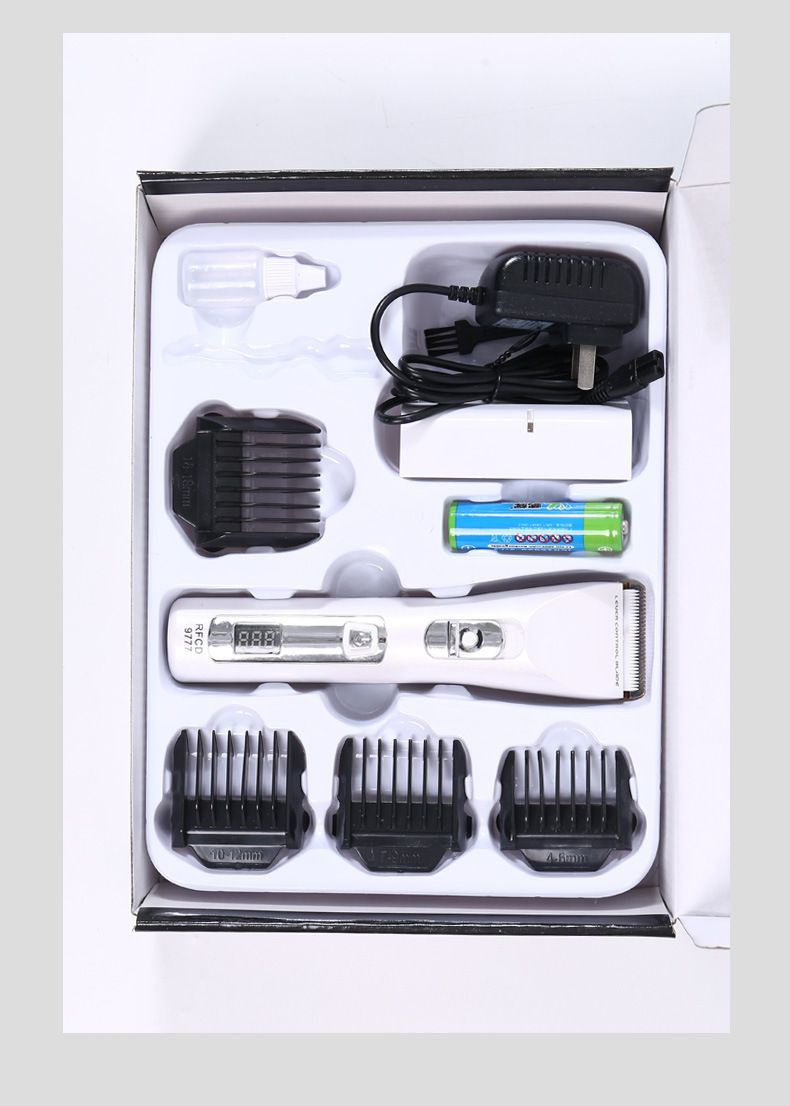 产品配件:包装盒,说明书,4个定位梳,,一个充电器,一瓶润滑油,一只清洁刷,备用锂电池。