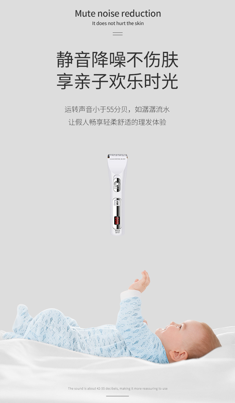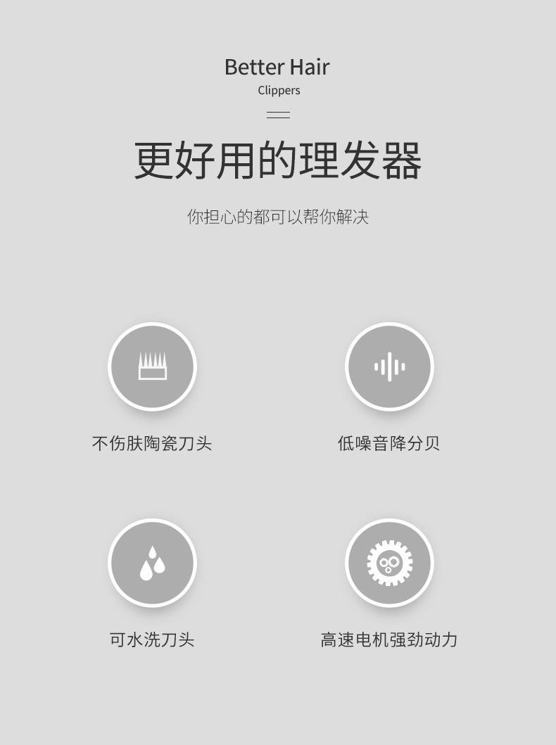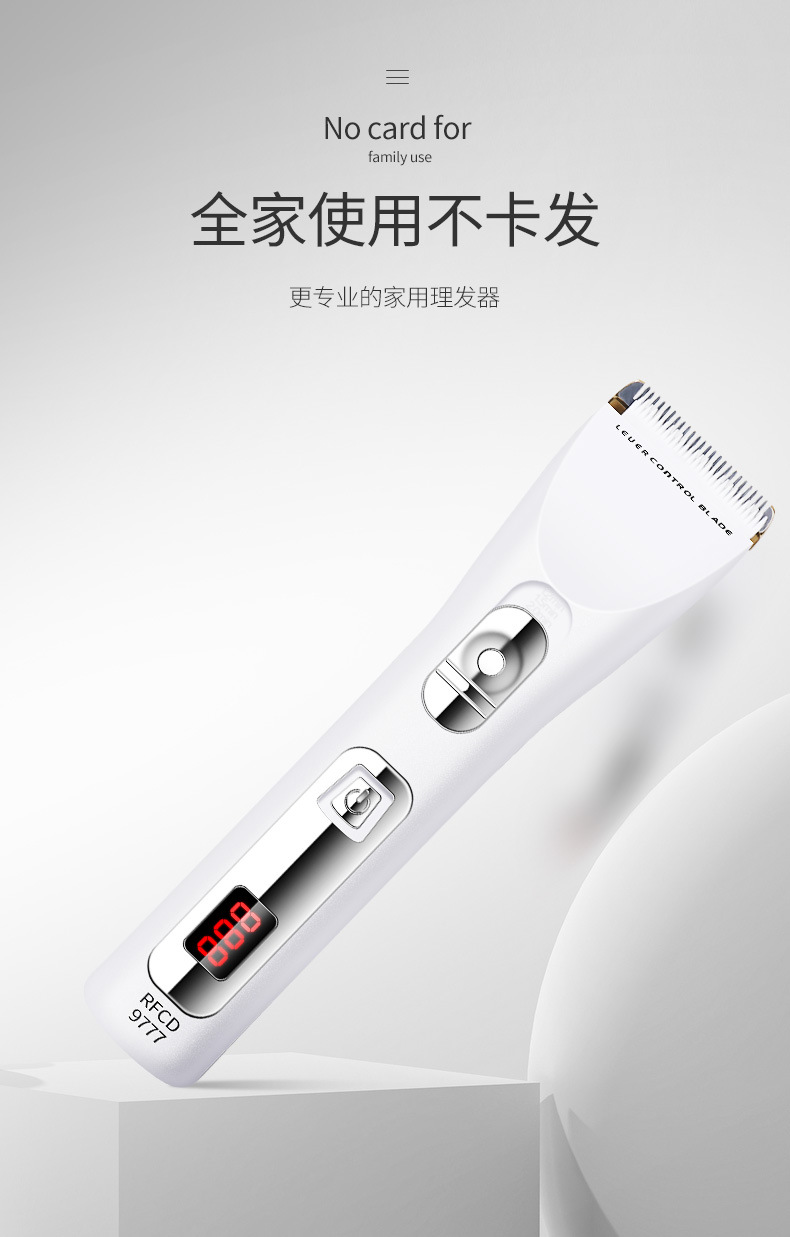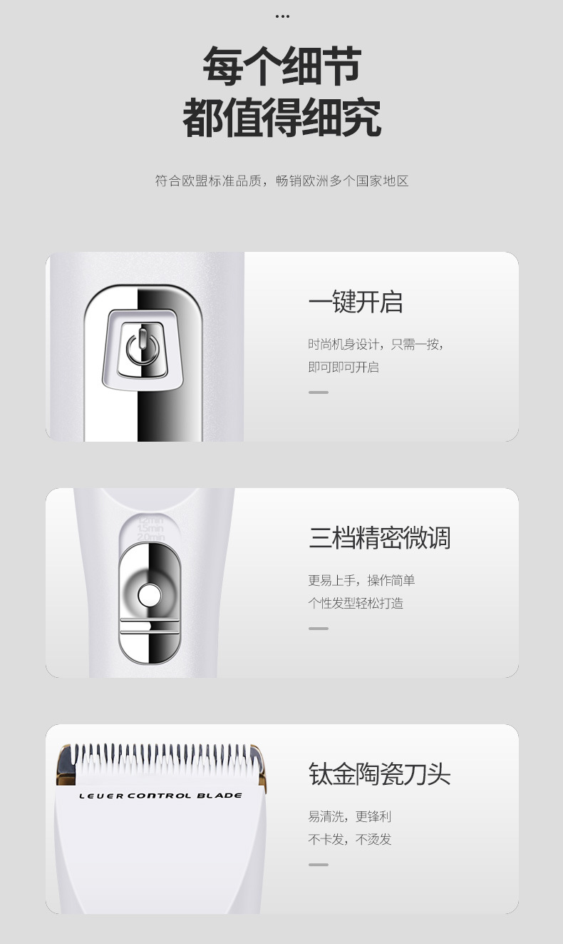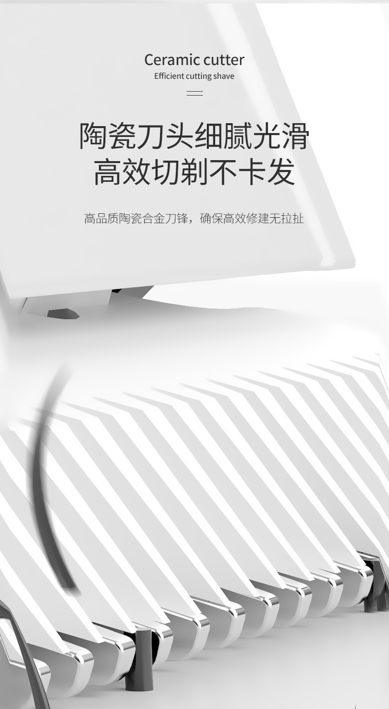 产品配件:包装盒,说明书,4个定位梳,,一个充电器,一瓶润滑油,一只清洁刷,备用锂电池。