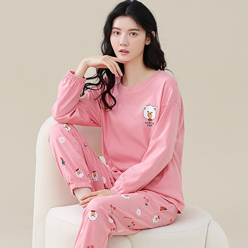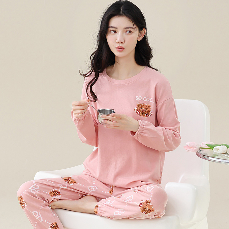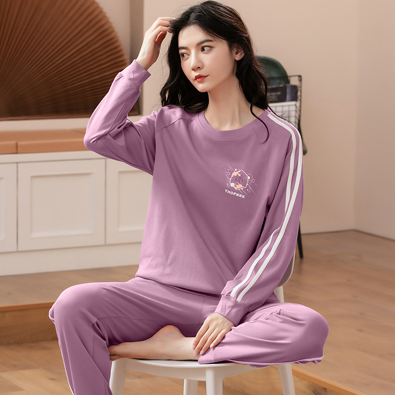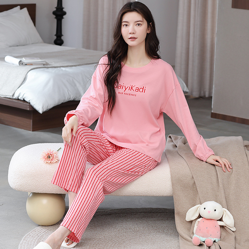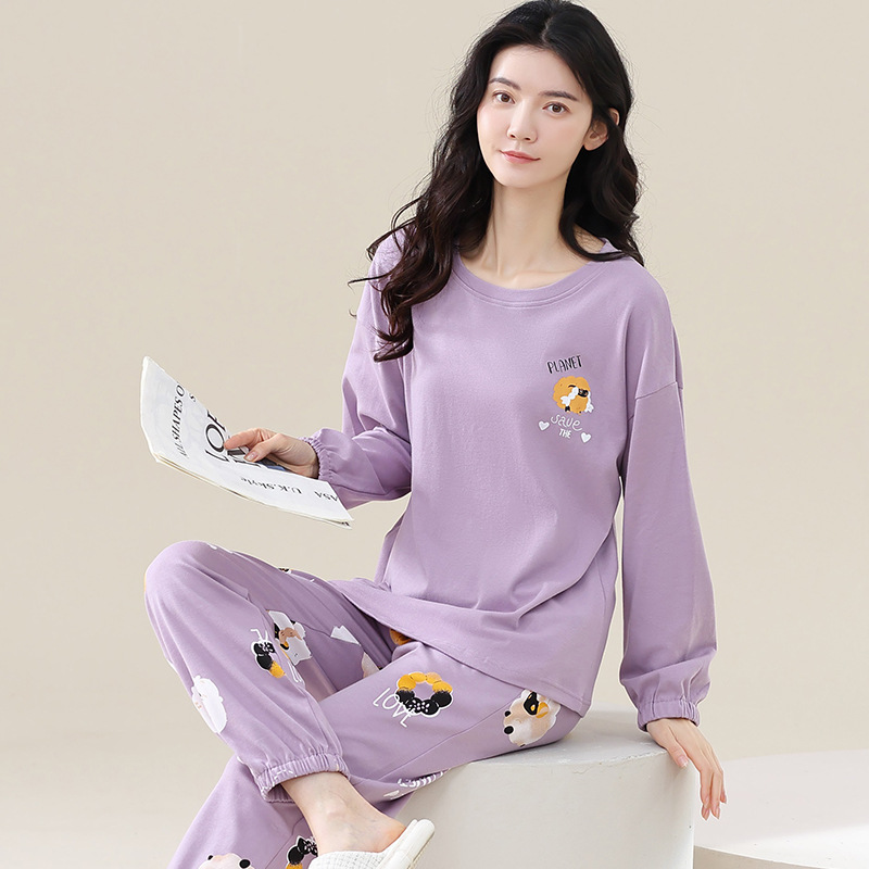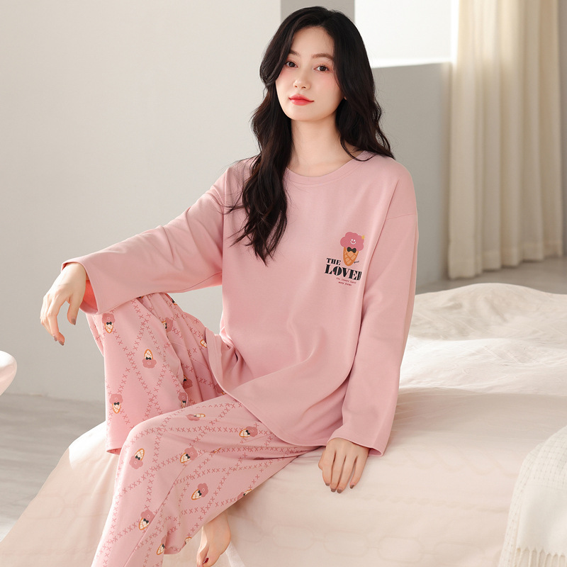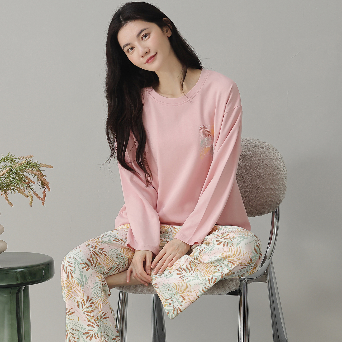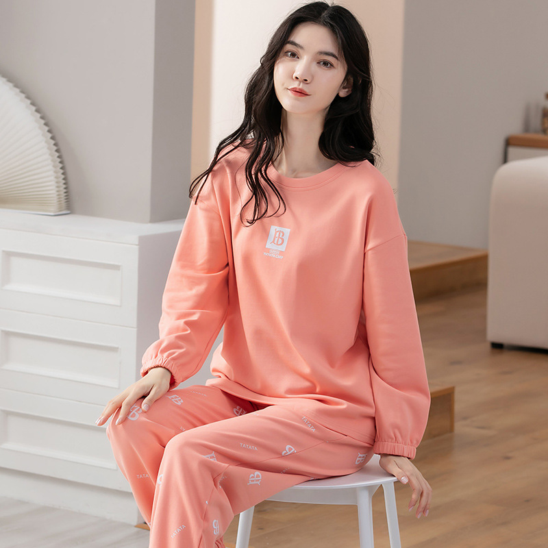 여성용 순면 잠옷, 가을 겨울 긴팔 라운드넥, 편안하고 피부 친화적인 신장면, 순면 봄 가을 홈웨어 세트