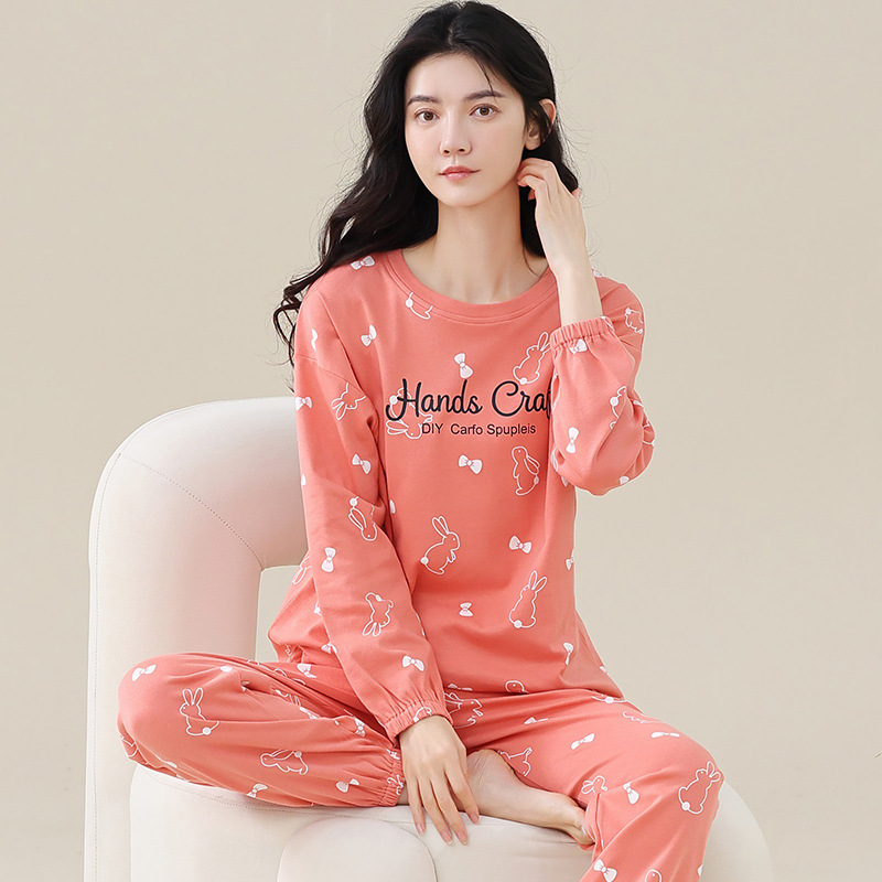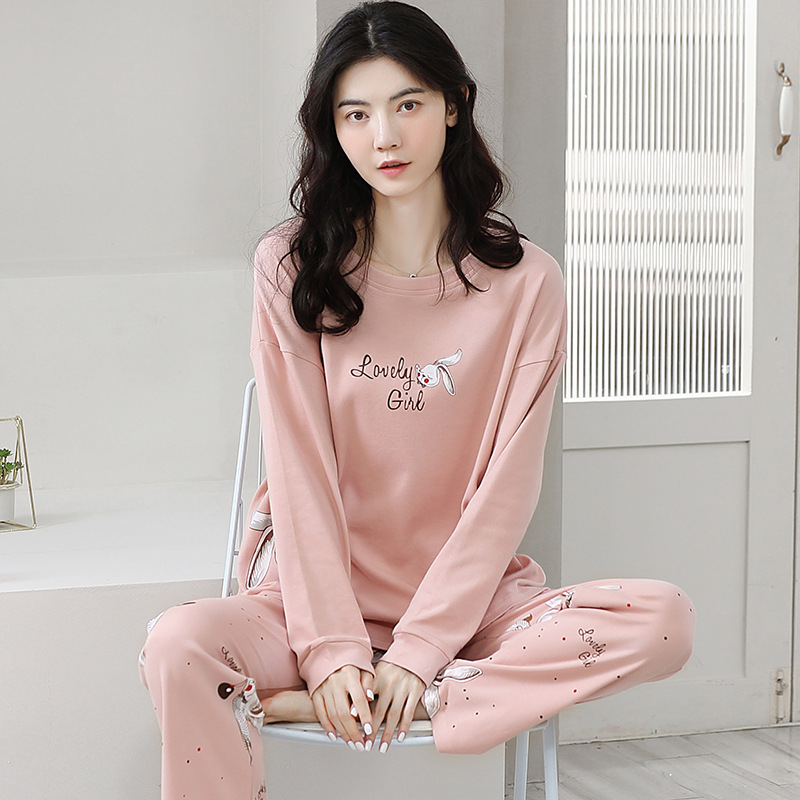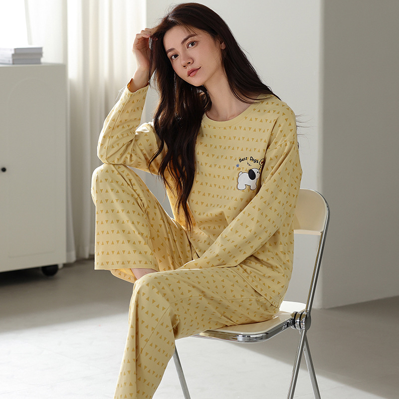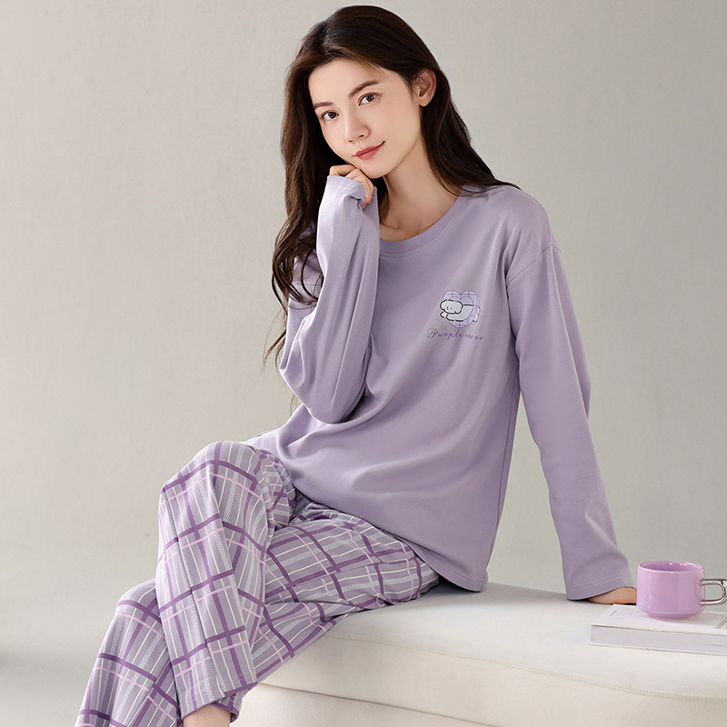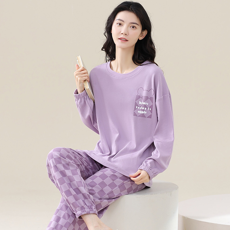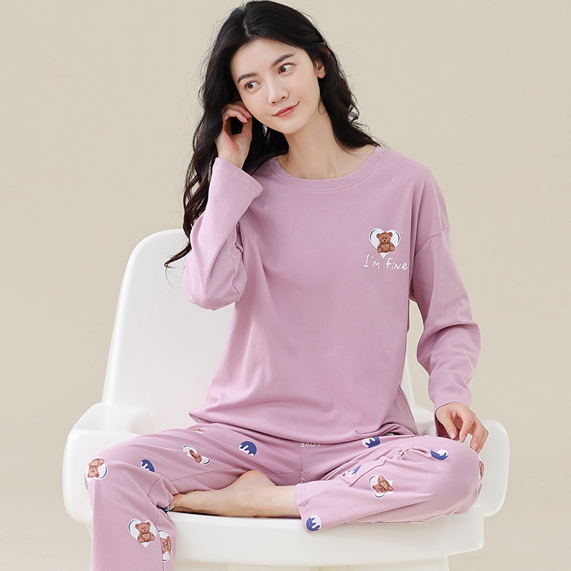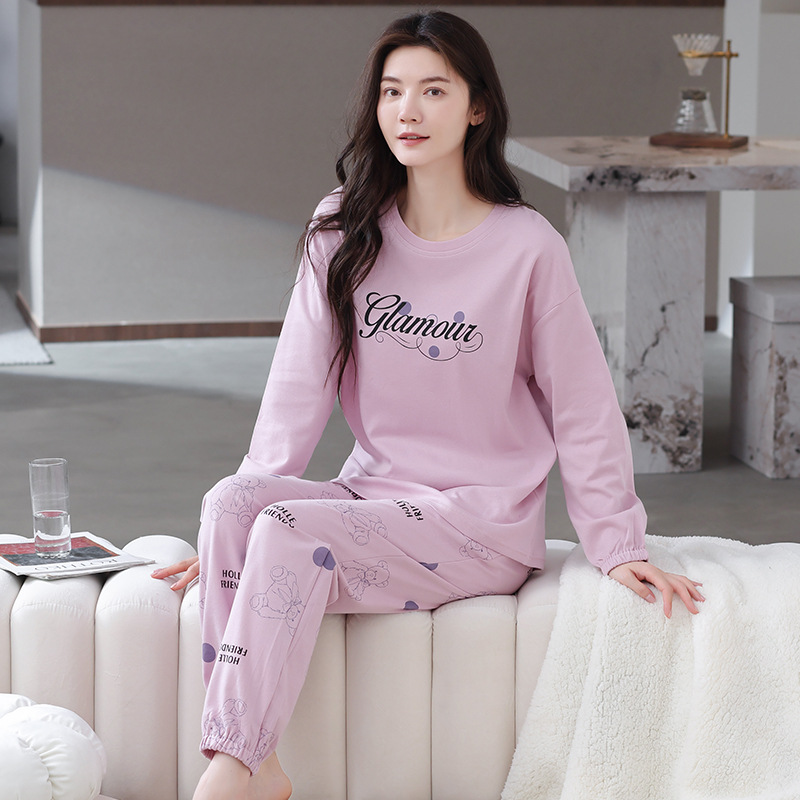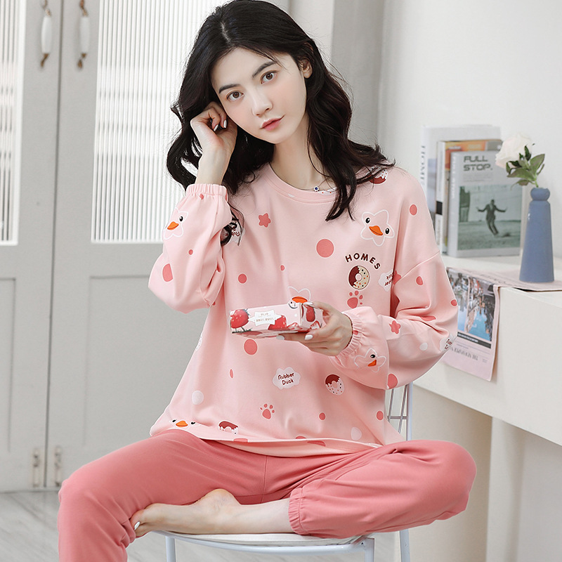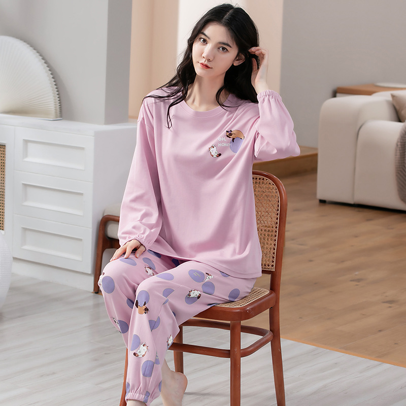 여성용 순면 잠옷, 가을 겨울 긴팔 라운드넥, 편안하고 피부 친화적인 신장면, 순면 봄 가을 홈웨어 세트