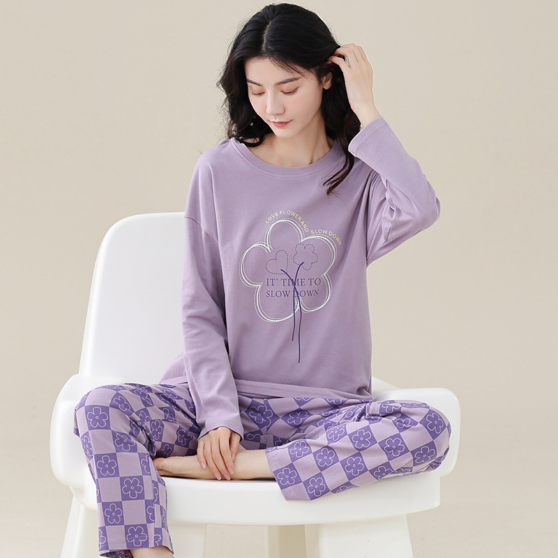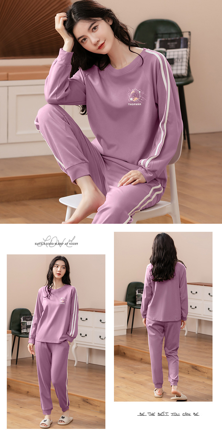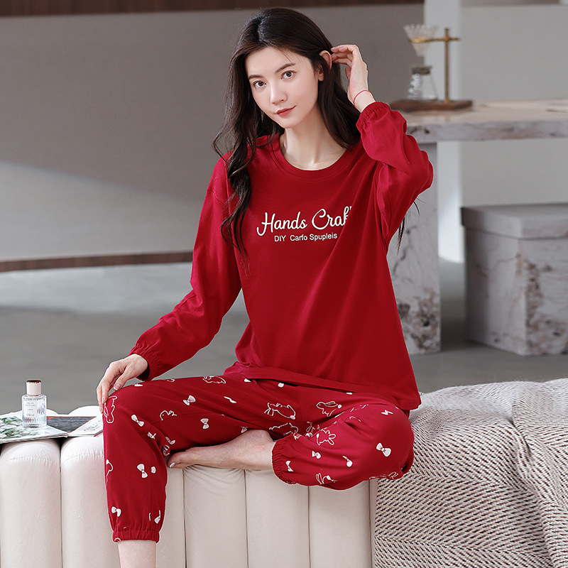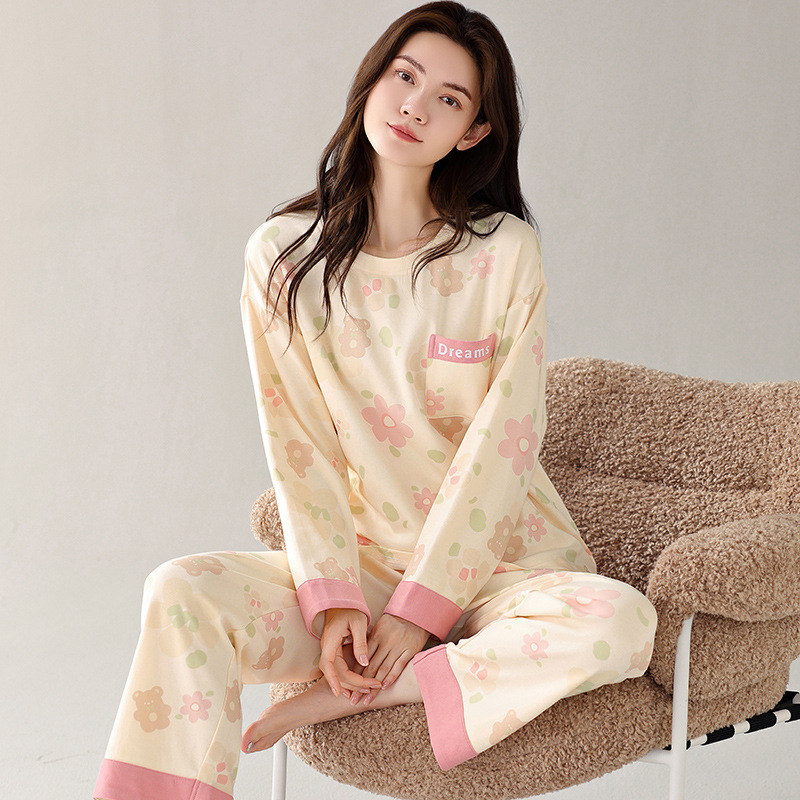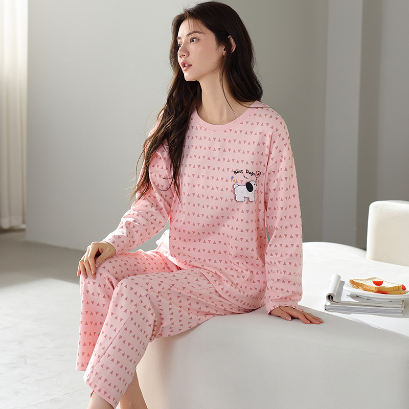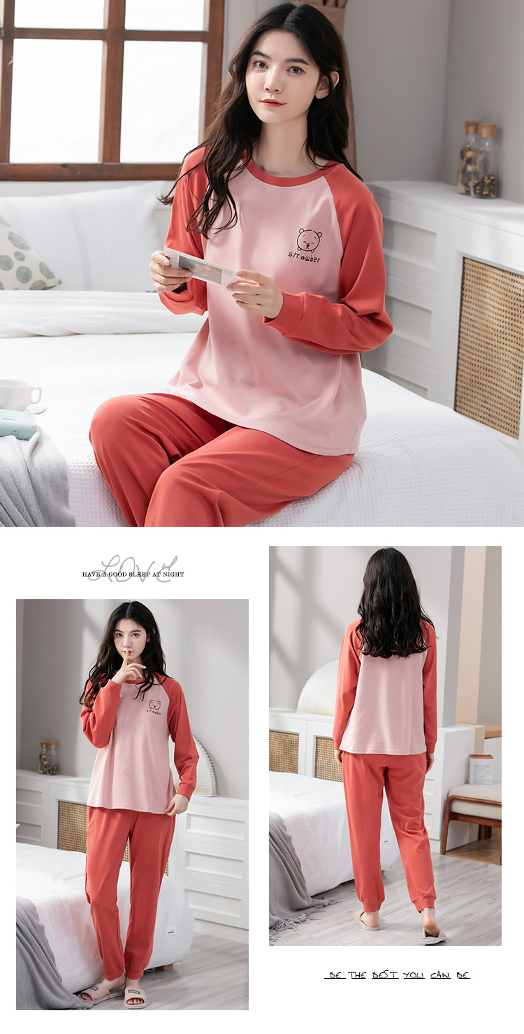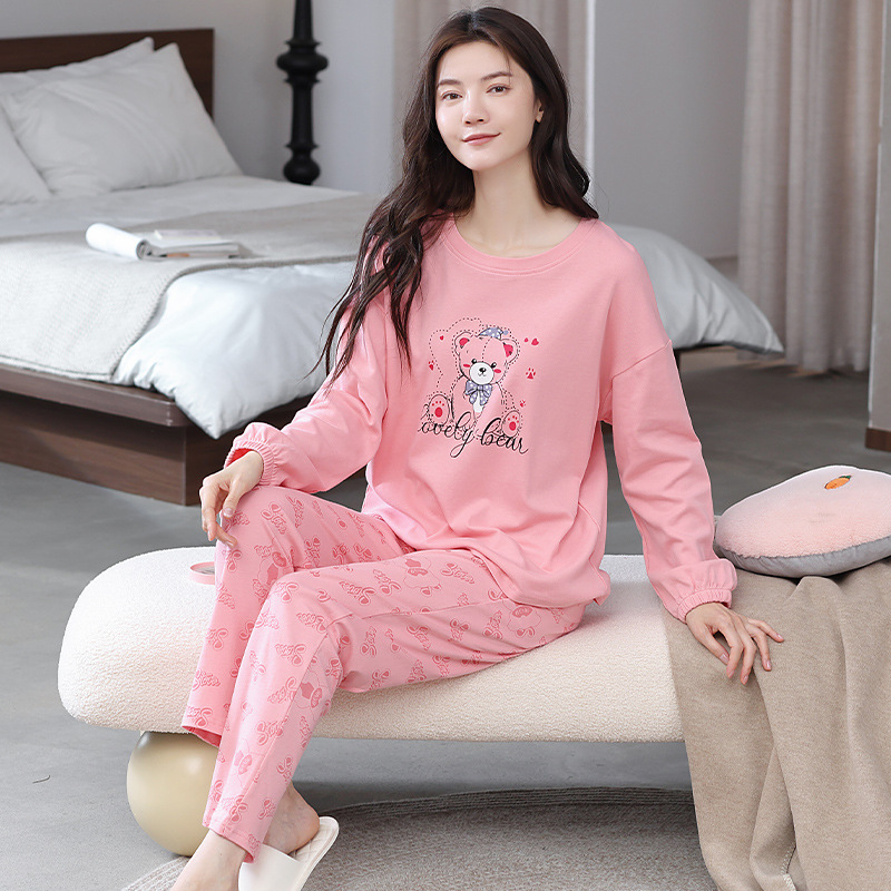 여성용 순면 잠옷, 가을 겨울 긴팔 라운드넥, 편안하고 피부 친화적인 신장면, 순면 봄 가을 홈웨어 세트