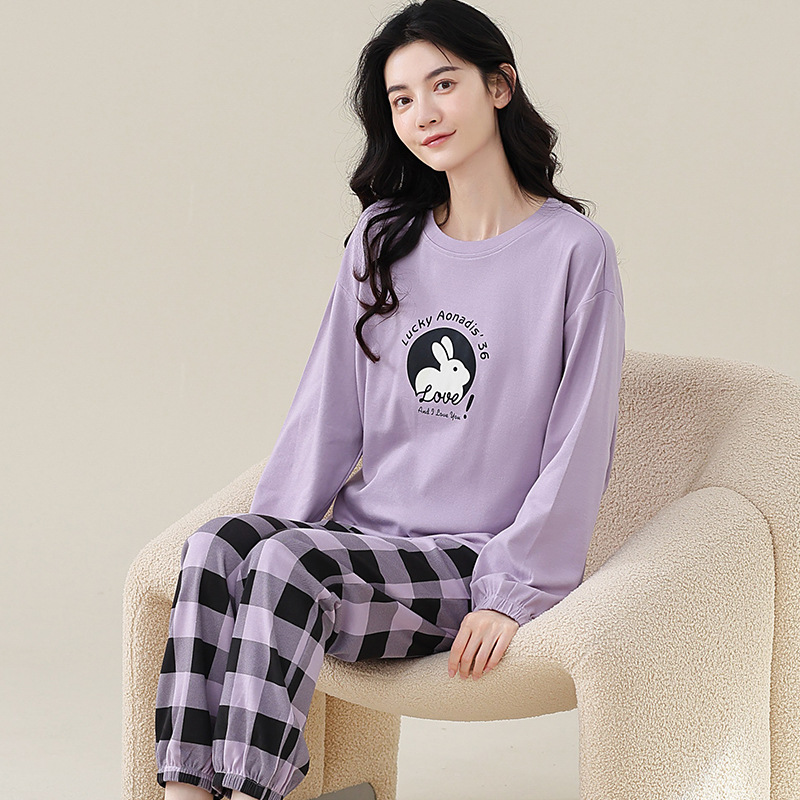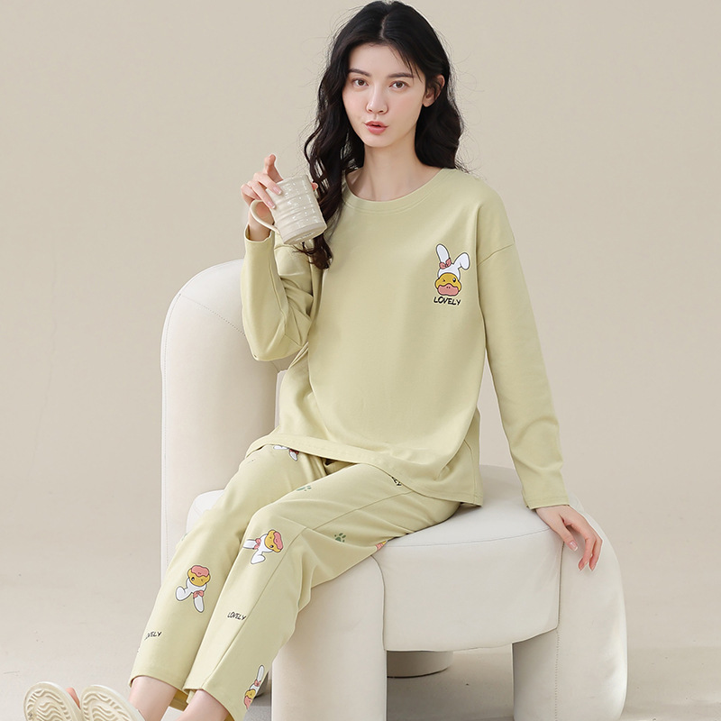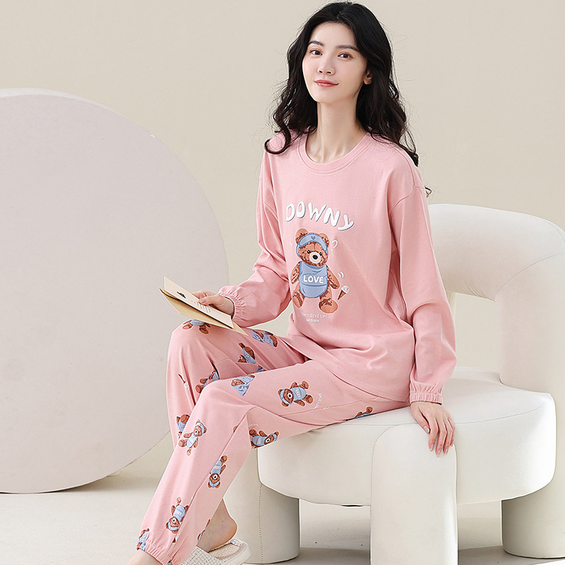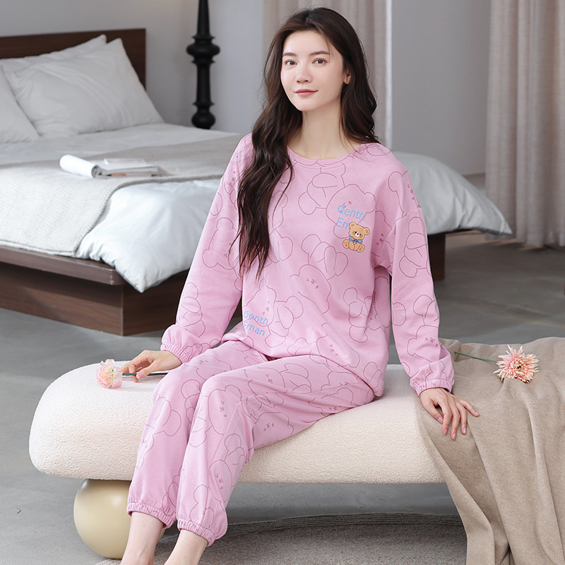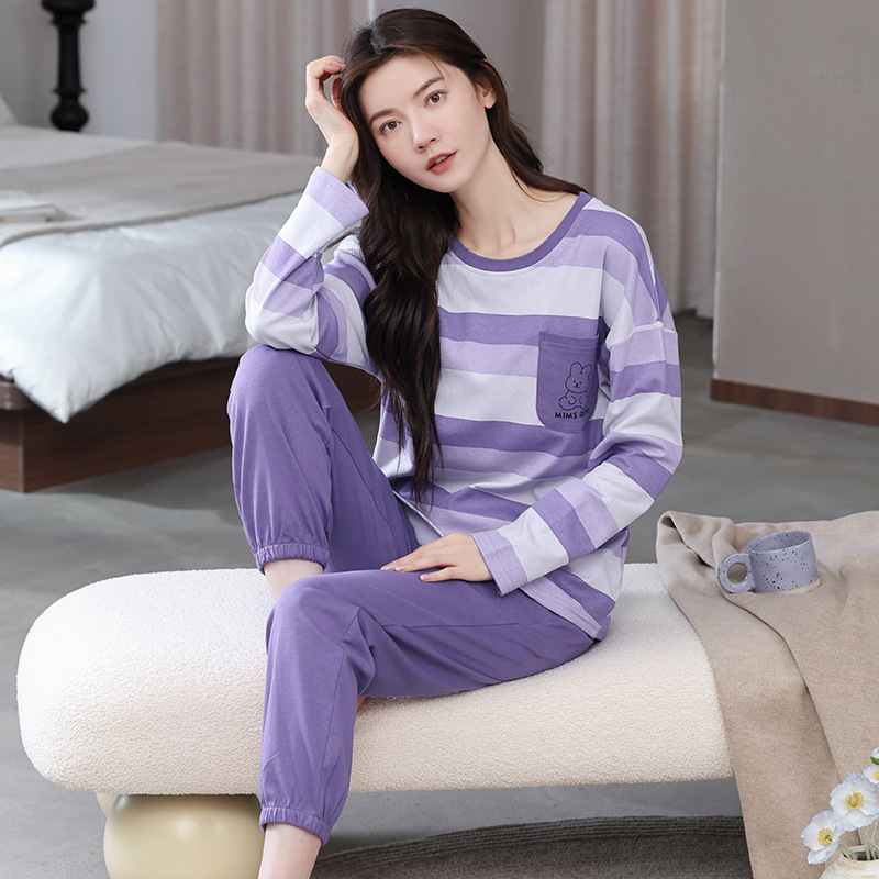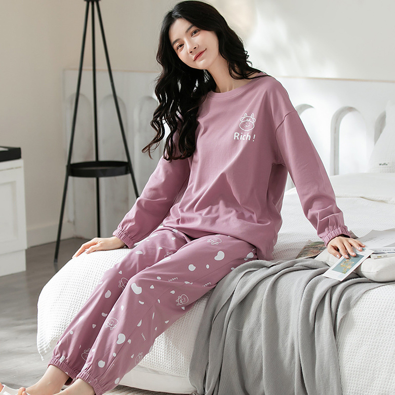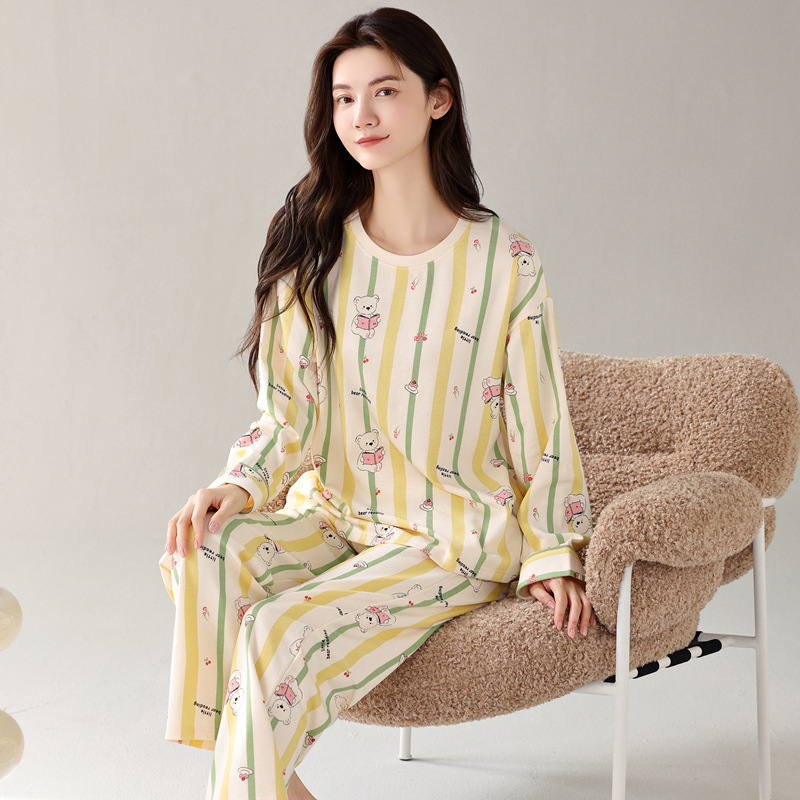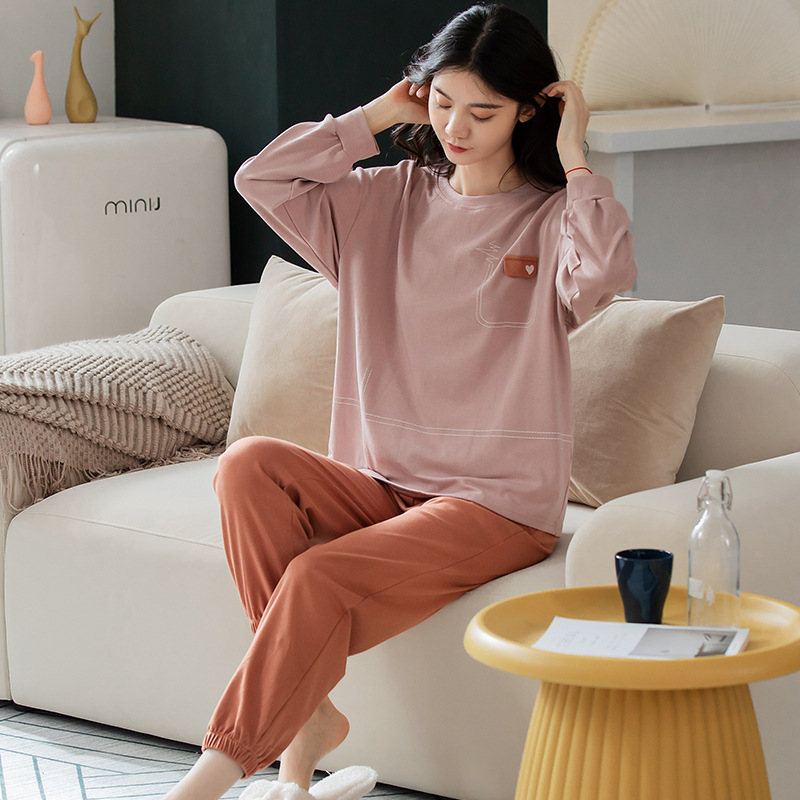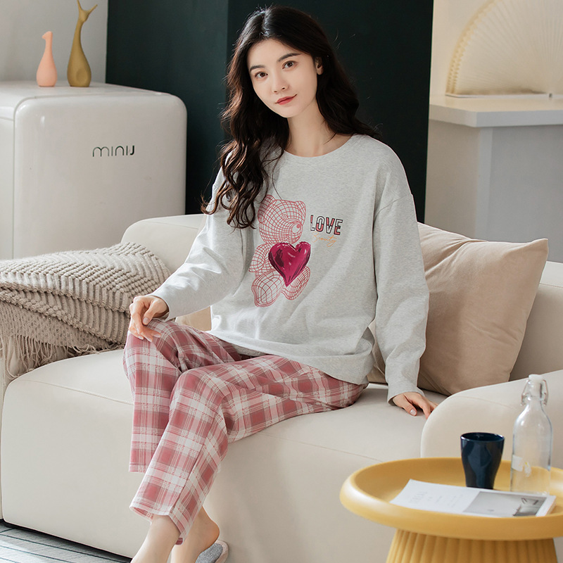 여성용 순면 잠옷, 가을 겨울 긴팔 라운드넥, 편안하고 피부 친화적인 신장면, 순면 봄 가을 홈웨어 세트