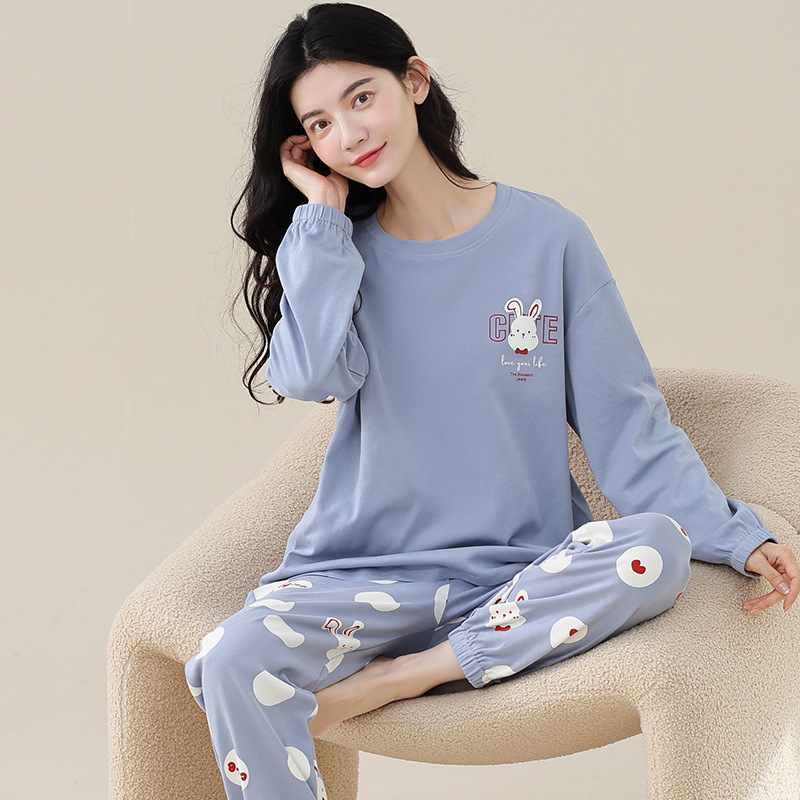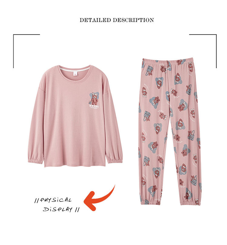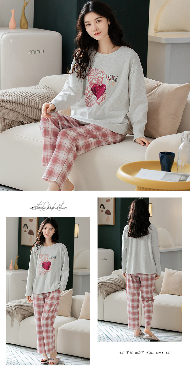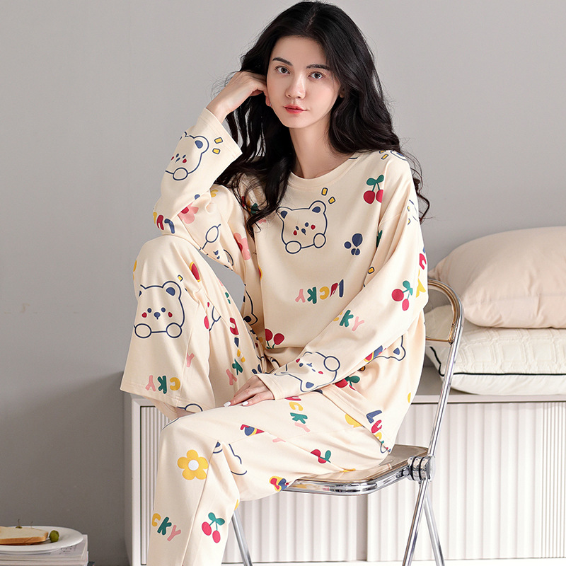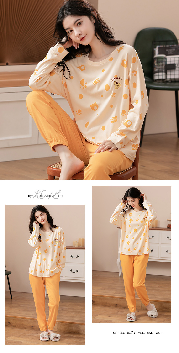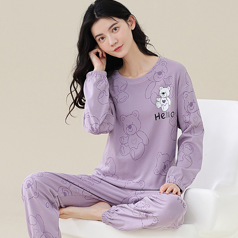 여성용 순면 잠옷, 가을 겨울 긴팔 라운드넥, 편안하고 피부 친화적인 신장면, 순면 봄 가을 홈웨어 세트스토어 가기