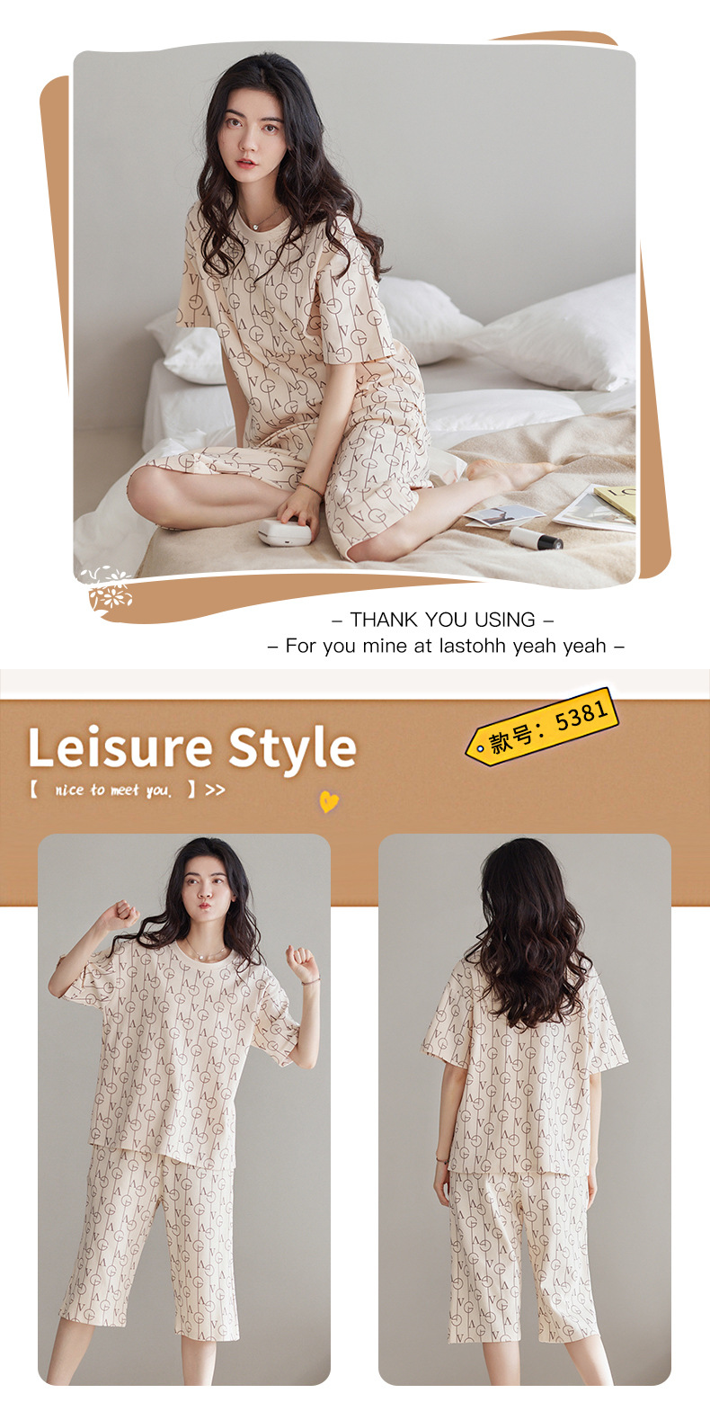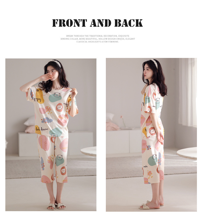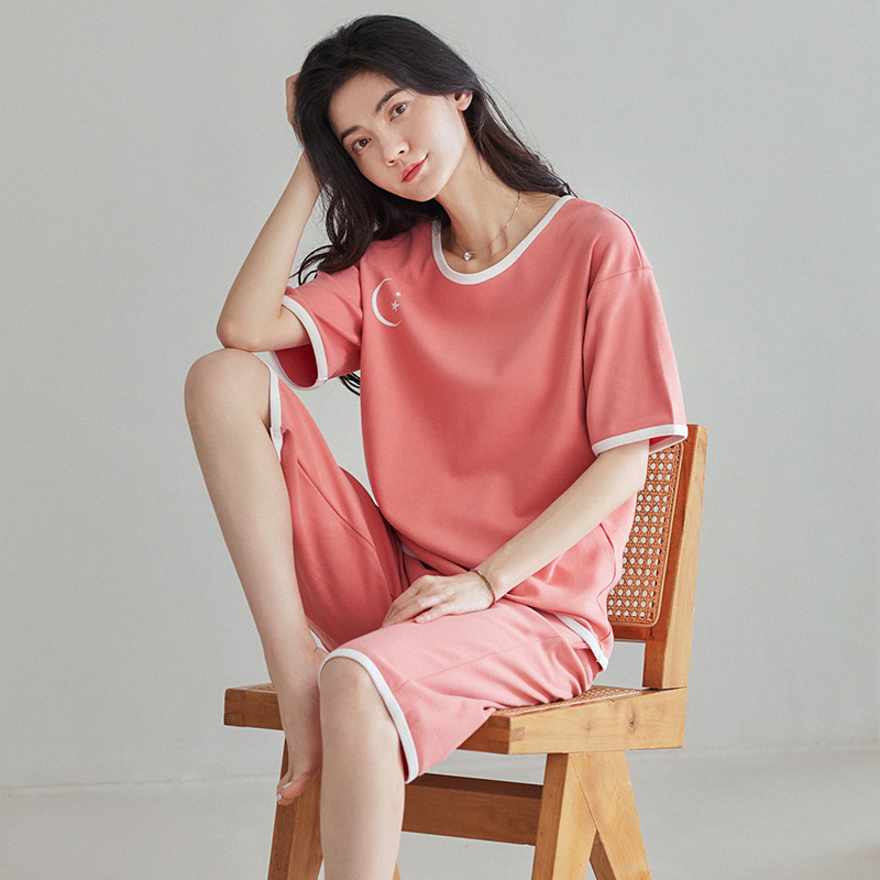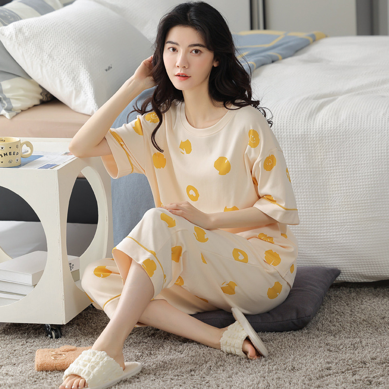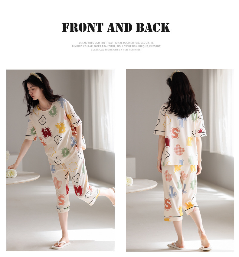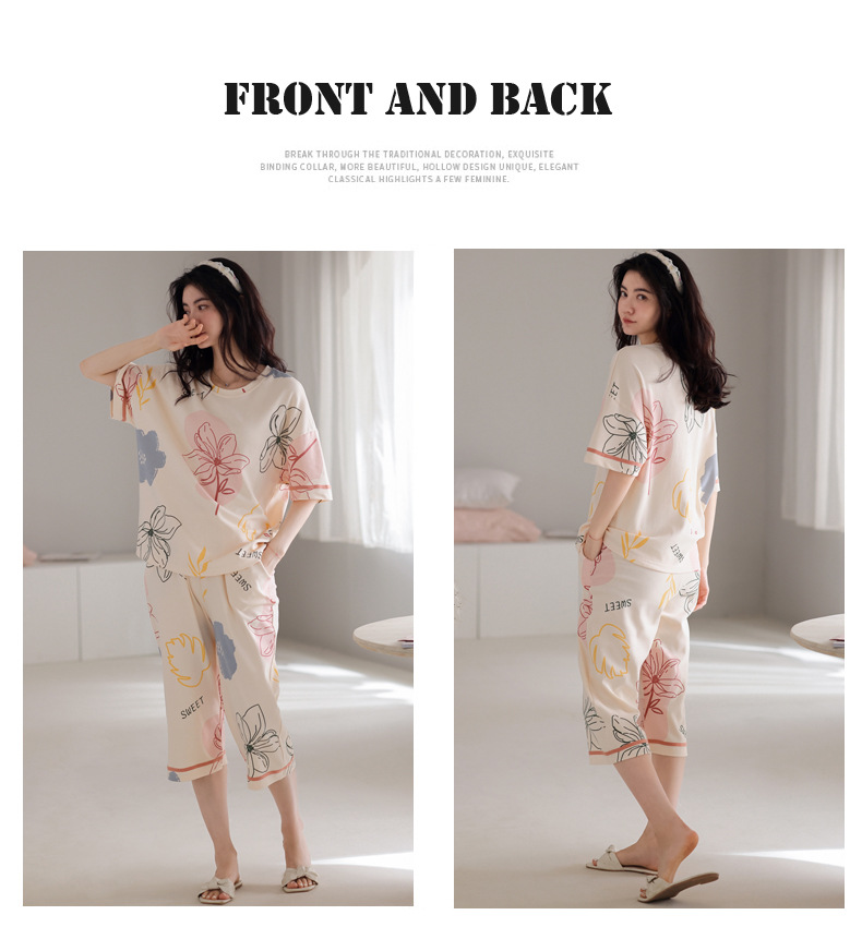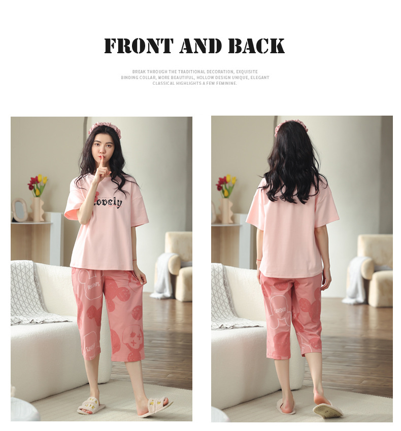 2025 순면 잠옷 여성 여름 반팔 세트 달콤하고 캐주얼한 심플한 7부 바지 편안한 홈웨어 외출복으로도 가능