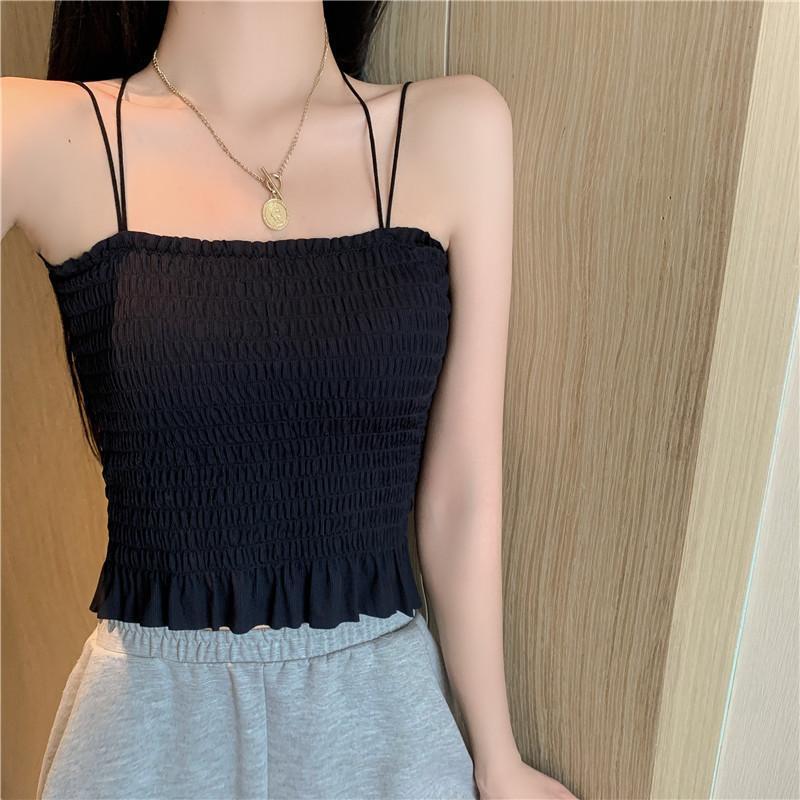 여성용 원넥 플리츠 스몰 캐미솔 조끼 겉옷 안티 라이트 통합 가슴 패드 얇은 숄더 스트랩 여성용 베이스 탑스토어 가기