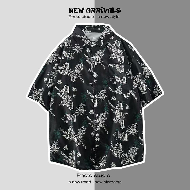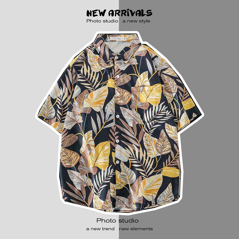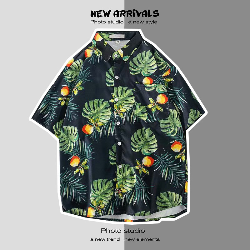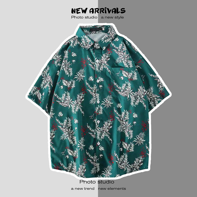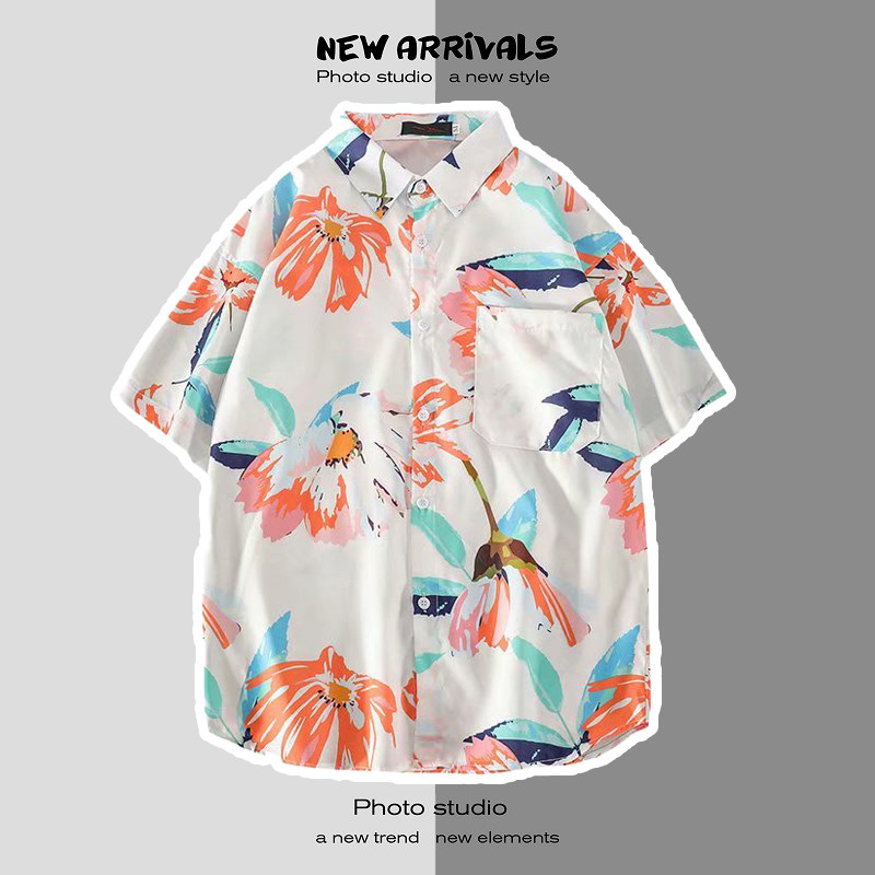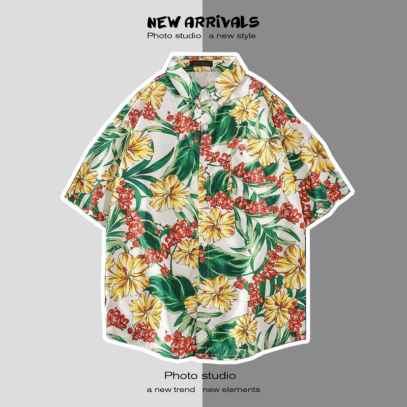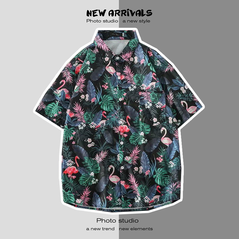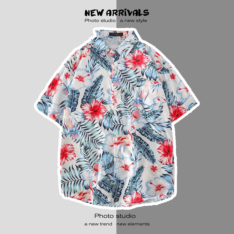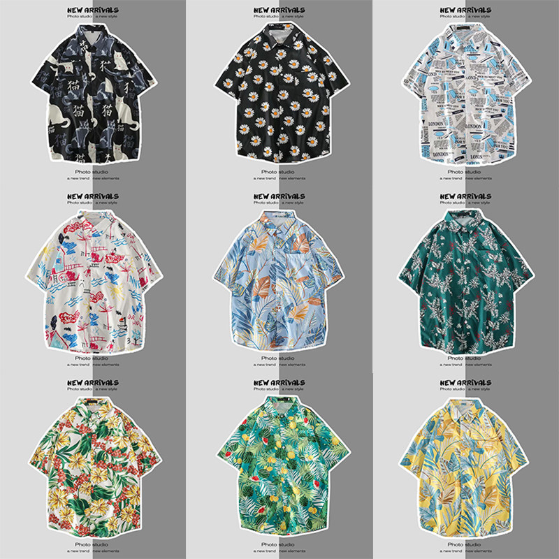 여름 일본 해변 꽃 무늬 남녀 셔츠, 트렌디 한 하와이 홍콩 스타일 느슨한 프린트 반팔 커플 셔츠