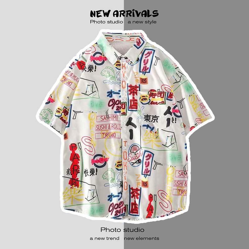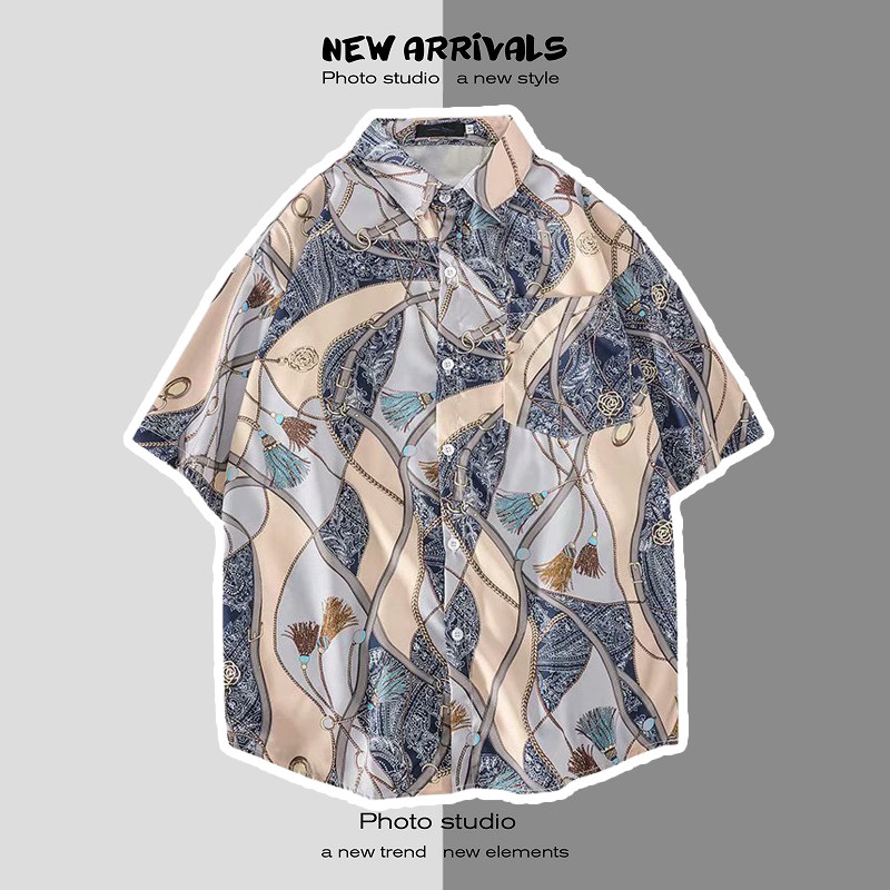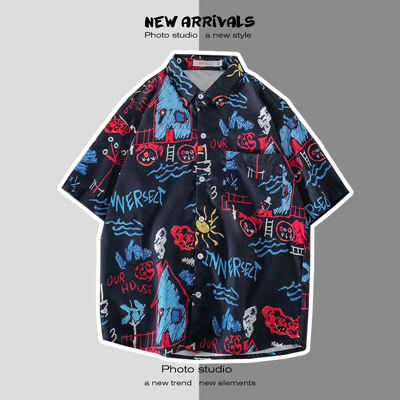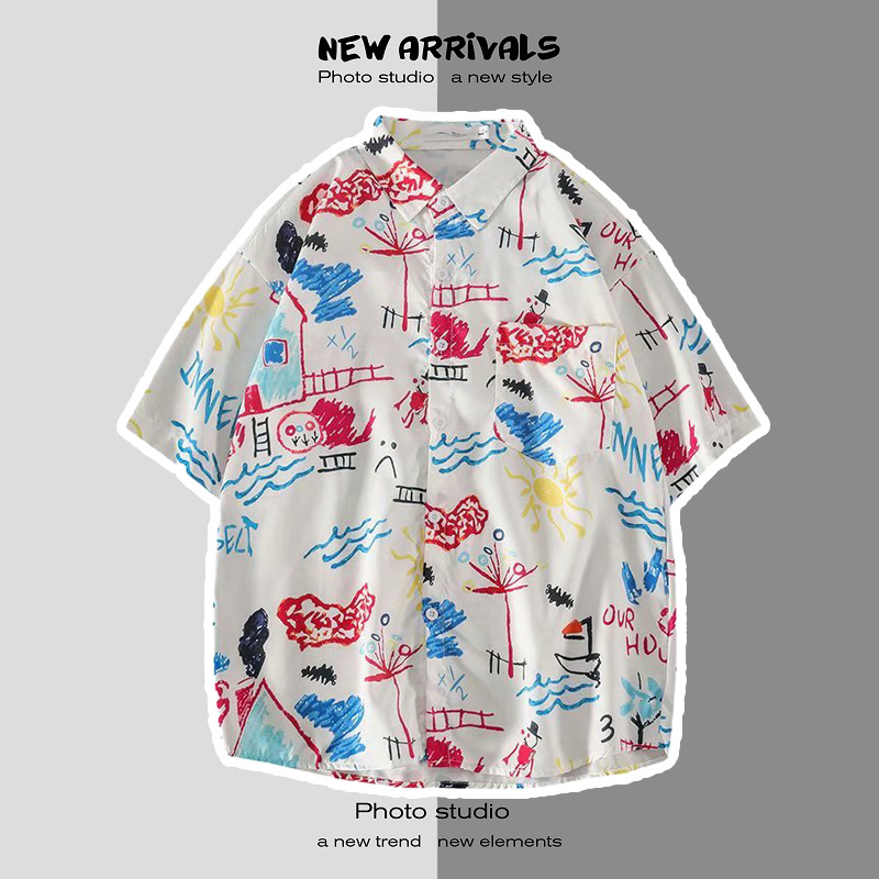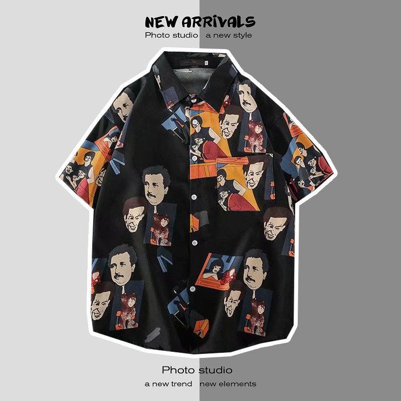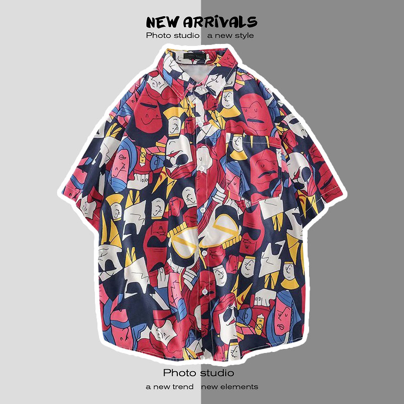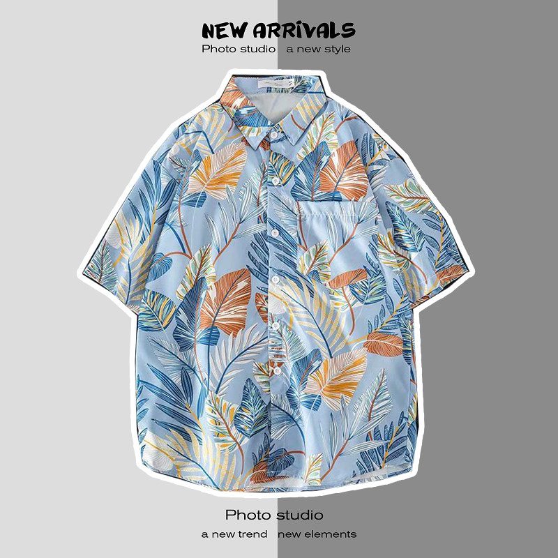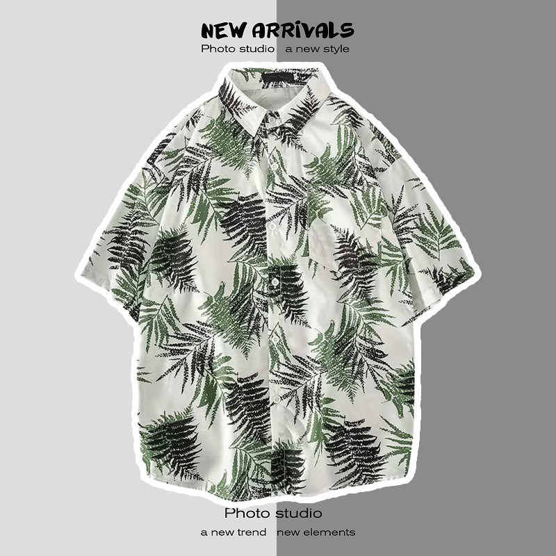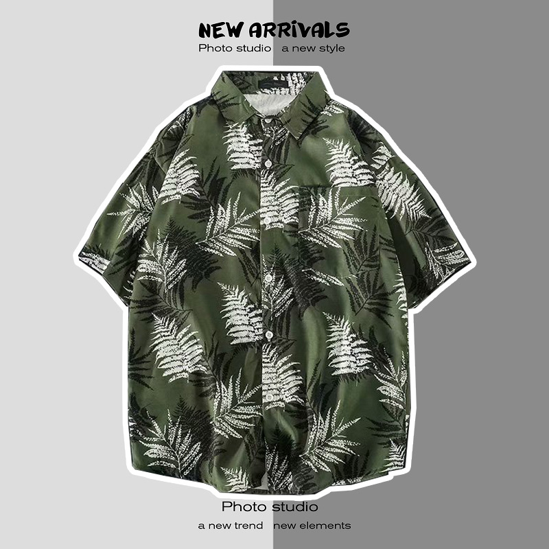 여름 일본 해변 꽃 무늬 남녀 셔츠, 트렌디 한 하와이 홍콩 스타일 느슨한 프린트 반팔 커플 셔츠