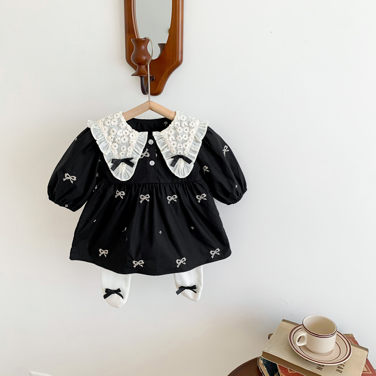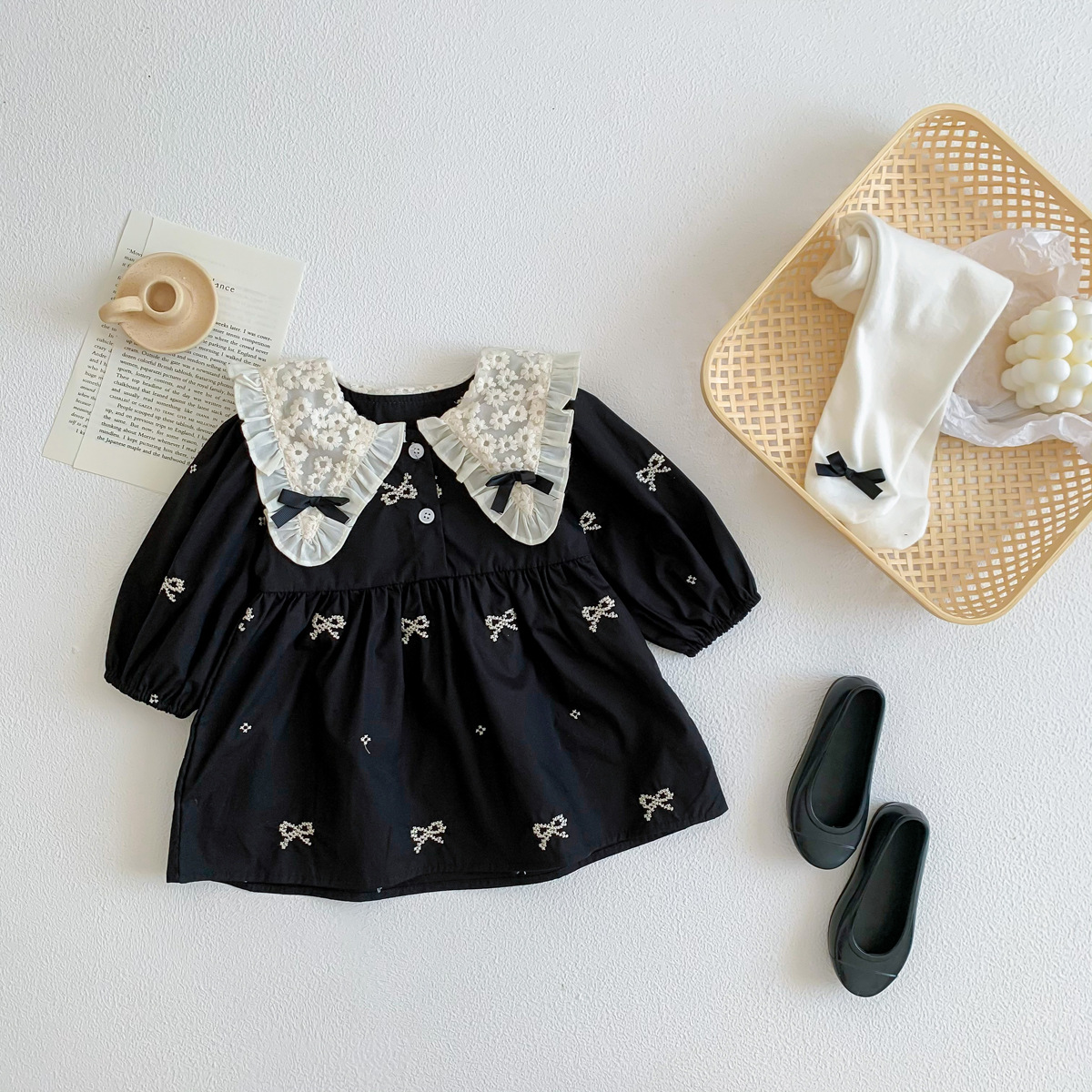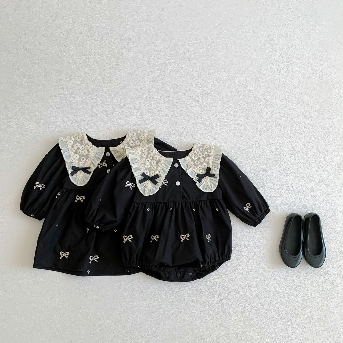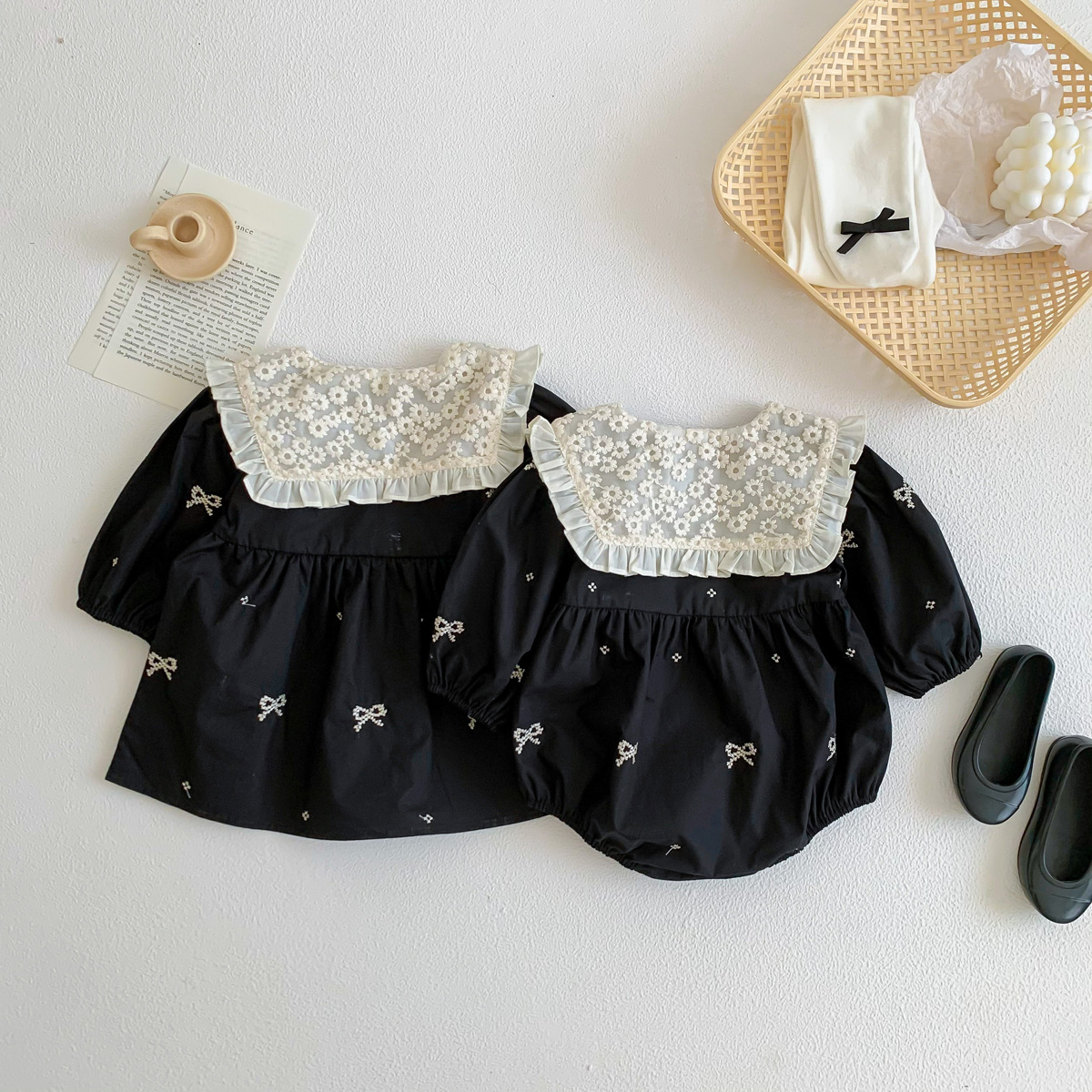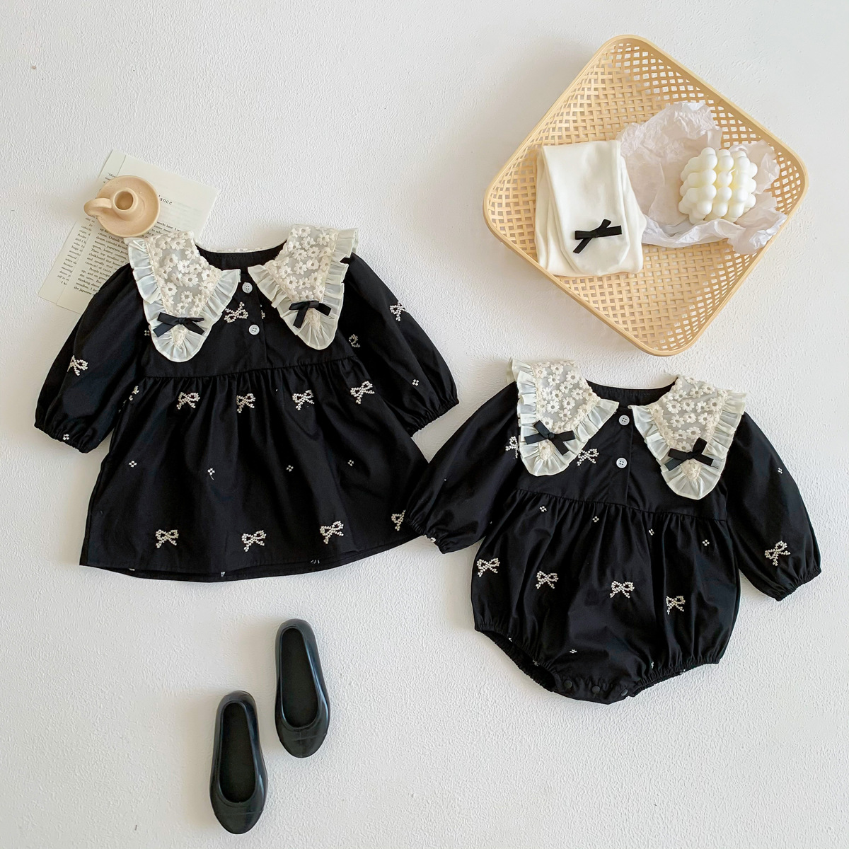 한국어 버전 가을 한국 스타일 소녀의 세련된 대형 옷깃 가방 방귀 옷 아기 아기 활 수 놓은 자매 옷 크롤링 옷스토어 가기