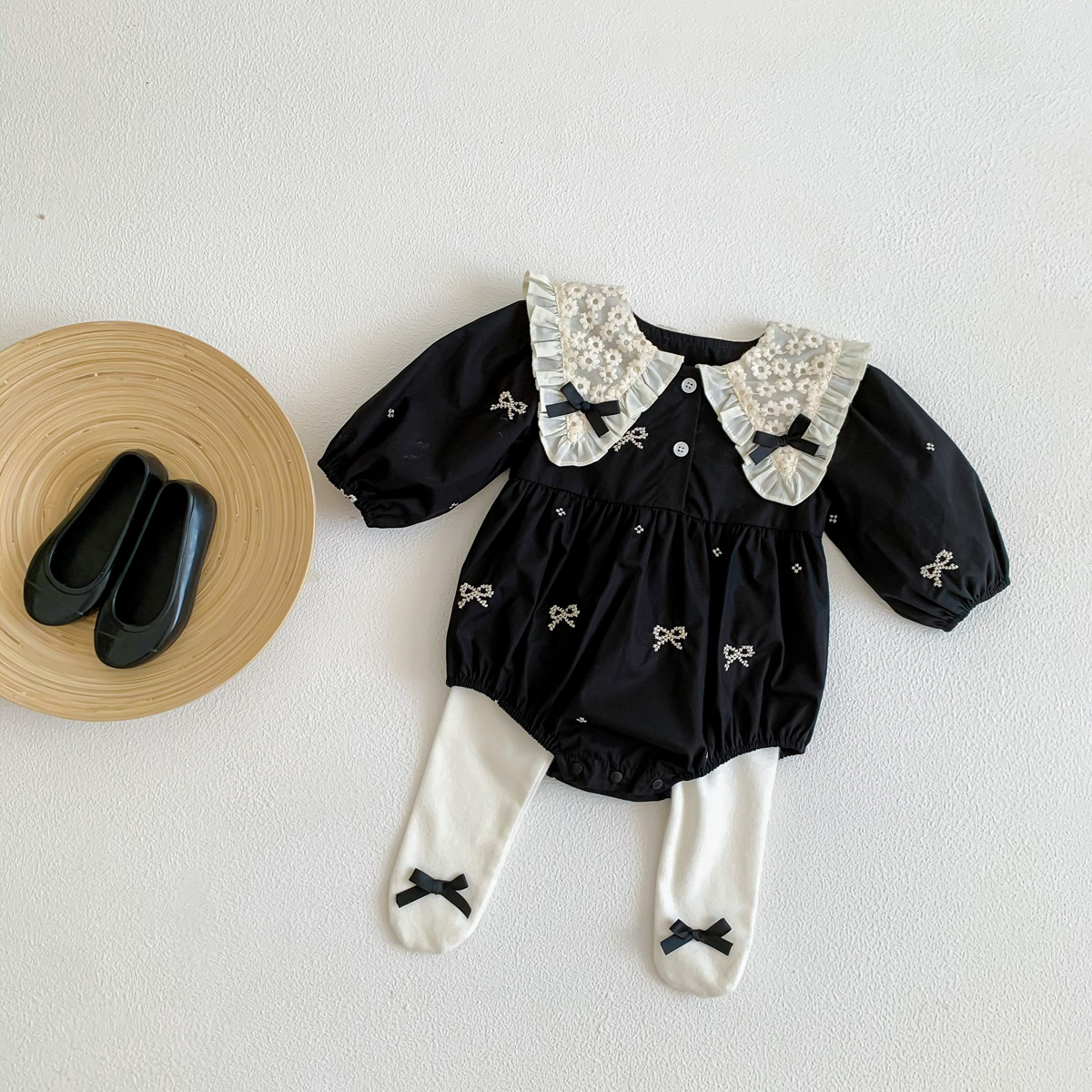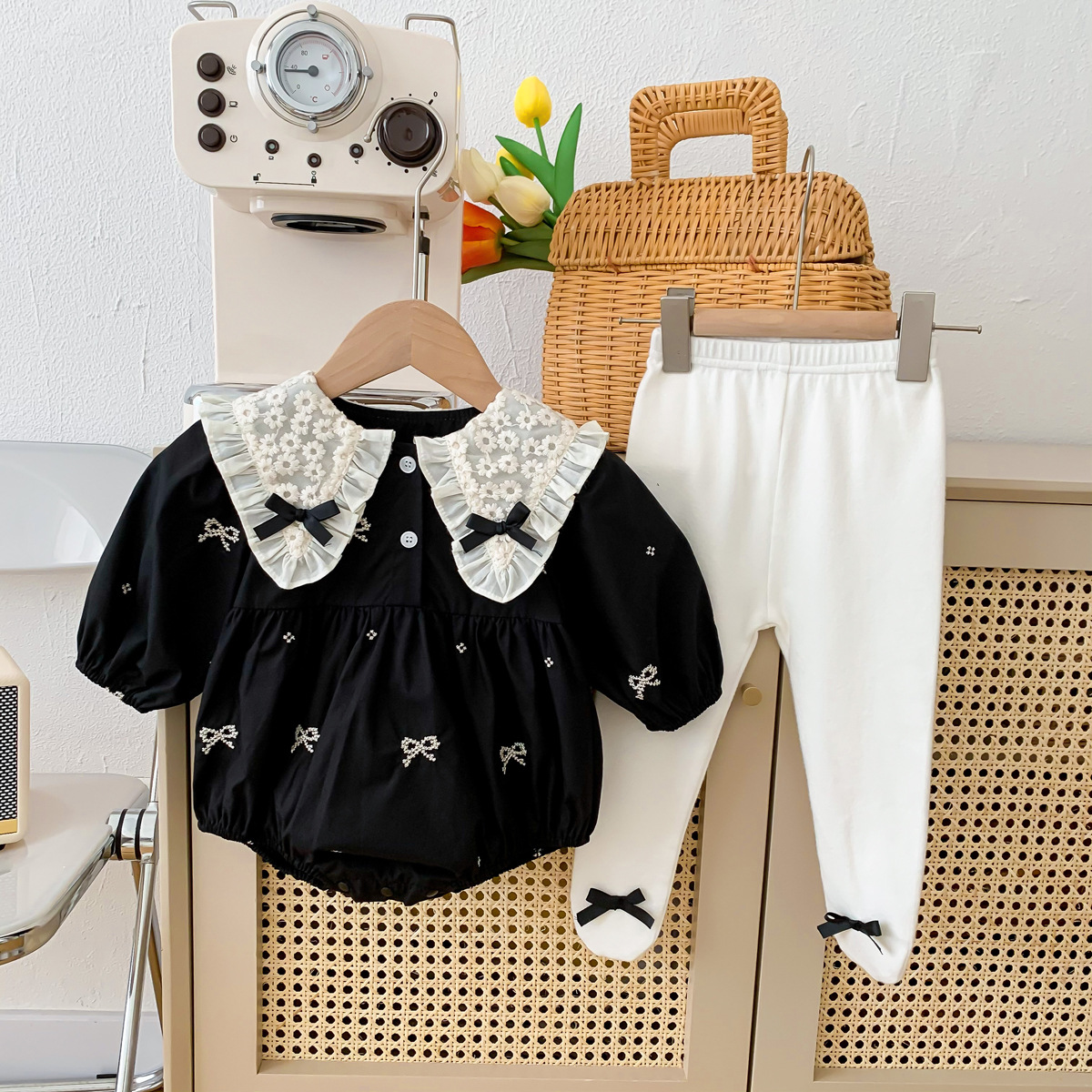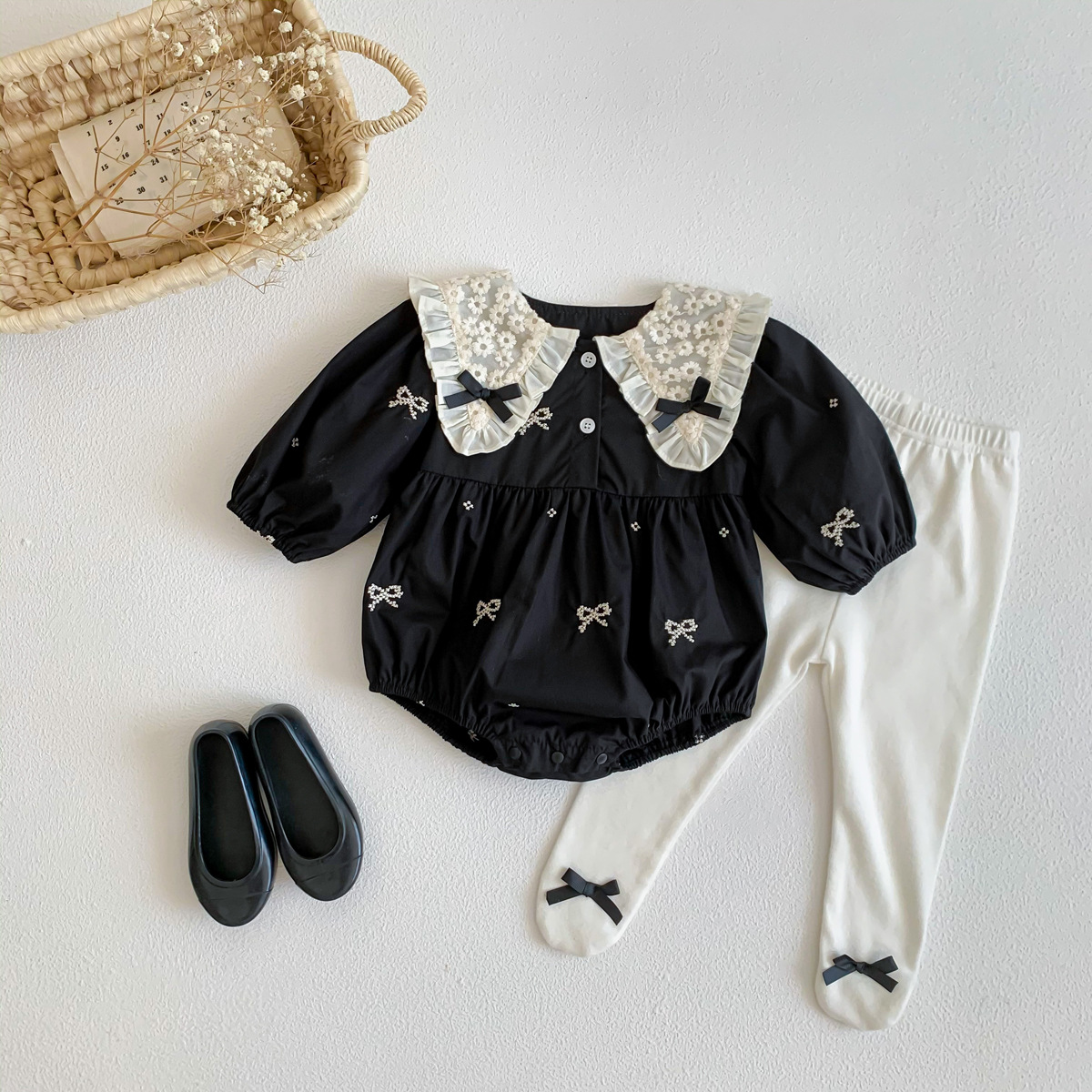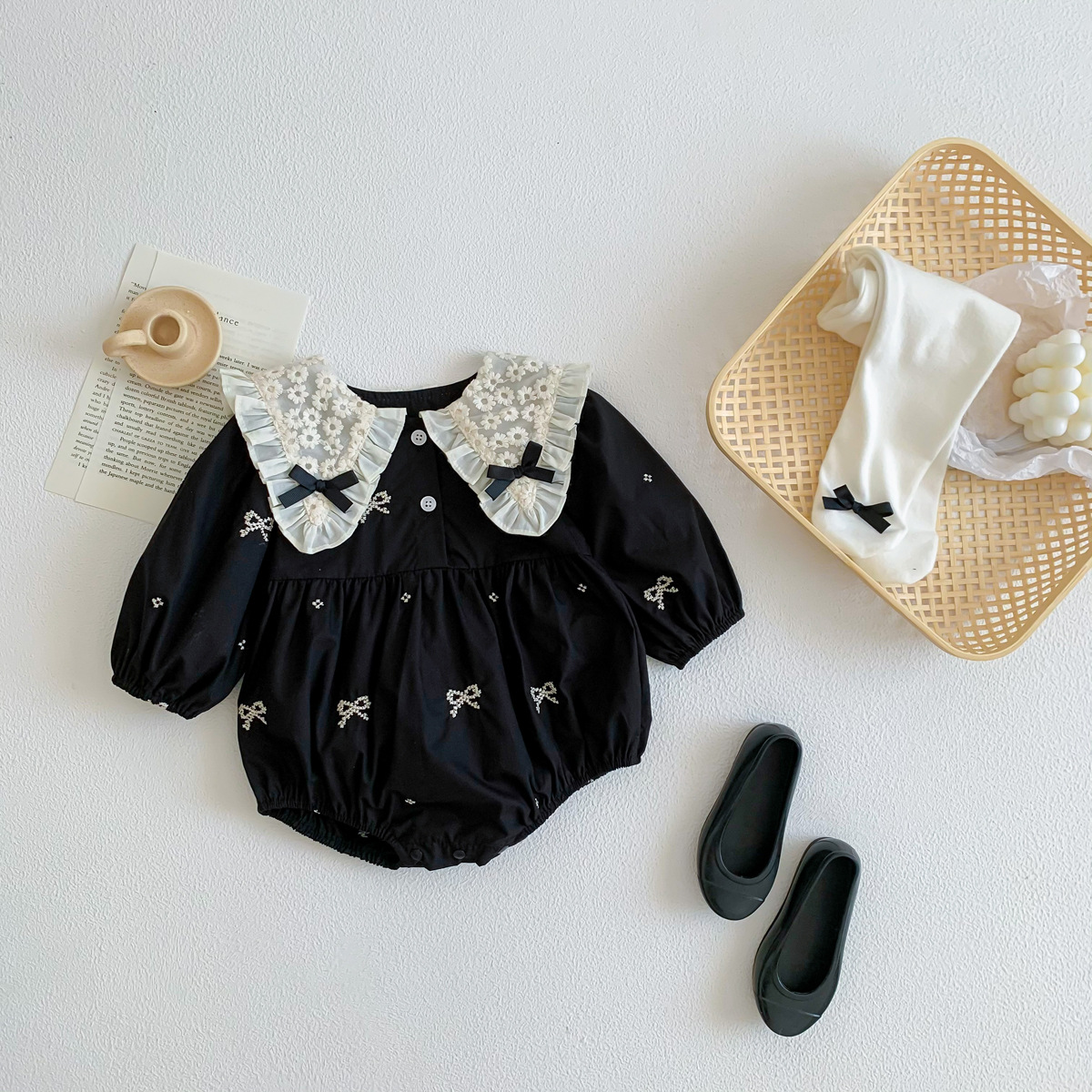 한국어 버전 가을 한국 스타일 소녀의 세련된 대형 옷깃 가방 방귀 옷 아기 아기 활 수 놓은 자매 옷 크롤링 옷