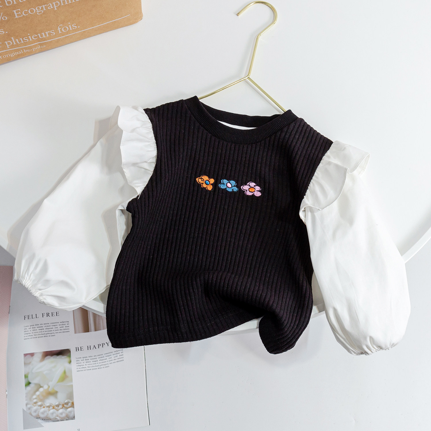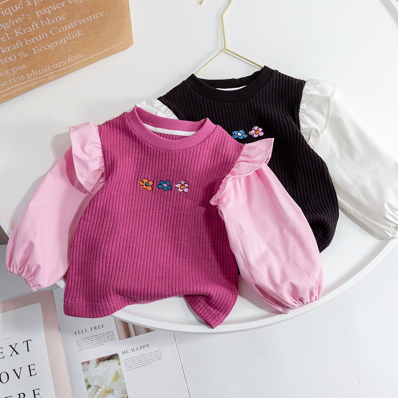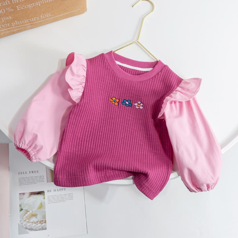 여아 가을 의류 2025 새로운 스타일의 가짜 투피스 아동복 자수 아동용 스웨트 셔츠 여아 봄, 가을 긴팔 상의와 하의 셔츠스토어 가기