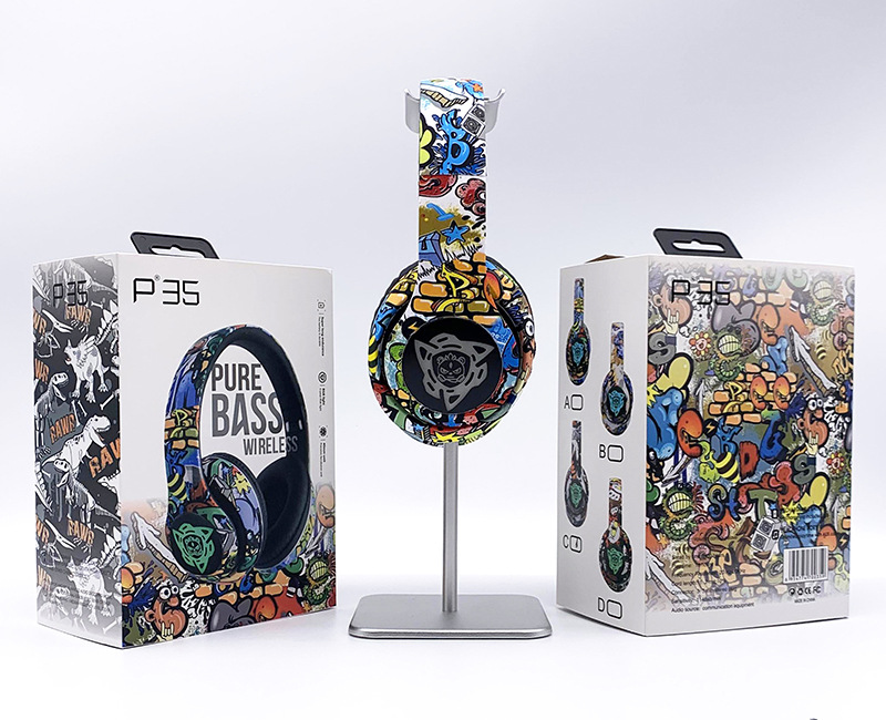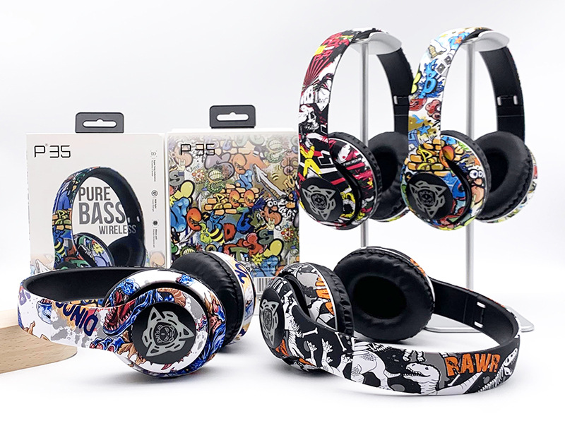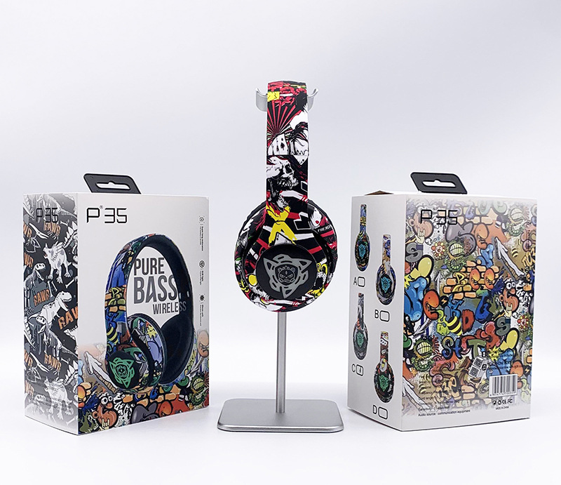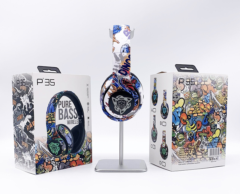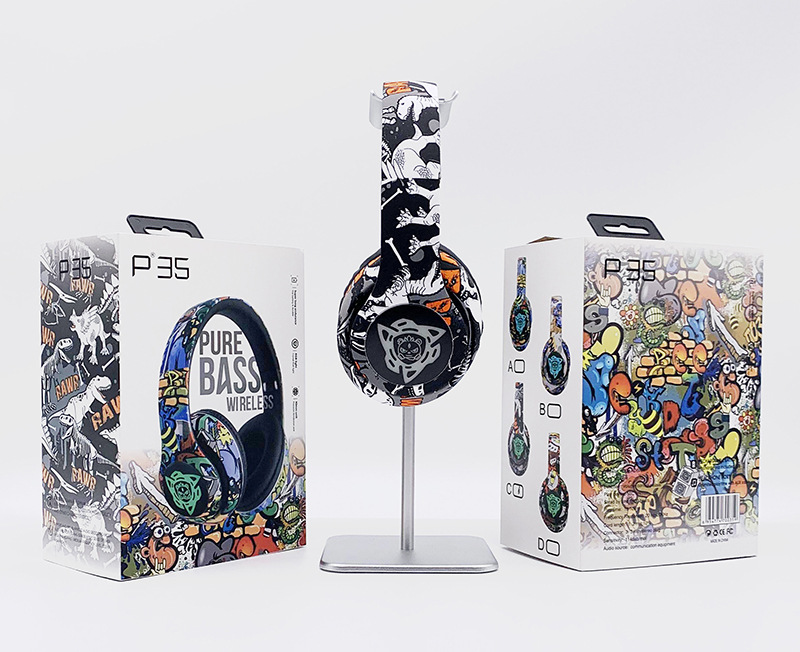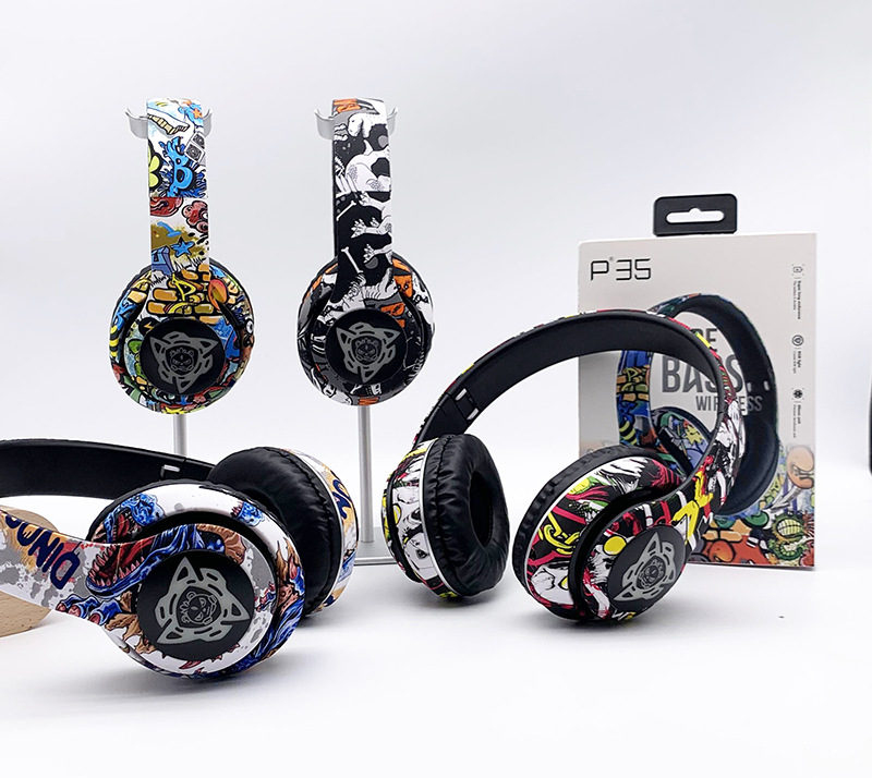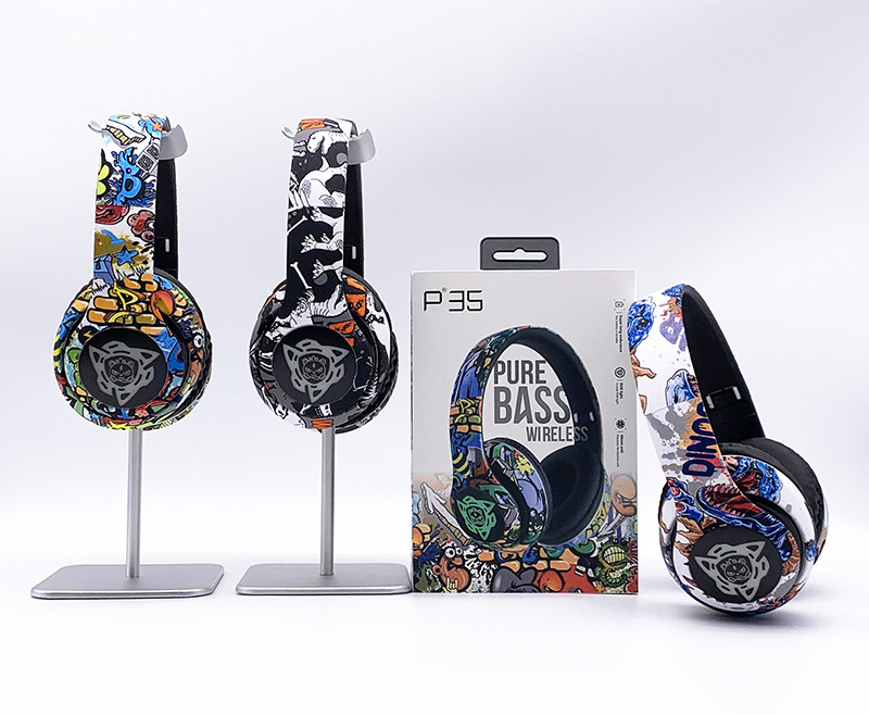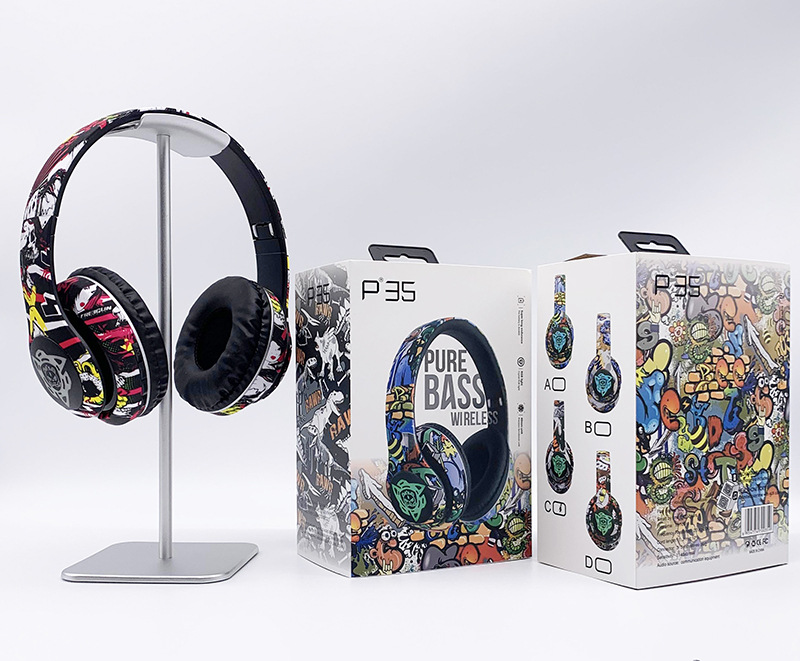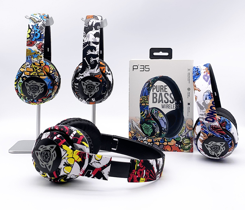 국경 간 인기 P35 국가 트렌드 낙서 헤드 장착형 Bluetooth 헤드셋 LED 발광 컬러 페인트 무선 플러그인 카드 긴 배터리 수명