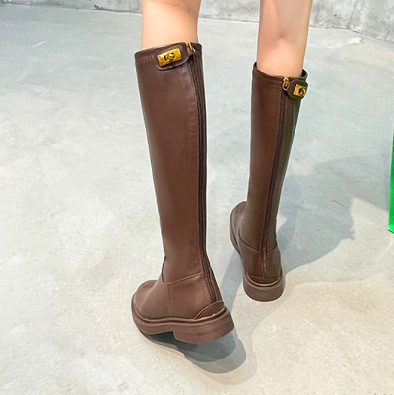 포도 새로운 스타일 메탈 버클 롱 부츠 극세사 가죽 니 하이 부츠 가을과 겨울 라운드 헤드 여성용 미드 롱 나이트 부츠