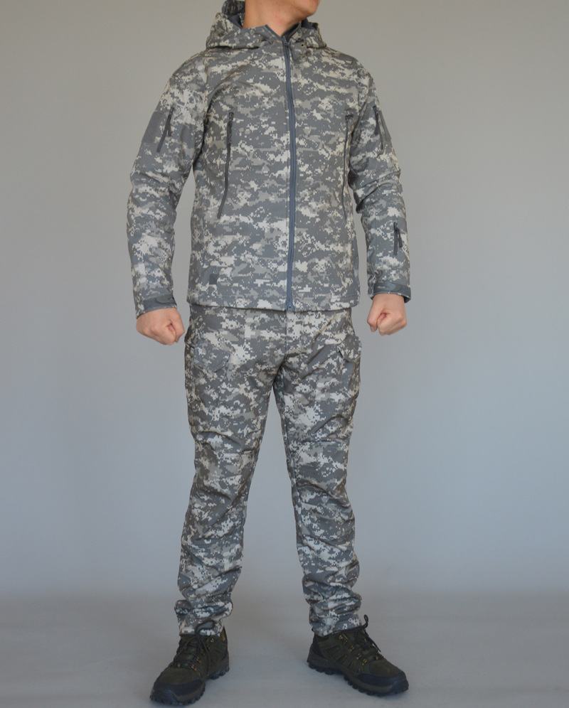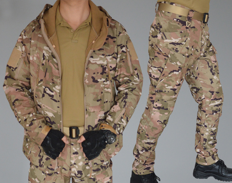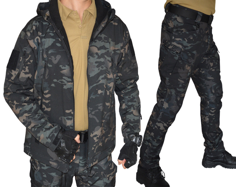 야외 상어 피부 소프트 쉘 재킷 세트 남자의 방풍 군사 팬 전술 재킷 겨울 기모 두꺼운 등산 세트