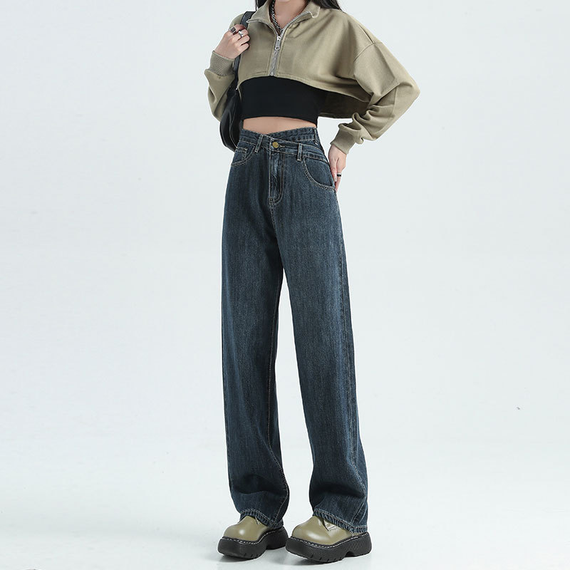 불규칙한 느슨한 스트레이트 다리 청바지 여성의 모든 경기 정사이즈 경사 버클 하이 웨이스트 슬리밍 틈새 와이드 다리 바지스토어 가기