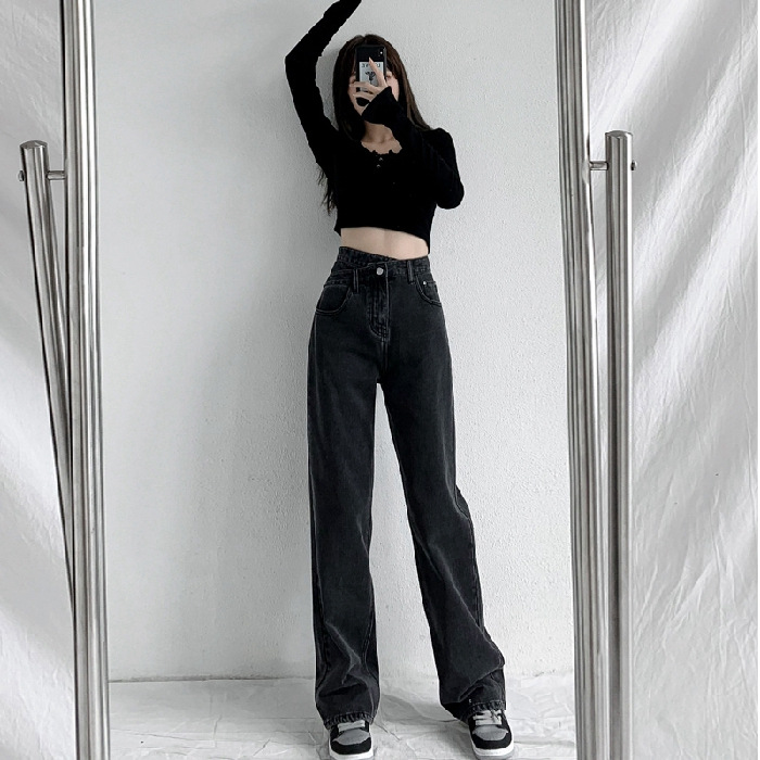 불규칙한 느슨한 스트레이트 다리 청바지 여성의 모든 경기 정사이즈 경사 버클 하이 웨이스트 슬리밍 틈새 와이드 다리 바지