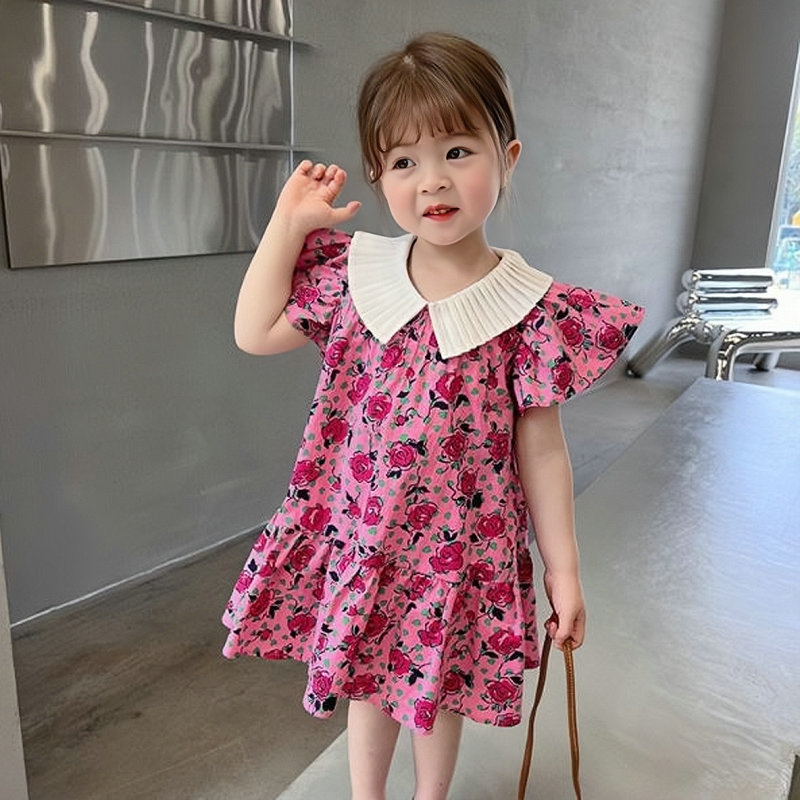 여아 스커트 구겨진 칼라 플라잉 슬리브 꽃 원피스 공주 스커트 23 여름 새로운 대외 무역 아동 의류스토어 가기