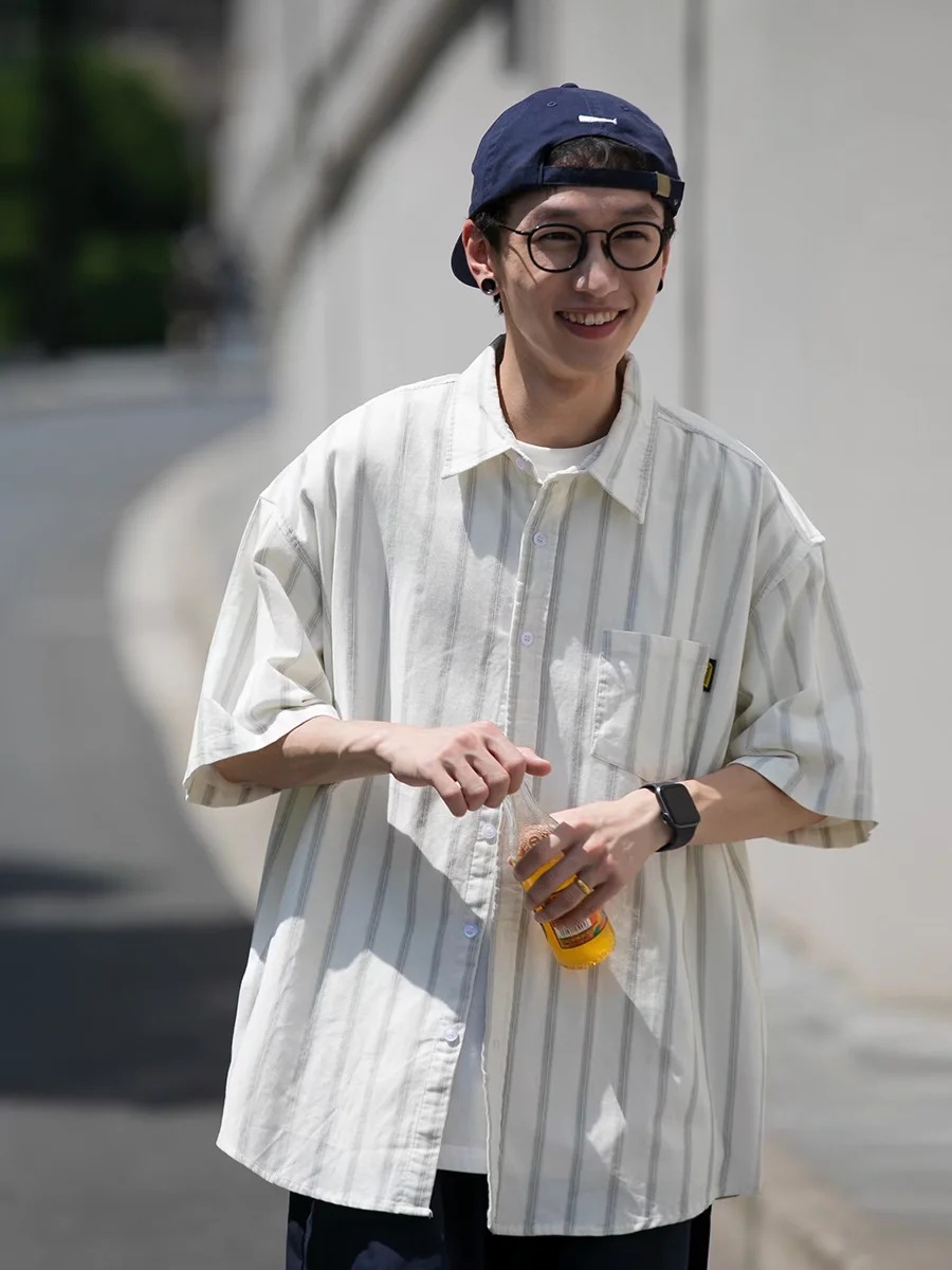 일본식 레트로 스트라이프 반팔 셔츠 남자의 여름 유행 브랜드 느슨한 모든 매치 캐주얼 커플 의류 셔츠 얇은 재킷스토어 가기