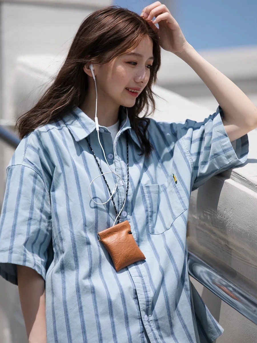 일본식 레트로 스트라이프 반팔 셔츠 남자의 여름 유행 브랜드 느슨한 모든 매치 캐주얼 커플 의류 셔츠 얇은 재킷