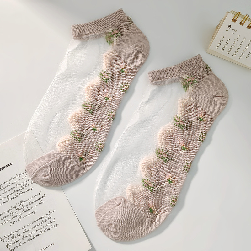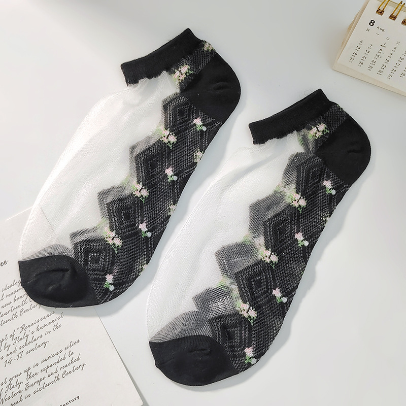 양말 여성용 여름 얇은 인터넷 연예인 유리 크리스탈 실크 면 바닥 여성용 양말 일본 꽃 울트라 씬 메쉬 통기성 양말