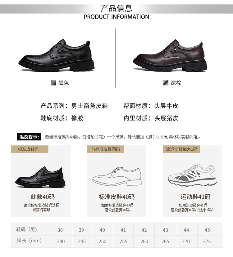 温馨提示本款为标准皮鞋码:标准皮鞋穿40码,建议本款选择40码;比运动鞋大一码,运动鞋穿41码,建议本款选40码。